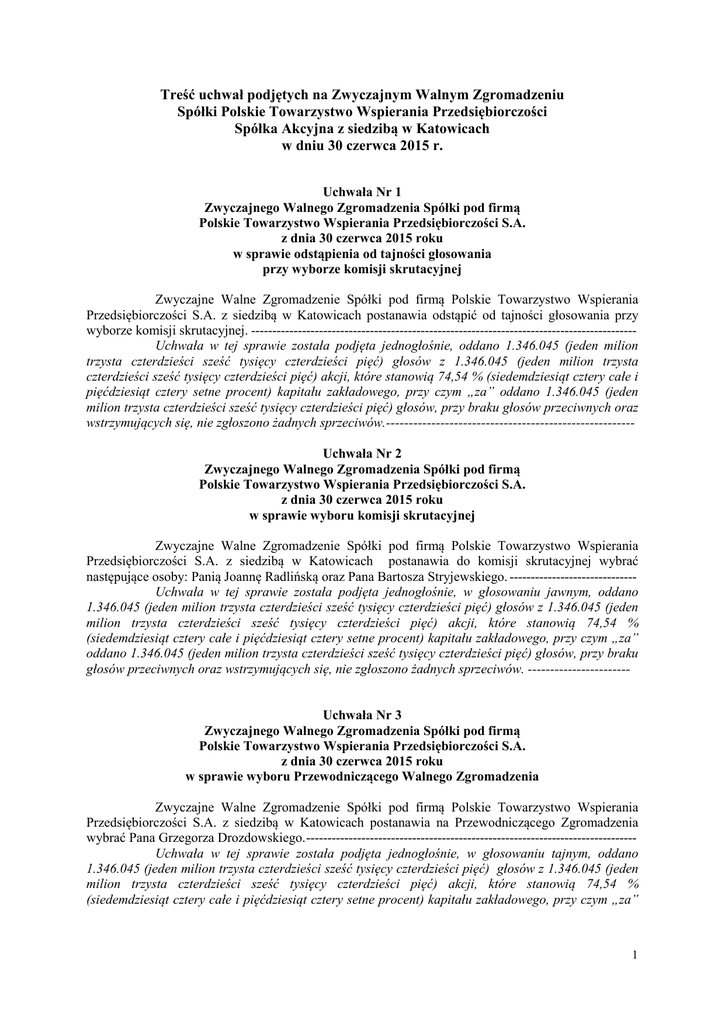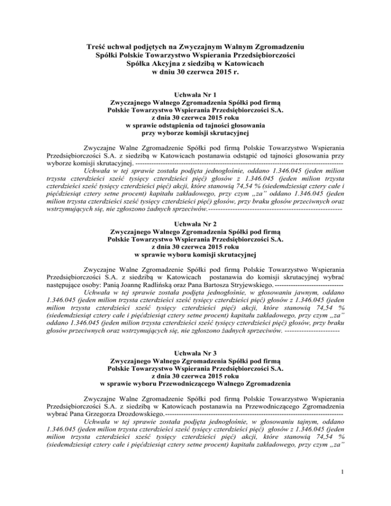 Treść uchwał podjętych na Zwyczajnym Walnym Zgromadzeniu Spółki Polskie Towarzystwo Wspierania Przedsiębiorczości Spółka Akcyjna z siedzibą w Katowicach w dniu 30 czerwca 2015 r. Uchwała Nr 1 Zwyczajnego Walnego Zgromadzenia Spółki pod firmą Polskie Towarzystwo Wspierania Przedsiębiorczości S.A. z dnia 30 czerwca 2015 roku w sprawie odstąpienia od tajności głosowania przy wyborze komisji skrutacyjnej Zwyczajne Walne Zgromadzenie Spółki pod firmą Polskie Towarzystwo Wspierania Przedsiębiorczości S.A. z siedzibą w Katowicach postanawia odstąpić od tajności głosowania przy wyborze komisji skrutacyjnej. ------------------------------------------------------------------------------------------Uchwała w tej sprawie została podjęta jednogłośnie, oddano 1.346.045 (jeden milion trzysta czterdzieści sześć tysięcy czterdzieści pięć) głosów z 1.346.045 (jeden milion trzysta czterdzieści sześć tysięcy czterdzieści pięć) akcji, które stanowią 74,54 % (siedemdziesiąt cztery całe i pięćdziesiąt cztery setne procent) kapitału zakładowego, przy czym „za” oddano 1.346.045 (jeden milion trzysta czterdzieści sześć tysięcy czterdzieści pięć) głosów, przy braku głosów przeciwnych oraz wstrzymujących się, nie zgłoszono żadnych sprzeciwów.------------------------------------------------------Uchwała Nr 2 Zwyczajnego Walnego Zgromadzenia Spółki pod firmą Polskie Towarzystwo Wspierania Przedsiębiorczości S.A. z dnia 30 czerwca 2015 roku w sprawie wyboru komisji skrutacyjnej Zwyczajne Walne Zgromadzenie Spółki pod firmą Polskie Towarzystwo Wspierania Przedsiębiorczości S.A. z siedzibą w Katowicach postanawia do komisji skrutacyjnej wybrać następujące osoby: Panią Joannę Radlińską oraz Pana Bartosza Stryjewskiego. -----------------------------Uchwała w tej sprawie została podjęta jednogłośnie, w głosowaniu jawnym, oddano 1.346.045 (jeden milion trzysta czterdzieści sześć tysięcy czterdzieści pięć) głosów z 1.346.045 (jeden milion trzysta czterdzieści sześć tysięcy czterdzieści pięć) akcji, które stanowią 74,54 % (siedemdziesiąt cztery całe i pięćdziesiąt cztery setne procent) kapitału zakładowego, przy czym „za” oddano 1.346.045 (jeden milion trzysta czterdzieści sześć tysięcy czterdzieści pięć) głosów, przy braku głosów przeciwnych oraz wstrzymujących się, nie zgłoszono żadnych sprzeciwów. ----------------------- Uchwała Nr 3 Zwyczajnego Walnego Zgromadzenia Spółki pod firmą Polskie Towarzystwo Wspierania Przedsiębiorczości S.A. z dnia 30 czerwca 2015 roku w sprawie wyboru Przewodniczącego Walnego Zgromadzenia Zwyczajne Walne Zgromadzenie Spółki pod firmą Polskie Towarzystwo Wspierania Przedsiębiorczości S.A. z siedzibą w Katowicach postanawia na Przewodniczącego Zgromadzenia wybrać Pana Grzegorza Drozdowskiego.-----------------------------------------------------------------------------Uchwała w tej sprawie została podjęta jednogłośnie, w głosowaniu tajnym, oddano 1.346.045 (jeden milion trzysta czterdzieści sześć tysięcy czterdzieści pięć) głosów z 1.346.045 (jeden milion trzysta czterdzieści sześć tysięcy czterdzieści pięć) akcji, które stanowią 74,54 % (siedemdziesiąt cztery całe i pięćdziesiąt cztery setne procent) kapitału zakładowego, przy czym „za” 1 oddano 1.346.045 (jeden milion trzysta czterdzieści sześć tysięcy czterdzieści pięć) głosów, przy braku głosów przeciwnych oraz wstrzymujących się, nie zgłoszono żadnych sprzeciwów. ------------------------ Uchwała Nr 4 Zwyczajnego Walnego Zgromadzenia Spółki pod firmą Polskie Towarzystwo Wspierania Przedsiębiorczości S.A. z dnia 30 czerwca 2015 roku w sprawie przyjęcia porządku obrad Zwyczajne Walne Zgromadzenie Spółki pod firmą Polskie Towarzystwo Wspierania Przedsiębiorczości S.A. z siedzibą w Katowicach postanawia przyjąć porządek obrad zaproponowany w ogłoszeniu o zwołaniu Walnego Zgromadzenia Spółki.--------------------------------------------------------Uchwała w tej sprawie została podjęta jednogłośnie, w głosowaniu jawnym, oddano 1.346.045 (jeden milion trzysta czterdzieści sześć tysięcy czterdzieści pięć) głosów z 1.346.045 (jeden milion trzysta czterdzieści sześć tysięcy czterdzieści pięć) akcji, które stanowią 74,54 % (siedemdziesiąt cztery całe i pięćdziesiąt cztery setne procent) kapitału zakładowego, przy czym „za” oddano 1.346.045 (jeden milion trzysta czterdzieści sześć tysięcy czterdzieści pięć) głosów, przy braku głosów przeciwnych oraz wstrzymujących się, nie zgłoszono żadnych sprzeciwów. -----------------------Uchwała Nr 5 Zwyczajnego Walnego Zgromadzenia Spółki pod firmą Polskie Towarzystwo Wspierania Przedsiębiorczości S.A. z dnia 30 czerwca 2015 roku w sprawie przyjęcia sprawozdania Rady Nadzorczej Zwyczajne Walne Zgromadzenie Spółki pod firmą Polskie Towarzystwo Wspierania Przedsiębiorczości S.A. z siedzibą w Katowicach, po uprzednim rozpatrzeniu, postanawia zatwierdzić sprawozdanie Rady Nadzorczej z oceny sprawozdania Zarządu z działalności Spółki za rok 2014, sprawozdania finansowego Spółki za rok 2014 oraz wniosków Zarządu w sprawie podziału zysku. ----Uchwała w tej sprawie została podjęta jednogłośnie, w głosowaniu jawnym, oddano 1.346.045 (jeden milion trzysta czterdzieści sześć tysięcy czterdzieści pięć) głosów z 1.346.045 (jeden milion trzysta czterdzieści sześć tysięcy czterdzieści pięć) akcji, które stanowią 74,54 % (siedemdziesiąt cztery całe i pięćdziesiąt cztery setne procent) kapitału zakładowego, przy czym „za” oddano 1.346.045 (jeden milion trzysta czterdzieści sześć tysięcy czterdzieści pięć) głosów, przy braku głosów przeciwnych oraz wstrzymujących się, nie zgłoszono żadnych sprzeciwów. -----------------------Uchwała Nr 6 Zwyczajnego Walnego Zgromadzenia Spółki
