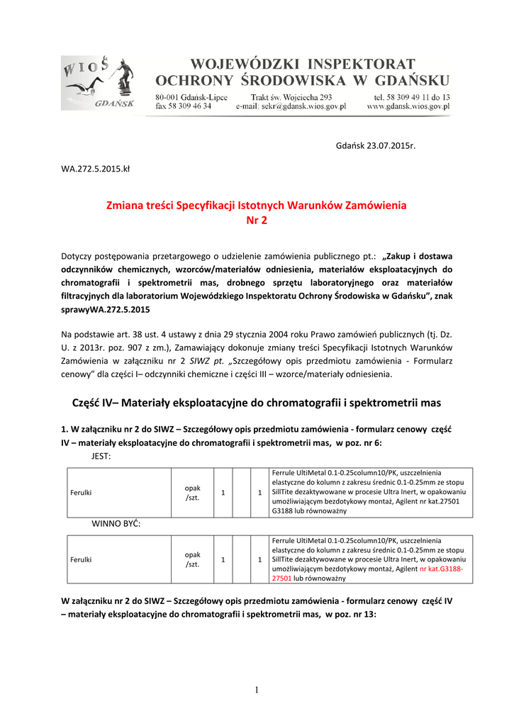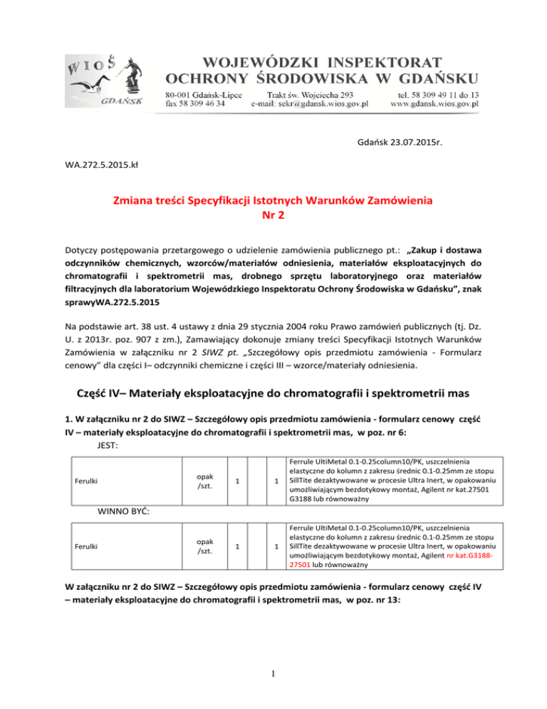 Gdańsk 23.07.2015r. WA.272.5.2015.kł Zmiana treści Specyfikacji Istotnych Warunków Zamówienia Nr 2 Dotyczy postępowania przetargowego o udzielenie zamówienia publicznego pt.: „Zakup i dostawa odczynników chemicznych, wzorców/materiałów odniesienia, materiałów eksploatacyjnych do chromatografii i spektrometrii mas, drobnego sprzętu laboratoryjnego oraz materiałów filtracyjnych dla laboratorium Wojewódzkiego Inspektoratu Ochrony Środowiska w Gdańsku”, znak sprawyWA.272.5.2015 Na podstawie art. 38 ust. 4 ustawy z dnia 29 stycznia 2004 roku Prawo zamówień publicznych (tj. Dz. U. z 2013r. poz. 907 z zm.), Zamawiający dokonuje zmiany treści Specyfikacji Istotnych Warunków Zamówienia w załączniku nr 2 SIWZ pt. „Szczegółowy opis przedmiotu zamówienia - Formularz cenowy” dla części I– odczynniki chemiczne i części III – wzorce/materiały odniesienia. Część IV– Materiały eksploatacyjne do chromatografii i spektrometrii mas 1. W załączniku nr 2 do SIWZ – Szczegółowy opis przedmiotu zamówienia - formularz cenowy część IV – materiały eksploatacyjne do chromatografii i spektrometrii mas, w poz. nr 6: JEST: opak /szt. Ferulki 1 1 Ferrule UltiMetal 0.1-0.25column10/PK, uszczelnienia elastyczne do kolumn z zakresu średnic 0.1-0.25mm ze stopu SillTite dezaktywowane w procesie Ultra Inert, w opakowaniu umożliwiającym bezdotykowy montaż, Agilent nr kat.27501 G3188 lub równoważny 1 Ferrule UltiMetal 0.1-0.25column10/PK, uszczelnienia elastyczne do kolumn z zakresu średnic 0.1-0.25mm ze stopu SillTite dezaktywowane w procesie Ultra Inert, w opakowaniu umożliwiającym bezdotykowy montaż, Agilent nr kat.G318827501 lub równoważny WINNO BYĆ: Ferulki opak /szt. 1 W załączniku nr 2 do SIWZ – Szczegółowy opis przedmiotu zamówienia - formularz cenowy część IV – materiały eksploatacyjne do chromatografii i spektrometrii mas, w poz. nr 13: 1 JEST: Fiolki chromatograficzne 2 ml bursztynowe opak /1000 szt 4 4 Certyfikowane fiolki 2ml bursztynowe z polem do opisu, wymiary (wys. x śr. x śr. szyjki) 32mm x 12mm x 9mm, w zestawie z nakrętką niebieską i septą PTFE/silikon opak /1000 szt 4 4 Certyfikowane fiolki 2ml bursztynowe z polem do opisu, wymiary (wys. x śr. x śr. szyjki) 32mm x 12mm x 9mm, w zestawie z nakrętką niebieską i septą PTFE/silikon, nr kat. 7979 WINNO BYĆ: Fiolki chromatograficzne 2 ml bursztynowe W załączniku nr 2 do SIWZ – Szczegółowy opis przedmiotu zamówienia - formularz cenowy część IV – materiały eksploatacyjne do chromatografii i spektrometrii mas, w poz. nr 14: JEST: Fiolki 2 ml bursztynowe z nakrętkami opak /100 szt 1 1 Fiolki 2ml, zakręcane, bursztynowe z polem do opisu, wymiary (wys. x śr. x śr. szyjki) 32mm x 12mm x 9mm, nakrętka zielona lub niebieska, membrana PTFE/czerwony silikon, certyfikowane, dedykowane do detektora MS, Agielent, nr kat. 7979 lub równoważny 1 Fiolki 2ml, zakręcane, bursztynowe z polem do opisu, wymiary (wys. x śr. x śr. szyjki) 32mm x 12mm x 9mm, nakrętka zielona lub niebieska, membrana PTFE/czerwony silikon, certyfikowane, dedykowane do detektora MS, Agielent, nr kat. 51190-2280 lub równoważny WINNO BYĆ: Fiolki 2 ml bursztynowe z nakrętkami opak /100 szt 1 W załączniku nr 2 do SIWZ – Szczegółowy opis przedmiotu zamówienia - formularz cenowy część IV – materiały eksploatacyjne do chromatografii i spektrometrii mas, w poz. nr 22: JEST: Liner do dozownika PTV opak /1 szt 2 2 liner typu PTV, z pojedynczym przewężeniem, deaktywowany, ID 2mm, V-200ul,Agilent nr kat. 5190-2297 lub równoważny opak /1 szt 2 2 liner typu PTV, z pojedynczym przewężeniem, deaktywowany, ID 2mm, V-200ul, Agilent nr kat. 5183-2036 lub równoważny WINNO BYĆ: Liner do dozownika PTV W załączniku nr 2 do SIWZ – Szczegółowy opis przedmiotu zamówienia - formularz cenowy część IV – materiały eksploatacyjne do chromatografii i spektrometrii mas, w poz. nr 23: JEST: Liner ULTRA INERT opak /5szt 2 2 Wkładki do dozownika pojedynczo zwężane z watą szklaną dezaktywowane (wymagana dezaktywacja waty w procesie produkcyjnym po umieszczeniu jej we wkładce), zamontowana uszczelka i opakowanie umożliwiające bezdotykowy montaż. Średnica 4mm, pojemność 900 ul;dedykowane do chromatografu Agilent Technologies model 7890A, Agilent 5183-2036 lub równoważny 2 Wkładki do dozownika pojedynczo zwężane z watą szklaną dezaktywowane (wymagana dezaktywacja waty w procesie produkcyjnym po umieszczeniu jej we wkładce), zamontowana uszczelka i opakowanie umożliwiające bezdotykowy montaż. Średnica 4mm, pojemność 900 ul;dedykowane do chromatografu Agilent Technologies model 7890A Agilent, nr kat. 5190-3163 lub równoważny WINNO BYĆ: Liner ULTRA INERT opak /5szt 2 2 W załączniku nr 2 do SIWZ – Szczegółowy opis przedmiotu zamówienia - formularz cenowy część IV – materiały eksploatacyjne do chromatografii i spektrometrii mas, w poz. nr 23: JEST: Liner ULTRA INERT opak /5szt 2 2 Wkładki do dozownika pojedynczo zwężane z watą szklaną dezaktywowane (wymagana dezaktywacja waty w procesie produkcyjnym po umieszczeniu jej we wkładce), zamontowana uszczelka i opakowanie umożliwiające bezdotykowy montaż. Średnica 4mm, pojemność 900 ul;dedykowane do chromatografu Agilent Technologies model 7890A, Agilent 5183-2036 lub równoważny 2 Wkładki do dozownika pojedynczo zwężane z watą szklaną dezaktywowane (wymagana dezaktywacja waty w procesie produkcyjnym po umieszczeniu jej we wkładce), zamontowana uszczelka i opakowanie umożliwiające bezdotykowy montaż. Średnica 4mm, pojemność 900 ul;dedykowane do chromatografu Agilent Technologies model 7890A Agilent, nr kat. 5190-3163 lub równoważny WINNO BYĆ: Liner ULTRA INERT opak /5szt 2 W załączniku nr 2 do SIWZ – Szczegółowy opis przedmiotu zamówienia - formularz cenowy część IV – materiały eksploatacyjne do chromatografii i spektrometrii mas, w poz. nr 26: JEST: Nakrętka w