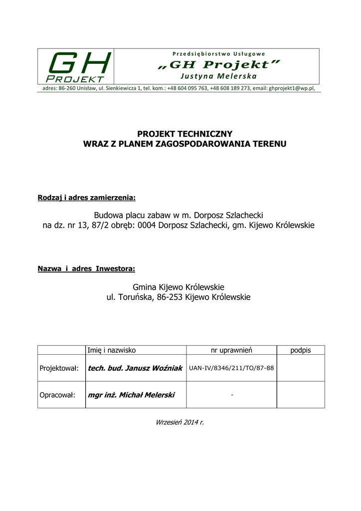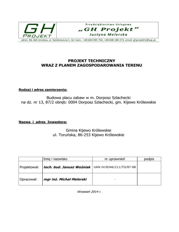 Przedsiębiorstwo Usługowe „GH Projekt” Justyna Melerska adres: 86-260 Unisław, ul. Sienkiewicza 1, tel. kom.: +48 604 095 763, +48 608 189 273, email: [email protected], PROJEKT TECHNICZNY WRAZ Z PLANEM ZAGOSPODAROWANIA TERENU Rodzaj i adres zamierzenia: Budowa placu zabaw w m. Dorposz Szlachecki na dz. nr 13, 87/2 obręb: 0004 Dorposz Szlachecki, gm. Kijewo Królewskie Nazwa i adres Inwestora: Gmina Kijewo Królewskie ul. Toruńska, 86-253 Kijewo Królewskie Imię i nazwisko nr uprawnień Projektował: tech. bud. Janusz Woźniak Opracował: mgr inż. Michał Melerski UAN-IV/8346/211/TO/87-88 Wrzesień 2014 r. - podpis Chełmno, 23.09.2014 OŚWIADCZENIE Na podstawie art. 20, ust. 4 – ustawy Prawo budowlane ( Dz. U. 2013, poz. 1409 – z późniejszymi zmianami) oświadczam, że projekt budowlany budowy placu zabaw w miejscowości Dorposz Szlachecki, dz. 13, 87/2 został sporządzony zgodnie z obowiązującymi przepisami oraz zasadami wiedzy technicznej. OPIS TECHNICZNY 1. Stan istniejący Przedmiotowe działki nr 13, 87/2 zlokalizowana jest w miejscowości Dorposz Szlachecki. Teren znajduje się park wraz ze zbiornikiem wodnym. Działka posiada dostęp do drogi publicznej – droga gminna dz. nr 126/1. Na sąsiednich działka zlokalizowana jest zabudowa jednorodzinna, siedliskowa oraz tereny rolnicza, w sąsiedztwie granicy. Przedmiotowy teren objęty jest ochroną konserwatorską. Miejsce na którym zlokalizowany plac zabaw zostało uzgodnione z Wojewódzkim Konserwatorem Zabytków, w przeszłości w tym miejscu mieścił się stary plac zabaw obecnie pozostały jeszcze zniszczone wyłączone z użytkowania urządzenia, teren zarośnięty chwastami nieużytkowana, porośnięty pojedynczymi drzewami liściastymi i iglastymi oraz krzewami. Planowane rozmieszczenie urządzeń nie naruszy istniejącego drzewostanu. 2. Stan docelowy Na działce nr 13, 87/2 planowana jest budowa placu zabaw, który zostanie wyposażony w następujące urządzenia: 1. zestaw zabawowy ze zjeżdżalnią i przeplotnią – 1 szt., 2. huśtawka łańcuchowa podwójna – 1 szt., 3. karuzela ramienna – 1 szt., 4. huśtawka wagowa – 1 szt., 5. sprężynowiec typ płaski – 1 szt., 6. sprężynowiec typ przestrzenny – 1 szt., 7. tablica z regulaminem placu zabaw – 1 szt., 8. ławka z oparciem – 1 szt., 9. kosz na śmieci – 1 szt. W ramach urządzenia terenu wykonane zostaną strefy bezpieczeństwa wypełnione piaskiem zgodnie z wytycznymi producenta i PN. Rozmieszczenie urządzeń zgodnie z załączonym Planem Zagospodarowania Terenu (PZT). Dodatkowo w celu oddzielenia placu zabaw od zbiornika wodnego planowane jest wykonanie drewnianego ogrodzenia sztachetowego wys. do 1,0m. Od strony drogi gminnej na odcinku około 60m zostanie wymienione istniejące ogrodzenie oraz furtka z uwagi na zły stan techniczny, ogrodzenie wykonane jak poprzednio z siatki plecionej ocynkowanej montowanej na słupkach stalowych ocynkowanych, furtka szer. w świetle 1,0m wykonana z profili stalowych i wypełniona panelem. 3. Charakterystyka poszczególnych urządzeń 1) Zestaw zabawowy ze zjeżdżalnią składający się: z drewnianego podestu i wieżyczki, pomostu zjeżdżalni metalowej wykonanej ze stali k.o., elementu wspinaczkowego typu przeplotnia linowa – 1 szt., wymiary 7,0x4,0m, tolerancja wymiarowa +/-10%, . Rysunek 1: zestaw zabawowy ze zjeżdżalnią i przeplotnią Zdjęcie pochodzi ze strony internetowej www.nowak-meble.pl i ma charakter wyłącznie poglądowy 2) Huśtawka łańcuchowa podwójna z belką drewnianą lub metalową pod zawiesia, wyposażona w zawiesia łańcuchowe z siedziskiem płaskim oraz z siedziskiem kubełkowym zapinanym – po 1 szt., wymiary 3,30x2,0m tolerancja wymiarowa +/-10%,. Rysunek 2: huśtawka łańcuchowa podwójna Zdjęcie pochodzi ze strony internetowej www.nowak-meble.pl i ma charakter wyłącznie poglądowy 3) Karuzela trzy- lub czteroramienna na konstrukcji stalowej, siedziska z płyty HDPE zapinane – 1 szt., średnica 1,7m tolerancja wymiarowa +/-10%,. Rysunek 3 i 4: karuzela trzy- i czteroramienna Zdjęcia pochodzą ze strony internetowej www.nowak-meble.pl i mają charakter wyłącznie poglądowy 4) Huśtawka wagowa na podstawie drewnianej, belka drewniana długość 3,0m, max. wys. 1,0m, tolerancja wymiarowa +/-10%, siedziska płaskie ze sklejki lub płyty HDPE. Huśtawka zabezpieczona elementami absorbującymi uderzenie końca belki o podłoże np. odbojnik lub opona częściowo wkopana w podłoże – 1 szt., Rysunek 5: huśtawka wagowa Zdjęcie pochodzi ze strony internetowej www.nowak-meble.pl i ma charakter wyłącznie poglądowy 5) Sprężynowiec jednoosobowy typ płaski różne rodzaje (np. skuter i piesek), wykonany z płyty HDPE, na stalowej sprężynie i prefabrykowanej stopie betonowe – 1 szt., Rysunek 6: sprężynowiec typ płaski Zdjęcie pochodzi ze strony internetowej www.nowak-meble.pl i ma charakter wyłącznie poglądowy 6) Sprężynowiec jednoosobowy typ przestrzenny różne rodzaje (np. samochód, samolot), wykonany ze sklejki wodoodpornej lub płyty HDPE, na stalowej sprężynie i prefabrykowanej stopie betonowe – 1 szt., wymiary zgodnie z kartą techniczną, Rysunek 7: sprężynowiec typ przestrzenny Zdjęcie pochodzi ze strony internetowej www.nowak-meble.pl i ma charakter wyłącznie poglądowy 7) Tablica informacyjne montowana na dwóch słupkach zwieńczona daszkiem jedno lub dwuspadowym, wykończenie sklejka wodoodporna – 1 szt. Tablica powinna zawierać regulamin placu zabaw, nr telefonów alarmowych, nazwę i adres Zarządcy i nr tel. pod który należy zgłaszać zauważone nieprawidłowości – treść do uzgodnienia z Zamawiającym. Rysunek 8: tablica z regulaminem placu zabaw Zdjęcie pochodzi ze strony internetowej www.nowak-meble.pl i ma charakter wyłącznie poglądowy 8) Kosz na śmieci metalowy – 1 szt. Rysunek 9: kosz na śmieci Zdjęcie pochodzi ze strony internetowej www.nowak-meble.pl i ma charakter wyłącznie po