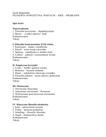 Jacek Migasiński FILOZOFIA NOWOŻYTNA. POSTACIE – IDEE – PROBLEMY Spis treści Wprowadzenie 1. Filozofia nowożytna – charakterystyka 2. Bacon – „wielka odnowa” nauk Podsumowanie Teksty I. Filozofia kontynentalna XVII wieku 1. Kartezjusz – nauka i metafizyka 2. Pascal – nowa wizja człowieka 3. Spinoza – metafizyka w służbie etyki 4. Leibniz – jedność i różnorodność świata Podsumowanie Teksty II. Empiryzm brytyjski 1. Locke – źródła i granice wiedzy 2. Berkeley – kryteria istnienia 3. Hume – radykalizm zdrowego rozsądku 4. Filozofia polityki – teorie umowy społecznej Podsumowanie Teksty III. Oświecenie 1. Oświecenie francuskie 2. Antynomie oświecenia – Rousseau 3. Wykraczanie poza horyzont oświecenia Podsumowanie Teksty IV. Klasyczna filozofia niemiecka 1. Kant – uprawnienia rozumu 2. Fichte – apoteoza podmiotu 3. Schelling – filozofia Absolutu 4. Hegel – metamorfozy ducha Podsumowanie Teksty V. Filozofia po Heglu – nowe perspektywy 1. Marks – materialistyczne pojmowanie dziejów 2. Schopenhauer – bezsens istnienia 3. Kierkegaard – filozofia przeciw filozofii Podsumowanie Teksty VI. Pozytywizm 1. Comte – dziejowa misja nauki 2. Mill – pozytywizm liberalny 3. Spencer – wszechogarniająca synteza wiedzy Podsumowanie Teksty