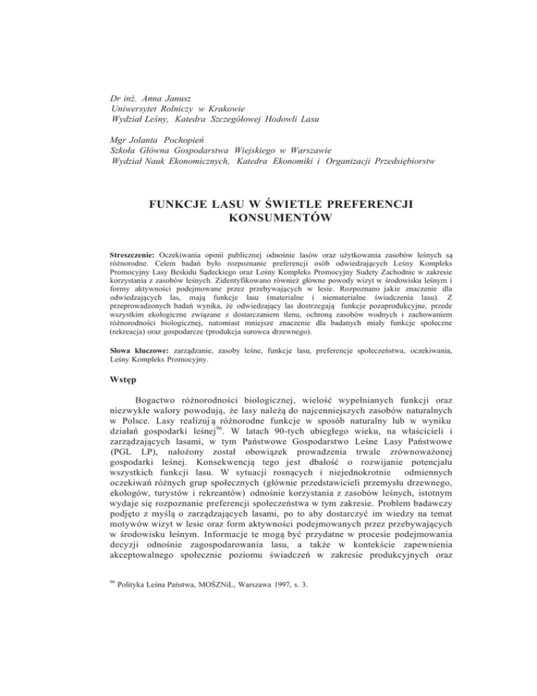 Dr inż. Anna Janusz Uniwersytet Rolniczy w Krakowie Wydział Leśny, Katedra Szczegółowej Hodowli Lasu Mgr Jolanta Pochopień Szkoła Główna Gospodarstwa Wiejskiego w Warszawie Wydział Nauk Ekonomicznych, Katedra Ekonomiki i Organizacji Przedsiębiorstw FUNKCJE LASU W ŚWIETLE PREFERENCJI KONSUMENTÓW Streszczenie: Oczekiwania opinii publicznej odnośnie lasów oraz użytkowania zasobów leśnych są różnorodne. Celem badań było rozpoznanie preferencji osób odwiedzających Leśny Kompleks Promocyjny Lasy Beskidu Sądeckiego oraz Leśny Kompleks Promocyjny Sudety Zachodnie w zakresie korzystania z zasobów leśnych. Zidentyfikowano również główne powody wizyt w środowisku leśnym i formy aktywności podejmowane przez przebywających w lesie. Rozpoznano jakie znaczenie dla odwiedzających las, mają funkcje lasu (materialne i niematerialne świadczenia lasu). Z przeprowadzonych badań wynika, że odwiedzający las dostrzegają funkcje pozaprodukcyjne, przede wszystkim ekologiczne związane z dostarczaniem tlenu, ochroną zasobów wodnych i zachowaniem różnorodności biologicznej, natomiast mniejsze znaczenie dla badanych miały funkcje społeczne (rekreacja) oraz gospodarcze (produkcja surowca drzewnego). Słowa kluczowe: zarządzanie, zasoby leśne, funkcje lasu, preferencje społeczeństwa, oczekiwania, Leśny Kompleks Promocyjny. Wstęp Bogactwo różnorodności biologicznej, wielość wypełnianych funkcji oraz niezwykłe walory powodują, że lasy należą do najcenniejszych zasobów naturalnych w Polsce. Lasy realizuj ą różnorodne funkcje w sposób naturalny lub w wyniku działań gospodarki leśnej96. W latach 90-tych ubiegłego wieku, na właścicieli i zarządzających lasami, w tym Państwowe Gospodarstwo Leśne Lasy Państwowe (PGL LP), nałożony został obowiązek prowadzenia trwale zrównoważonej gospodarki leśnej. Konsekwencją tego jest dbałość o rozwijanie potencjału wszystkich funkcji lasu. W sytuacji rosnących i niejednokrotnie odmiennych oczekiwań różnych grup społecznych (głównie przedstawicieli przemysłu drzewnego, ekologów, turystów i rekreantów) odnośnie korzystania z zasobów leśnych, istotnym wydaje się rozpoznanie preferencji społeczeństwa w tym zakresie. Problem badawczy podjęto z myślą o zarządzających lasami, po to aby dostarczyć im wiedzy na temat motywów wizyt w lesie oraz form aktywności podejmowanych przez przebywających w środowisku leśnym. Informacje te mogą być przydatne w procesie podejmowania decyzji odnośnie zagospodarowania lasu, a także w kontekście zapewnienia akceptowalnego społecznie poziomu świadczeń w zakresie produkcyjnych oraz 96 Polityka Leśna Państwa, MOŚZNiL, Warszawa 1997, s. 3. pozaprodukcyjnych funkcji lasu. Warto dodać, że realizacja funkcji pozaprodukcyjnych ogranicza przede wszystkim funkcje produkcyjne (surowcowe), a wzrastające zapotrzebowanie na ekologiczne i społeczne (pozaprodukcyjne) funkcje lasu, wymaga odpowiedniego przysposobienia lasu do zwiększania ilości oraz polepszenia jakości dóbr97. Tego typu działania generuj ą dodatkowe koszty w jednostkach organizacyjnych PGL LP. Lasy Państwowe podejmując działania, które mają na celu wzmaganie potencjału społecznych i ekologicznych funkcji lasu, inicjują czynności zmierzające do przystosowania terenów leśnych do rekreacji, jednocześnie otaczając troską tereny szczególnie cenne pod względem przyrodniczym. Do aktywności Państwowego Gospodarstwa Leśnego Lasy Państwowe na tej płaszczyźnie należy zaliczyć: zagospodarowanie turystyczne lasów, a także podporządkowanie zasad gospodarki leśnej celom rekreacji w kompleksach leśnych, szczególnie w sąsiedztwie dużych miast, uzdrowisk oraz obszarów, przez które przebiegają szlaki turystyczne o wysokich walorach krajobrazowych i przyrodniczych. Jednakże, aby stworzyć produkt turystyczny realizuj ący potrzebę wypoczynku turystów w lesie, należy przede wszystkim rozpoznać i opisać wszelkie walory przyrodnicze i kulturalne obszarów leśnych, a także poznać preferencje turystów dotyczące wypoczynku i rekreacji w lasach98. 1. Cel badań Podstawowym celem badań było pozyskanie informacji na temat preferencji społeczeństwa, w szczególności wśród osób odwiedzających Leśny Kompleks Promocyjny (LKP) Lasy Beskidu Sądeckiego i Leśny Kompleks Promocyjny Sudety Zachodnie, w zakresie użytkowania i korzystania z zasobów leśnych. Uzyskana wiedza ułatwi Służbie Leśnej podejmowanie decyzji w zakresie zagospodarowania turystycznego oraz wyznaczania w środowisku leśnym miejsc do wypoczynku. Badania miały na celu rozpoznanie ogólnych preferencji społeczeństwa odnośnie korzystania z lasu, w kontekście realizowanych przez środowisko leśne różnorodnych funkcji, a w szczególności: (1) identyfikację głównych motywów wizyt w środowisku leśnym oraz ich częstotliwości (2) rozpoznania form aktywności podejmowanej w środowisku leśnym (3) ocenę znaczenia różnych funkcji lasu, w tym drewna jako produktu gospodarki leśnej (4) ocenę przydatności i zasadność rozbudowy infrastruktury turystycznej w lesie. Dokonano również ewaluacji LKP Lasy Beskidu Sądeckiego oraz LKP Sudety Zachodnie pod kątem zagospodarowania i stanu lasu oraz przystosowania do rekreacji. 2. Metodyka badań Podstawowym źródłem informacji były dane pierwotne, które pozyskano w wyniku badań terenowych. Badania przeprowadzono metodą wywiadu 97 T. Marszałek, Klasyfikacja lasów państwowego gospodarstwa leśnego według rodzajów funkcji wiodących, Sylwan 1993, Nr 3, s. 37-44. 98 A. Mandziuk, K. Janeczko, Turystyczne i rekreacyjne funkcje lasu w aspekcie marketingowym. [w:] D. Anderwald, E. Janeczko, K. Janeczko, L. Chojnacka-Ożga, W. Ożga, A. Rutkiewicz, J. Skłodowski (red.). Turystyka w lasach i na obszarach przyrodniczo cennych. Stud. i Mat. CEPL, Rogów 2009, Nr. 4 (23), s. 65-71. kwestionariuszowego, w której ankieter ko