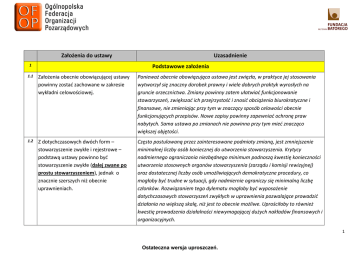 Założenia do ustawy 1 Uzasadnienie Podstawowe założenia 1.1 Założenia obecnie obowiązującej ustawy powinny zostać zachowane w zakresie wykładni celowościowej. Ponieważ obecnie obowiązująca ustawa jest zwięzła, w praktyce jej stosowania wytworzył się znaczny dorobek prawny i wiele dobrych praktyk wyrosłych na gruncie orzecznictwa. Zmiany powinny zatem ułatwiać funkcjonowanie stowarzyszeń, zwiększać ich przejrzystość i znosić obciążenia biurokratyczne i finansowe, nie zmieniając przy tym w znaczący sposób celowości obecnie funkcjonujących przepisów. Nowe zapisy powinny zapewniać ochronę praw nabytych. Sama ustawa po zmianach nie powinna przy tym mieć znacząco większej objętości. 1.2 Z dotychczasowych dwóch form – stowarzyszenie zwykłe i rejestrowe – podstawą ustawy powinno być stowarzyszenie zwykłe (dalej zwane po prostu stowarzyszeniem), jednak o znacznie szerszych niż obecnie uprawnieniach. Często postulowaną przez zainteresowane podmioty zmianą, jest zmniejszenie minimalnej liczby osób koniecznej do utworzenia stowarzyszenia. Krytycy nadmiernego ograniczania niezbędnego minimum podnoszą kwestię konieczności utworzenia stosownych organów stowarzyszenia (zarządu i komisji rewizyjnej) oraz dostatecznej liczby osób umożliwiających demokratyczne procedury, co mogłoby być trudne w sytuacji, gdy nadmiernie ograniczy się minimalną liczbę członków. Rozwiązaniem tego dylematu mogłoby być wyposażenie dotychczasowych stowarzyszeń zwykłych w uprawnienia pozwalające prowadzić działania na większą skalę, niż jest to obecnie możliwe. Uprościłoby to również kwestię prowadzenia działalności niewymagającej dużych nakładów finansowych i organizacyjnych. 1 Ostateczna wersja uproszczeń. 1.3 Forma stowarzyszenia rejestrowego powinna być stosowana w sytuacjach wymagających posiadania osobowości prawnej. 1.4 Przepisy ustawy Prawo o stowarzyszeniach Istotne jest, aby każdy mógł na podstawie przepisów Prawa o stowarzyszeniach powinny być proste, zrozumiałe i stanowić zrozumieć, jak zakłada się i jak działa stowarzyszenie – jako model, bez możliwie zamkniętą całość. konieczności odwoływania się do przepisów odrębnych. Istotnym elementem ustawy jest preambuła, która określa podstawową ideę Prawa o stowarzyszeniach. 2 Uproszczenia w rejestracji 2.1 1 Specjalną formą stowarzyszeń mają być stowarzyszenia rejestrowe. Ich rejestracja będącą suwerenną decyzją samej organizacji mogłaby być próbą: ● zwiększenia zaufania do działań organizacji (w sytuacji gdy pełni funkcję instytucji zaufania publicznego1, chociażby sprawujących opiekę nad dziećmi lub osobami niepełnosprawnymi. ● określenia reprezentatywności zarówno w obszarze prowadzenia działalności lobbingowej – jako lobbysta zawodowy i niezawodowy w rozumieniu odrębnych przepisów – oraz występowaniu w imieniu grup społecznych – np. udział w ciałach dialogu obywatelskiego, w postępowaniu administracyjnym i sądowym. ● tworzenia skomplikowanych struktur wewnętrznych w organizacjach masowego członkostwa (np. oddziały), ● prowadzenia działalności gospodarczej. Rejestracja stowarzyszeń powinna opierać Rejestracja działalności społecznej nie powinna być bardziej skomplikowana niż Należy rozważyć też czy konieczne jest rozróżnienie instytucji zaufania publicznego od organizacji pożytku publicznego. 2 Ostateczna wersja uproszczeń. się na zasadzie zgłaszania działalności do organu administracji publicznej. Zgłoszenie powinno się dokonywać na najniższym szczeblu (gmina, starostwo), jednak powinien zostać stworzony centralny rejestr stowarzyszeń. rejestracja działalności gospodarczej czy też stowarzyszeń sportowych. Działalność stowarzyszenia opierać się ma na podstawie regulaminu, który jednak musi określać zasady działania stowarzyszenia. Proponuje się możliwość dokonania zgłaszania przez internet. 2.2 Rejestracja stowarzyszeń rejestrowych w oparciu o uproszczony formularz, stwierdzenie przez sąd zgodności zapisów statutu z prawem. Uproszczenie to spowodowałoby zmniejszenie obciążeń biurokratycznych przedłużających i komplikujących rejestrację. Proponuje się zastąpienie formularzy przesyłanych pocztą ankietą online, która zawierałaby pytania / pola konieczne do uzyskania niezbędnych informacji o zakładanym podmiocie i jego strukturze. 2.3 Zmniejszenie minimalnej liczby osób koniecznej do utworzenia stowarzyszenia rejestrowego do liczby 9. W ocenie środowiska stowarzyszeń minimalna liczba 15 osób wymaganych do założenia stowarzyszenia rejestrowego ogranicza swobodę tworzenia stowarzyszeń m.in. z uwagi na zmniejszającą się skłonność do długofalowego zaangażowania się w działalność społeczną. Z drugiej strony, należy wziąć pod uwagę głosy, które podkreślają funkcję stowarzyszeń jako podmiotów reprezentujących zorganizowane grupy, posiadające pewne społeczne zaplecze, posiadające wybieralną władzę i ciała kontroli wewnętrznej. 2.4 Pozostawienie możliwości dowolnego kształtowania struktury stowarzyszenia (statut jako konstytucja) przy jednoczesnej konieczności określenia w statucie trzech Obligatoryjność określenia ról poszczególnych konkretnych organów nie oznacza konieczności powoływania konkretnych organów. W statucie (regulaminie) konieczne jest jedynie określenie układu systemu władz stowarzyszenia z jasnym określeniem, kto pełni jakie funkcji. W mniejszych stowarzyszeniach rejestrowych 3 Ostateczna wersja uproszczeń. form: możliwe byłoby np. istnienie jedynie zarządu, któremu cele strategiczne ● bieżącego zarządzania – np. zarząd, wyznaczałoby walne zebranie, będące jednocześnie instytucją kontroli wewnętrznej. ● zarządzania strategicznego (governance) – np. rada programowa, ● kontroli wewnętrznej – np. komisja rewizyjna. 2 2.5 Zniesienie wymo