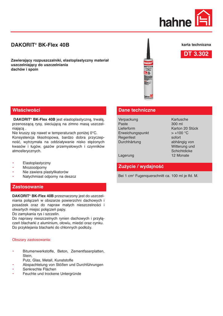 DAKORIT® BK-Flex 40B karta techniczna DT 3.302 Zawierający rozpuszczalniki, elastoplastyczny materiał uszczelniający do uszczelniania dachów i spoin Właściwości Dane techniczne DAKORIT® BK-Flex 40B jest elastoplastyczną, trwałą, przenoszącą rysy, sieciującą na zimno masą uszczelniającą . Nie kruszy się nawet w temperaturach poniżej 0°C. Konsystencja tiksotropowa, bardzo dobra przyczepność, wytrzymała na oddziaływanie nisko stężonych kwasów i ługów, gazów przemysłowych i czynników atmosferycznych. Verpackung Paste Lieferform Erweichungspunkt Regenfest Durchhärtung Lagerung • • • • Elastoplastyczny Mrozoodporny Nie zawiera plastyfikatorów Natychmiast odporny na deszcz Zastosowanie DAKORIT® BK-Flex 40B przeznaczony jest do uszczelniania połączeń w obszarze powierzchni dachowych i posadzek oraz do napraw małych nieszczelności i otwartych miejsc połączeń papy. Do zamykania rys i szczelin. Do naprawy nieszczelnych rynien dachowych i przyłączeń blacharki z aluminium, ołowiu, miedzi oraz cynku. Do przyklejania blacharki do chłonnych podłoży. Obszary zastosowania: • • • • Bitumenwerkstoffe, Beton, Zementfaserplatten, Stein, Putz, Glas, Metall, Kunststoffe Abspachtelung von Stößen und Durchführungen Senkrechte Flächen Feuchte und trockene Untergründe Kartusche 300 ml Karton 20 Stück > +100 °C sofort abhängig von Witterung und Schichtdicke 12 Monate Zużycie / wydajność Bei 1 cm3 Fugenquerschnitt ca. 100 ml je lfd. M. Przygotowanie podłoża Usuwanie odpadów Die Untergründe müssen sauber, fest und tragfähig sein. Saugende und sandende Flächen mit HADALAN® DDV grundieren. Wykonanie Für alle Systeme gilt: Nur restentleerte Gebinde zum Recycling-Partner RIGK geben. Ausgehärtete Materialreste können nach EAK-Schlüssel Nr. 17 03 02 (Bitumengemische mit Ausnahme derjenigen, die unter 17 03 01 fallen) entsorgt werden. 1. Producent 2. 3. DAKORIT® BK-Flex aus der Kartusche heraus auf die abzudichtende Fläche auftragen und bei Bedarf mit einem Spachtel verteilen. Bei feuchten Untergründen Material intensiv mit einem Spachtel o.Ä. in den Untergrund einmassieren. Die Arbeitsgeräte nach Gebrauch mit HADALAN® EPV reinigen. Die vollständige Durchhärtung ist von der Schichtdicke und Temperatur abhängig und dauert einige Tage. Bei niedrigen Außentemperaturen das Material vor der Verarbeitung in einem temperierten Raum lagern, um ein zu starkes Eindicken zu verhindern. Bei größeren Flächen Polymer-Spachtelmasse DAKORIT® ES verwenden. Heinrich Hahne GmbH & Co.KG Heinrich-Hahne-Weg 11 D-45711 Datteln www.hahne.pl Dystrybutor VISBUD Projekt Sp. z o.o. ul. M. Bacciarellego 8E /I 51-649 Wrocław Tel. (+48) 71 344 04 34 Fax. (+48) 71 345 17 72 e-mail: [email protected] Produkty systemowe Hahne DAKORIT® ES HADALAN® EPV HADALAN® DDV Ważne wskazówki • • Enthält brennbare Lösemittel. Expandiertes und extrudiertes Polystyrol (Styropor) wird von DAKORIT® BK-Flex angegriffen. Składniki Bitumen, Polymere, funktionelle Füllstoffe, Fasern, Haftmittel, organische Lösemittel Bezpieczeństwo pracy / zalecenia Nähere Informationen zur Sicherheit bei Transport, Lagerung und Umgang sind dem aktuellen Sicherheitsdatenblatt zu entnehmen. Opisane wyżej właściwości materiału oparte są na wieloletnim doświadczeniu i badaniach laboratoryjnych. Właściwości materiału nie odnoszą się do wszstkich podłoży i przypadków zastosowania. W przypadkach powierzchni wątpliwych należy wykonać próby. Zmiany techniczne w ramach doskonalenia produktu zastrzeżone. W pozostałym zakresie obowiązują nasze ogólne warunki handlowe. Stan: 02.2010
