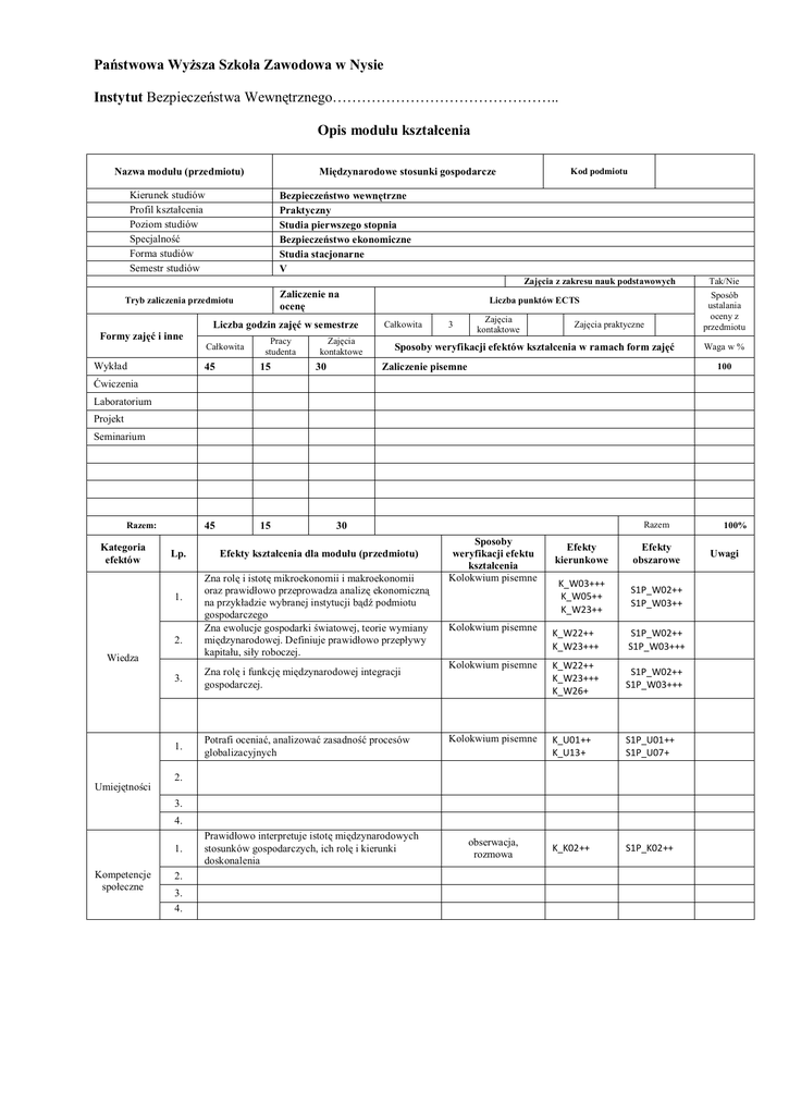 Państwowa Wyższa Szkoła Zawodowa w Nysie Instytut Bezpieczeństwa Wewnętrznego……………………………………….. Opis modułu kształcenia Nazwa modułu (przedmiotu) Międzynarodowe stosunki gospodarcze Kierunek studiów Profil kształcenia Poziom studiów Specjalność Forma studiów Semestr studiów Kod podmiotu Bezpieczeństwo wewnętrzne Praktyczny Studia pierwszego stopnia Bezpieczeństwo ekonomiczne Studia stacjonarne V Zajęcia z zakresu nauk podstawowych Zaliczenie na ocenę Tryb zaliczenia przedmiotu Formy zajęć i inne Wykład Liczba godzin zajęć w semestrze Całkowita Pracy studenta 45 15 45 15 Zajęcia kontaktowe 30 Liczba punktów ECTS Całkowita 3 Zajęcia kontaktowe Zajęcia praktyczne Sposoby weryfikacji efektów kształcenia w ramach form zajęć Zaliczenie pisemne Tak/Nie Sposób ustalania oceny z przedmiotu Waga w % 100 Ćwiczenia Laboratorium Projekt Seminarium Razem: Kategoria efektów Lp. 1. 2. Wiedza Umiejętności Razem 30 Efekty kształcenia dla modułu (przedmiotu) Zna rolę i istotę mikroekonomii i makroekonomii oraz prawidłowo przeprowadza analizę ekonomiczną na przykładzie wybranej instytucji bądź podmiotu gospodarczego Zna ewolucje gospodarki światowej, teorie wymiany międzynarodowej. Definiuje prawidłowo przepływy kapitału, siły roboczej. Sposoby weryfikacji efektu kształcenia Kolokwium pisemne Efekty kierunkowe Efekty obszarowe K_W03+++ K_W05++ K_W23++ S1P_W02++ S1P_W03++ Kolokwium pisemne K_W22++ K_W23+++ S1P_W02++ S1P_W03+++ Zna rolę i funkcję międzynarodowej integracji gospodarczej. Kolokwium pisemne 3. K_W22++ K_W23+++ K_W26+ S1P_W02++ S1P_W03+++ 1. Potrafi oceniać, analizować zasadność procesów globalizacyjnych Kolokwium pisemne K_U01++ K_U13+ S1P_U01++ S1P_U07+ K_K02++ S1P_K02++ 2. 3. 4. 1. Kompetencje społeczne 2. 3. 4. Prawidłowo interpretuje istotę międzynarodowych stosunków gospodarczych, ich rolę i kierunki doskonalenia obserwacja, rozmowa 100% Uwagi Prowadzący Forma zajęć Wykład Ćwiczenia Laboratorium Projekt Seminarium Prowadzący zajęcia (tytuł/stopień naukowy, imię i nazwisko) dr inż. Piotr Woźniak Treści kształcenia Wykład Metody dydaktyczne prezentacja multimedialna, ćwiczenia przy tablicy, studium przypadków w odniesieniu do prezentowanych tematów Liczba godzin L.p. Tematyka zajęć 1. Definicja i zakres przedmiotu międzynarodowe stosunki gospodarcze Ewolucja gospodarki światowej oraz międzynarodowych stosunków gospodarczych Teorie wymiany międzynarodowej Międzynarodowe przepływy czynników produkcji Międzynarodowe przepływy kapitału, nielegalne przepływy kapitału Międzynarodowe przepływy siły roboczej, transfer technologii Bariery międzynarodowej wymiany gospodarczej Wolny handel oraz protekcjonizm. Międzynarodowy system walutowy. Globalizacja międzynarodowych stosunków gospodarczych Instrumenty polityki handlu międzynarodowego Międzynarodowa integracja gospodarcza i międzynarodowe organizacje gospodarcze Kurs walutowy i rynek walutowy Korporacje międzynarodowe i ich rola w gospodarce światowej Powtórzenie materiału 2. 3. 4. 5. 6. 7. 8. 9. 10. 11. 12. 13. 14. 15. Razem liczba godzin: 2 2 2 2 2 2 2 2 2 2 2 2 2 2 2 30 Ćwiczenia L.p. Metody dydaktyczne Liczba godzin Tematyka zajęć 1. 2. 3. 4. 5. 6. 7. 8. 9 10. 11. 12. 13. 14. 15. Razem liczba godzin: Laboratorium L.p. Metody dydaktyczne Liczba godzin Tematyka zajęć 1. 2. 3. 4. 5. 6. 7. 8. 9. 10. 11. 12. 13. 14. 15. Razem liczba godzin: Projekt L.p. 1. 2. Metody dydaktyczne Tematyka zajęć Liczba godzin 3. 4. 5. 6. 7. 8. 9. 10. 11. 12. 13. 14. 15. Razem liczba godzin: Seminarium Metody dydaktyczne L.p. Tematyka zajęć 1. 2. 3. 4. 5. 6. 7. 8. 9. 10. 11. 12. 13. 14. 15. Razem liczba godzin: Literatura podstawowa: 1 Jan Rymarczyk, „Międzynarodowe stosunki gospodarcze”, Polskie Wydawnictwo Ekonomiczne, Warszawa 2006 r. 2 3 Adam Budnikowski, „Międzynarodowe stosunki gospodarcze” Polskie Wydawnictwo Ekonomiczne, Warszawa 2006 r. Tomasz Rynarzewski, Anna Zielińska-Głębocka, „Międzynarodowe stosunki gospodarcze, teoria wymiany i polityki handlu międzynarodowego”, Wydawnictwo Naukowe PWN, Warszawa 2006r. 4 Marian Guzek, „Międzynarodowe stosunki gospodarcze, zarys teorii i polityki handlowej” Polskie Wydawnictwo Ekonomiczne, Warszawa 2006 r. 5 Paweł Bożyk, „Międzynarodowe stosunki ekonomiczne” Polskie Wydawnictwo Ekonomiczne, Warszawa 2008 r. 6 7 8 Literatura uzupełniająca: 1 Międzynarodowe stosunki gospodarcze u progu XXI wieku” pod red. Stanisława Miklaszewskiego, wydawnictwo Difin, Warszawa 2006 r. 2 3 4 5 6 7 8 ............................................................ ………………………………… Koordynator modułu (przedmiotu) Dyrektor Instytutu podpis pieczęć i podpis
