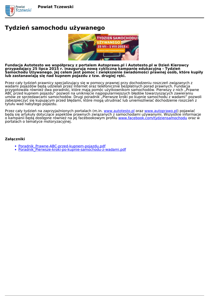 Powiat Tczewski Tydzień samochodu używanego Fundacja Autotesto we współpracy z portalem Autoprawo.pl i Autotesto.pl w Dzień Kierowcy przypadający 25 lipca 2015 r. inaugurują nową cykliczną kampanię edukacyjną - Tydzień Samochodu Używanego. Jej celem jest pomoc i zwiększenie świadomości prawnej osób, które kupiły lub zastanawiają się nad kupnem pojazdu z tzw. drugiej ręki. Przez cały tydzień prawnicy specjalizujący się w pomocy prawnej przy dochodzeniu roszczeń związanych z wadami pojazdów będą udzielali przez Internet oraz telefonicznie bezpłatnych porad prawnych. Fundacja przygotowała również dwa poradniki, które mają pomóc użytkownikom samochodów. Pierwszy z nich „Prawne ABC przed kupnem pojazdu” pozwoli na uniknięcie najpopularniejszych błędów towarzyszących zawieraniu umów ze sprzedawcami samochodów. Drugi poradnik „Pierwsze kroki po kupnie samochodu z wadami” pozwoli zabezpieczyć się kupującym przed błędami, które mogą utrudniać lub uniemożliwiać dochodzenie roszczeń z tytułu wad nabytego pojazdu. Przez cały tydzień na zaprzyjaźnionych portalach (m.in. www.autotesto.pl oraz www.autoprawo.pl) pojawiać będą się artykuły dotyczące aspektów prawnych związanych z samochodami używanymi. Wszystkie informacje o kampanii będą dostępne również na jej facebookowym profilu www.facebook.com/tydziensamochodu oraz w portalach o tematyce motoryzacyjnej. Załączniki Poradnik_Prawne-ABC-przed-kupnem-pojazdu.pdf Poradnik_Pierwsze-kroki-po-kupnie-samochodu-z-wadami.pdf Powered by TCPDF (www.tcpdf.org)