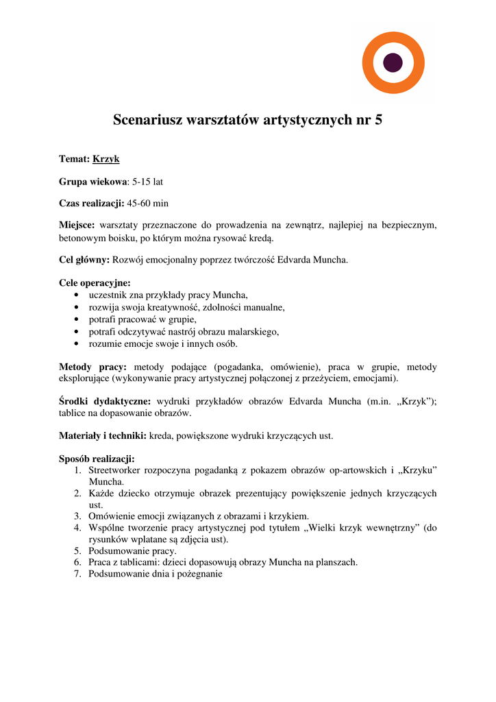 Scenariusz warsztatów artystycznych nr 5 Temat: Krzyk Grupa wiekowa: 5-15 lat Czas realizacji: 45-60 min Miejsce: warsztaty przeznaczone do prowadzenia na zewnątrz, najlepiej na bezpiecznym, betonowym boisku, po którym można rysować kredą. Cel główny: Rozwój emocjonalny poprzez twórczość Edvarda Muncha. Cele operacyjne: • uczestnik zna przykłady pracy Muncha, • rozwija swoja kreatywność, zdolności manualne, • potrafi pracować w grupie, • potrafi odczytywać nastrój obrazu malarskiego, • rozumie emocje swoje i innych osób. Metody pracy: metody podające (pogadanka, omówienie), praca w grupie, metody eksplorujące (wykonywanie pracy artystycznej połączonej z przeżyciem, emocjami). Środki dydaktyczne: wydruki przykładów obrazów Edvarda Muncha (m.in. „Krzyk”); tablice na dopasowanie obrazów. Materiały i techniki: kreda, powiększone wydruki krzyczących ust. Sposób realizacji: 1. Streetworker rozpoczyna pogadanką z pokazem obrazów op-artowskich i „Krzyku” Muncha. 2. Każde dziecko otrzymuje obrazek prezentujący powiększenie jednych krzyczących ust. 3. Omówienie emocji związanych z obrazami i krzykiem. 4. Wspólne tworzenie pracy artystycznej pod tytułem „Wielki krzyk wewnętrzny” (do rysunków wplatane są zdjęcia ust). 5. Podsumowanie pracy. 6. Praca z tablicami: dzieci dopasowują obrazy Muncha na planszach. 7. Podsumowanie dnia i pożegnanie Możliwe trudności: Brak bezpiecznej np. betonowej przestrzeni, po której można rysować kredą. Proponowane rozwiązanie: przyniesienie ze sobą kilku szarych tektur o wymiarach 100x70 cm, zastąpienie kredy markerami i pisakami. Scenariusz opracowany przez Fundację Nowe Centrum http://nowecentrum.org Materiał został przygotowany w ramach programu Akademia Orange prowadzonego przez Fundację Orange. Materiał jest dostępny na licencji Creative Commons Uznanie autorstwa 3.0 Polska (licencja dostępna pod adresem: creativecommons.org/licenses/by/3.0/pl)