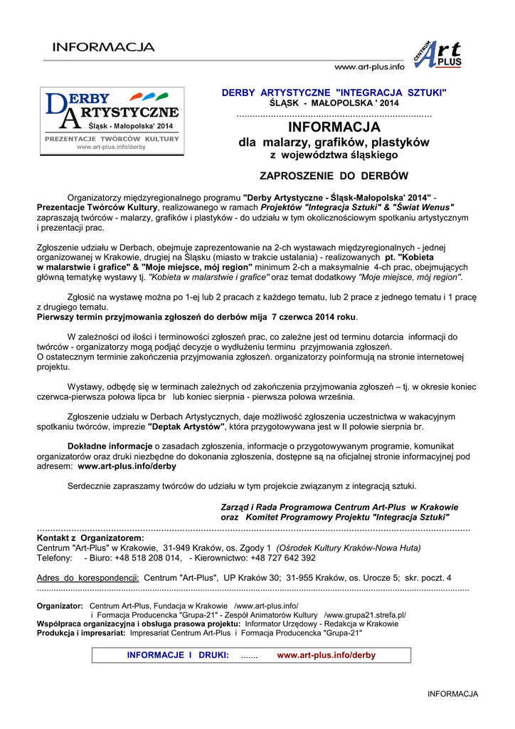 DERBY ARTYSTYCZNE "INTEGRACJA SZTUKI" ŚLĄSK - MAŁOPOLSKA ' 2014 .......................................................................... INFORMACJA dla malarzy, grafików, plastyków z województwa śląskiego ZAPROSZENIE DO DERBÓW Organizatorzy międzyregionalnego programu "Derby Artystyczne - Śląsk-Małopolska' 2014" Prezentacje Twórców Kultury, realizowanego w ramach Projektów "Integracja Sztuki" & "Świat Wenus" zapraszają twórców - malarzy, grafików i plastyków - do udziału w tym okolicznościowym spotkaniu artystycznym i prezentacji prac. Zgłoszenie udziału w Derbach, obejmuje zaprezentowanie na 2-ch wystawach międzyregionalnych - jednej organizowanej w Krakowie, drugiej na Śląsku (miasto w trakcie ustalania) - realizowanych pt. "Kobieta w malarstwie i grafice" & "Moje miejsce, mój region" minimum 2-ch a maksymalnie 4-ch prac, obejmujących główną tematykę wystawy tj. "Kobieta w malarstwie i grafice" oraz temat dodatkowy "Moje miejsce, mój region". Zgłosić na wystawę można po 1-ej lub 2 pracach z każdego tematu, lub 2 prace z jednego tematu i 1 pracę z drugiego tematu. Pierwszy termin przyjmowania zgłoszeń do derbów mija 7 czerwca 2014 roku. W zależności od ilości i terminowości zgłoszeń prac, co zależne jest od terminu dotarcia informacji do twórców - organizatorzy mogą podjąć decyzje o wydłużeniu terminu przyjmowania zgłoszeń. O ostatecznym terminie zakończenia przyjmowania zgłoszeń. organizatorzy poinformują na stronie internetowej projektu. Wystawy, odbędę się w terminach zależnych od zakończenia przyjmowania zgłoszeń – tj. w okresie koniec czerwca-pierwsza połowa lipca br lub koniec sierpnia - pierwsza połowa września. Zgłoszenie udziału w Derbach Artystycznych, daje możliwość zgłoszenia uczestnictwa w wakacyjnym spotkaniu twórców, imprezie "Deptak Artystów", która przygotowywana jest w II połowie sierpnia br. Dokładne informacje o zasadach zgłoszenia, informacje o przygotowywanym programie, komunikat organizatorów oraz druki niezbędne do dokonania zgłoszenia, dostępne są na oficjalnej stronie informacyjnej pod adresem: www.art-plus.info/derby Serdecznie zapraszamy twórców do udziału w tym projekcie związanym z integracją sztuki. Zarząd i Rada Programowa Centrum Art-Plus w Krakowie oraz Komitet Programowy Projektu "Integracja Sztuki" .................................................................................................................................................................... Kontakt z Organizatorem: Centrum "Art-Plus" w Krakowie, 31-949 Kraków, os. Zgody 1 (Ośrodek Kultury Kraków-Nowa Huta) Telefony: - Biuro: +48 518 208 014, - Kierownictwo: +48 727 642 392 Adres do korespondencji: Centrum "Art-Plus", UP Kraków 30; 31-955 Kraków, os. Urocze 5; skr. poczt. 4 .................................................................................................................................................................................... Organizator: Centrum Art-Plus, Fundacja w Krakowie /www.art-plus.info/ i Formacja Producencka "Grupa-21" - Zespół Animatorów Kultury /www.grupa21.strefa.pl/ Współpraca organizacyjna i obsługa prasowa projektu: Informator Urzędowy - Redakcja w Krakowie Produkcja i impresariat: Impresariat Centrum Art-Plus i Formacja Producencka "Grupa-21" INFORMACJE I DRUKI: ....... www.art-plus.info/derby INFORMACJA