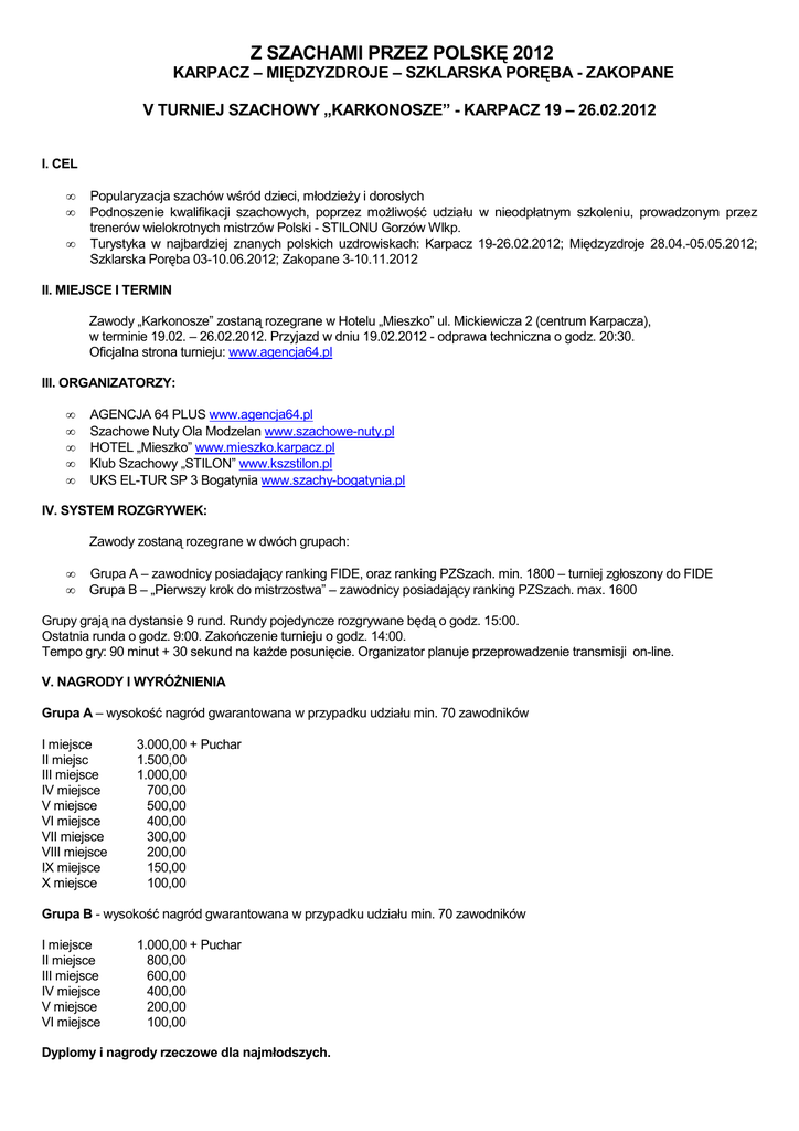 Z SZACHAMI PRZEZ POLSKĘ 2012 KARPACZ – MIĘDZYZDROJE – SZKLARSKA PORĘBA - ZAKOPANE V TURNIEJ SZACHOWY „KARKONOSZE” - KARPACZ 19 – 26.02.2012 I. CEL • • • Popularyzacja szachów wśród dzieci, młodzieży i dorosłych Podnoszenie kwalifikacji szachowych, poprzez możliwość udziału w nieodpłatnym szkoleniu, prowadzonym przez trenerów wielokrotnych mistrzów Polski - STILONU Gorzów Wlkp. Turystyka w najbardziej znanych polskich uzdrowiskach: Karpacz 19-26.02.2012; Międzyzdroje 28.04.-05.05.2012; Szklarska Poręba 03-10.06.2012; Zakopane 3-10.11.2012 II. MIEJSCE I TERMIN Zawody „Karkonosze” zostaną rozegrane w Hotelu „Mieszko” ul. Mickiewicza 2 (centrum Karpacza), w terminie 19.02. – 26.02.2012. Przyjazd w dniu 19.02.2012 - odprawa techniczna o godz. 20:30. Oficjalna strona turnieju: www.agencja64.pl III. ORGANIZATORZY: • • • • • AGENCJA 64 PLUS www.agencja64.pl Szachowe Nuty Ola Modzelan www.szachowe-nuty.pl HOTEL „Mieszko” www.mieszko.karpacz.pl Klub Szachowy „STILON” www.kszstilon.pl UKS EL-TUR SP 3 Bogatynia www.szachy-bogatynia.pl IV. SYSTEM ROZGRYWEK: Zawody zostaną rozegrane w dwóch grupach: • • Grupa A – zawodnicy posiadający ranking FIDE, oraz ranking PZSzach. min. 1800 – turniej zgłoszony do FIDE Grupa B – „Pierwszy krok do mistrzostwa” – zawodnicy posiadający ranking PZSzach. max. 1600 Grupy grają na dystansie 9 rund. Rundy pojedyncze rozgrywane będą o godz. 15:00. Ostatnia runda o godz. 9:00. Zakończenie turnieju o godz. 14:00. Tempo gry: 90 minut + 30 sekund na każde posunięcie. Organizator planuje przeprowadzenie transmisji on-line. V. NAGRODY I WYRÓŻNIENIA Grupa A – wysokość nagród gwarantowana w przypadku udziału min. 70 zawodników I miejsce II miejsc III miejsce IV miejsce V miejsce VI miejsce VII miejsce VIII miejsce IX miejsce X miejsce 3.000,00 + Puchar 1.500,00 1.000,00 700,00 500,00 400,00 300,00 200,00 150,00 100,00 Grupa B - wysokość nagród gwarantowana w przypadku udziału min. 70 zawodników I miejsce II miejsce III miejsce IV miejsce V miejsce VI miejsce 1.000,00 + Puchar 800,00 600,00 400,00 200,00 100,00 Dyplomy i nagrody rzeczowe dla najmłodszych. VI. FINANSOWANIE Koszt pobytu w Hotelu „Mieszko” z wyżywieniem: 525 zł od osoby (7 dni x 75 zł.) – pokoje 2-4 osobowe; 665 zł od osoby (7 dni x 95 zł.) – pokoje jednoosobowe. Wszystkie pokoje z łazienkami i TV. Dla grup zorganizowanych (powyżej 10 osób) udzielamy rabatu. Wpisowe do turnieju: Open A: GM, WGM - zwolnieni IM, WIM – 50 zł. pozostali – 100 zł. Open B: 70 zł. Oprócz wpisowego, w turniejach obowiązują aktualne stawki opłaty klasyfikacyjno – rankingowej PZSzach. Wpłaty należności na konto nr.: 50 1020 5558 1111 1814 1740 0038 – „Szachowe Nuty Ola Modzelan”, ul. Grabskiego 13/7, 66-400 Gorzów Wlkp., lub gotówką przed odprawą techniczną. . VII. ZGŁOSZENIA Zgłoszenia do udziału w zawodach należy nadsyłać e-mailem: Waldemar Gałażewski: [email protected] tel. +48-600-952-587 po godz. 18:00 [email protected] - zawodnicy zagraniczni Termin zgłoszeń - 15.01.2012 r., po tym terminie wpisowe wzrasta o 25%. VIII. SPRAWY RÓŻNE • • • • • Śniadania i kolacje – bufet szwedzki Organizatorzy przewidują przeprowadzenie imprez towarzyszących (blitz, wykład szkoleniowy dla dzieci – Aleksander Czerwoński i prelekcję dla rodziców i szkoleniowców – Andrzej Modzelan) Osoby niepełnoletnie zobowiązane są pozostawać pod opieką osób dorosłych. Zawodnicy ubezpieczają się we własnym zakresie. Miasto Karpacz jest znanym w Polsce kurortem wypoczynkowym, z wieloma atrakcjami turystycznymi, m.in. szlaki górskie i spacerowe, szczyt Śnieżka, Świątynia Wang, itp.) Organizator zastrzega sobie prawo do ostatecznej interpretacji i ewentualnych zmian w komunikacie. Śnieżka (1602 m. n.p.n.)