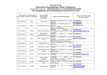 REJESTR Komendanta Wojewódzkiego Policji w Bydgoszczy p s y c h o l o g ó w upoważnionych do przeprowadzania badań osób ubiegających się lub posiadających pozwolenie na broń Data wpisu Nr zaświadczenia. o Lp. do rejestru wpisie do „Rejestru …” Imię i nazwisko uprawnionego psychologa 1 14.03.2001r. 1/2001 GÖTZ Józef 2 14.03.2001r. 2/2001 WYDRZYŃSKA Halina 3 14.03.2001r. 3/2001 PÓŁCHŁOPEK Maria 4 19.04.2001r. 6/2001 KRUPIŃSKAKACZMAREK Justyna 5 29.05.2001r. 7/2001 SZWARC-GAJEWSKA Maria 6 29.05.2001r. 8/2001 DOBROMILSKI Jan 7 02.07.2001r. 10/2001 RÓŻAŃSKA Elżbieta 8 02.07.2001r. 11/2001 9 02.07.2001r. 12/2001 10 20.12.2001r. 14/2001 OŻAROWSKA Marzanna 11 17.01.2002r. 16/2002 GÓRECKI Grzegorz Jacek 12 07.04.2005r. 74/2005 MANOS Iwona Miejsce wykonywania praktyki Bydgoszcz, ul. Miedzyńska 11 – Gabinet prywatny Bydgoszcz, ul. Inowrocławska 11 – Pracownia, Nakło n. Notecią, ul., Pocztowa 16– Pracownia Psychologiczna Brodnica, ul. Waryńskiego 6, Psychologiczna Pracownia Badań, Terapii i Edukacji Koronowo, ul. Rysia 6 – Gabinet prywatny Bydgoszcz, ul. Kościuszki 56/7 – Gabinet Prywatny, Bydgoszcz, ul. Kopernika 14, SPWZOZ MSW Poradnia Zdrowia Prychicznego Toruń, ul. Bursztynowa 16 – Gabinet prywatny Adres poczty elektronicznej lub numer telefonu Tel.603183476, [email protected] Tel. 604698574, [email protected] Tel.606945516, [email protected] Tel. 602796613 Tel. 604517667, [email protected] Tel. 608412301, Włocławek, ul. Dziewińska 13 – Gabinet [email protected] prywatny Bydgoszcz, ul. Lehmana 2/36 – Gabinet Tel. 691958820 Psychologiczny Tel. 606828071, Włocławek, ul. Zduńska 2, Przychodnia KACZMAREK Antoni [email protected] LABMED NOWAK-WOCHNA Hanna Grudziądz, ul. Rynek 3-5, Tel. 609446391, Psychologiczny Ośrodek Diagnozy, Terapii i Rozwoju Osobowości Toruń, ul. Żyzna 6, Prywanty Gabinet Tel. 603202983 Psychologiczny Tel.607282048, Bydgoszcz, ul. Cicha 22/7, Gabinet [email protected] prywatny [email protected] 13 14.01.2002r. 14 23.05.2002r. 15 23.05.2002r. 16 19.06.2002r. 16/2002 47/2002 48/2002 51/2002 17 19.06.2002r. 52/2002 18 01.08.2002r. 55/2002 19 30.08.2002r. 59/2002 20 12.03.2003r. 64/2003 21 16.03.2004r. 67/2004 22 10.03.2004r. 68/2004 23 08.04.2004r. 69/2004 24 17.02.2005r. 72/2005 GÓRECKI Grzegorz Toruń, ul. Żyzna 6 – Gabinet prywatny, Grudziądz, ul. Brzozowa 48a – Gabinet prywatny, Grudziądz, ul. Legionów 57 – WSPLek. SP ZOZ, WACŁAWSKI Wojciech Grudziądz, ul.. Roty Grudziądzkiej 6, EUROMEDICA SPZOZ, Grudziądz, ul. Piłsudskiego 21/23, Pracownia Psychologiczna Bydgoszcz, ul. Spadochroniarzy 28 – Gabinet prywatny, GOLINOWSKA Danuta Bydgoszcz, ul. Powst. Warszawy 5, Poliklinika 10 WSK Bydgoszcz, ul. Tczewska 11 – Zespół TRYBUŚ-GRUSZKA Psychologów i Pedagogów „GAMMA”, Dorota Bydgoszcz, ul Kopernika 14, SPWZOZ MSW Poradnia Zdrowia Psychicznego Bydgoszcz, ul. Karłowicza 26 – GAŁKIEWICZ Wojewódzki Ośrodek Medycyny Pracy, Małgorzata Bydgoszcz, ul. Piotrowskiego 18/1, Prywatny Gabinet Psychologiczny SAJEWICZ Piotr Tel. 603202983 ,tel. 609438844, [email protected] Tel. 502145477 Tel. 602255202 Tel. 505376313 Tel. 501503170 Toruń, ul. Lubicka 41/8 RYCERZBydgoszcz, ul. Dworcowa 110, Tel. 52-3220892 BALDOWSKA Halina “SANITAS” Bydgoszcz, ul. Dworcowa 110 - Tel. 52-3220892, 508355448, „SANITAS”, GRZEMPA Andrzej Bydgoszcz, ul. Warszawska 10, Centralna Wojskowa Pracownia psychologiczna w Bydgoszczy Warszawa, ul. Kobielska 6/4 – WÓJCIŃSKA Monika Specjalistyczne Centrum Medyczne ADAD SADURSKA Katarzyna Toruń, ul. Makowa Psychologiczna 5, Pracownia Włocławek, ul. Dziwińska 13 – Gabinet RÓŻAŃSKA Agnieszka Prywatny Bydgoszcz, ul. Zygmunta Augusta 20a, POTRACKI Franciszek Wojskowa Pracownia Psychologiczna w Bydgoszczy tel. 261415280, 601667879 Tel. 602538163, [email protected] [email protected] tel. 601914249 Tel. 500092605 Tel. 261415210, 602407318, sekretariat 261415316 25 09.06.2005r. 77/2005 26 30.01.2006r. 79/2006 27 21.09.2006r. 81/2006 Bydgoszcz, ul. Wojska Polskiego 46, Tel. 52-3208720 NZOZ „GRYF-MED.”, Bydgoszcz, ul. Fordońska 116, Tel. 502042997 Pracownia Psychologii Pracy, MIKOŁAP Aneta Inowrocław, ul. Roosvelta 29, Pracownia Psychologii Pracy, Żnin, ul Gnieźnieńska 8, Pracownia Psychologii Pracy, Tel.502247090, ZASADA Małgorzata Włocławek, ul. Żbikowa 11 [email protected] PAKUŁA Jolanta Bydgoszcz, ul. Karłowicza 7, Pracownia Tel. 662004515, Badań i Usług Psychologicznych „NOV” [email protected] Toruń, Centrum Medyczne „OLK-MED” Tel. 56-6575221 sp. z o.o., ul. Plac 18 stycznia 4, Toruń, Pracownia Psychologiczna Ewa Tel. 697937970 Lutomska, ul. Mickiewicza 134/136 Tel. 56-6228019, 56-6554128, Toruń, ul. Bydgoska 76, Wojewódzki [email protected] Ośrodek Medycyny Pracy 28 23.10.2007r. 84/2007 LUTOMSKA Ewa 29 14.07.2009r. 92/2009 MAJEWSKA Joanna 30 13.01.2010r. 95/2010 PRZYBYŁ Małgorzata Bydgoszcz, ul. Ujejskiego 50/12 Gabinet Psychologiczny - Tel.888350040 31 12.01.2011r. 98/2011 ŁUKASIK Agata Grudziądz, ul. Waryńskiego Pracownia Psychologiczna 4, Tel. 694056464 32 12.01.2011r. 99/2011 33 03.02.2011r. 100/2011 34 21.04.2011r. 102/2011 35 26.07.2011 r. 104/2011 36 03.08.2011r. 105/2011 37 11.03.2013r. 114/2013 ŚLÓSAREK Maciej Tel. 663130900, Toruń, ul. Świętopełka 26 – gabinet [email protected] prywatny,, Toruń, ul. Matejki 631/2, ELMED Tel. 692258384, Olsztyn, ul. Warszawska 96, Wojskowa 261323472, Pracownia Psychologiczna w Olsztynie [email protected] GRZEMPABydgoszcz, ul. Zygmunta Augusta 20A, Tel. 261415315, sekretariat 261415316 MAŁKOWSKA Monika Wojskowa Pracownia Psychologiczna Tel. 509710361, TYBURSKA Danuta Brodnica, ul. Wczasowa 74 [email protected] WILCZYŃSKI Kamil Inowrocław, ul. Dworcowa 71, Tel. 603209603, „FARMA_MED.” Kujawskie Centrum 52-3567140, BUCZYŃSKA Renata Medyczne Sp.z o.o. Sp.k., Pracownia 52-3567146 Psychologiczna, Włocławek, ul. Żeromskiego 12, Tel. 661480808, KOSIOREK-GÓRECKA [email protected] 