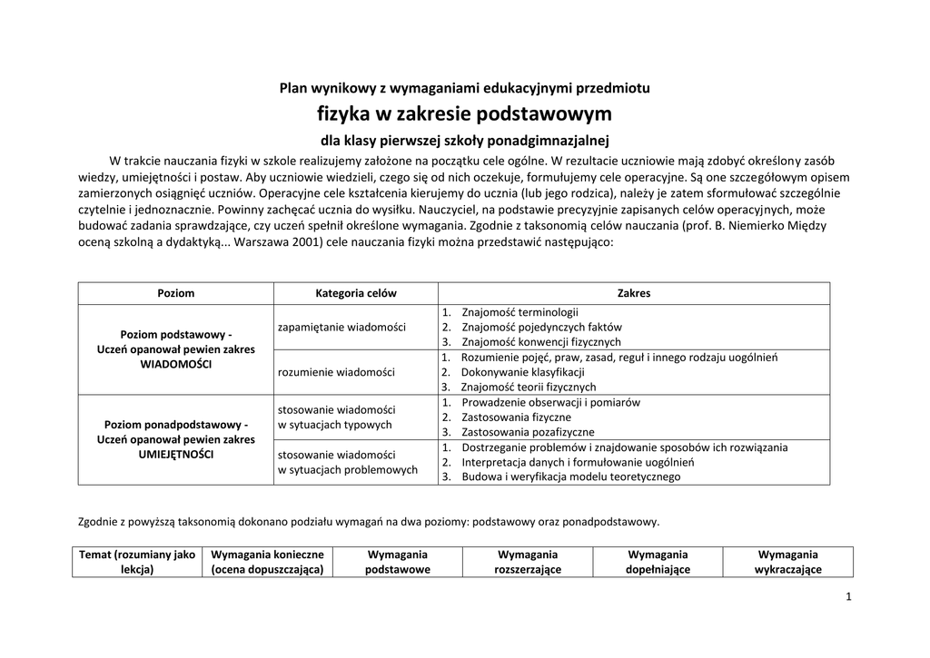 Plan wynikowy z wymaganiami edukacyjnymi przedmiotu fizyka w zakresie podstawowym dla klasy pierwszej szkoły ponadgimnazjalnej W trakcie nauczania fizyki w szkole realizujemy założone na początku cele ogólne. W rezultacie uczniowie mają zdobyć określony zasób wiedzy, umiejętności i postaw. Aby uczniowie wiedzieli, czego się od nich oczekuje, formułujemy cele operacyjne. Są one szczegółowym opisem zamierzonych osiągnięć uczniów. Operacyjne cele kształcenia kierujemy do ucznia (lub jego rodzica), należy je zatem sformułować szczególnie czytelnie i jednoznacznie. Powinny zachęcać ucznia do wysiłku. Nauczyciel, na podstawie precyzyjnie zapisanych celów operacyjnych, może budować zadania sprawdzające, czy uczeń spełnił określone wymagania. Zgodnie z taksonomią celów nauczania (prof. B. Niemierko Między oceną szkolną a dydaktyką... Warszawa 2001) cele nauczania fizyki można przedstawić następująco: Poziom Kategoria celów Poziom podstawowy Uczeń opanował pewien zakres WIADOMOŚCI Poziom ponadpodstawowy Uczeń opanował pewien zakres UMIEJĘTNOŚCI zapamiętanie wiadomości rozumienie wiadomości stosowanie wiadomości w sytuacjach typowych stosowanie wiadomości w sytuacjach problemowych Zakres 1. 2. 3. 1. 2. 3. 1. 2. 3. 1. 2. 3. Znajomość terminologii Znajomość pojedynczych faktów Znajomość konwencji fizycznych Rozumienie pojęć, praw, zasad, reguł i innego rodzaju uogólnień Dokonywanie klasyfikacji Znajomość teorii fizycznych Prowadzenie obserwacji i pomiarów Zastosowania fizyczne Zastosowania pozafizyczne Dostrzeganie problemów i znajdowanie sposobów ich rozwiązania Interpretacja danych i formułowanie uogólnień Budowa i weryfikacja modelu teoretycznego Zgodnie z powyższą taksonomią dokonano podziału wymagań na dwa poziomy: podstawowy oraz ponadpodstawowy. Temat (rozumiany jako lekcja) Wymagania konieczne (ocena dopuszczająca) Wymagania podstawowe Wymagania rozszerzające Wymagania dopełniające Wymagania wykraczające 1 Uczeń spełnił 50% wymagań podstawowych (ocena dostateczne) Uczeń spełnił 75% wymagań podstawowych (ocena dobra) Uczeń spełnił 50% wymagań ponadpodstawowych Poziom podstawowy Uczeń opanował pewien zakres wiadomości (ocena bardzo dobra) Uczeń spełnił 75% wymagań ponadpodstawowych (ocena celująca) Uczeń spełnił 100% wymagań ponadpodstawowych Poziom ponadpodstawowy Uczeń opanował pewien zakres umiejętności 1. Grawitacja i elementy astronomii 1.1. Kinematyka ruchu jednostajnego po okręgu 1.2. Dynamika ruchu jednostajnego po okręgu 1.3. Układ Słoneczny 1.4. Prawo powszechnego ciążenia Uczeń: Uczeń: 1. Wyjaśnia związek między okresem obiegu a częstotliwością w ruchu jednostajnym po okręgu. 2. Charakteryzuje prędkość liniową w ruchu jednostajnym po okręgu jako wielkość wektorową. 3. Charakteryzuje przyspieszenie w ruchu jednostajnym po okręgu jako wielkość wektorową. 4. Zaznacza na rysunku ciała wykonującego ruch po okręgu wektory prędkości liniowej oraz przyspieszenia dośrodkowego. 5. Stosuje poznane zależności do rozwiązywania prostych zadań i problemów. 1. Oblicza wartość częstotliwości obiegu, gdy dany jest czas okresu obiegu. 2. Wyznacza wartość prędkości liniowej gdy znany jest promień okręgu oraz częstotliwość obiegu. 3. Wyznacza wartość przyspieszenia dośrodkowego, gdy znany jest promień okręgu oraz częstotliwość obiegu. 4. Stosuje poznane wielkości fizyczne do rozwiązywania zadań problemowych i obliczeniowych. Uczeń: Uczeń: 1. Zaznacza na rysunku ciała wykonującego ruch po okręgu wektor siły dośrodkowej. 2. Wskazuje naturę siły dośrodkowej w przykładach obiektów wykonujących ruch po okręgu. 3. Stosuje poznane zależności do rozwiązywania prostych zadań i problemów. 1. Opisuje zależności między siłą dośrodkową a masą, prędkością lub promieniem. 2. Wyznacza wartość siły dośrodkowej, gdy znana jest masa ciała oraz parametry jego ruchu po okręgu. 3. Stosuje poznane wielkości fizyczne do rozwiązywania zadań problemowych i obliczeniowych. Uczeń: Uczeń: 1. Charakteryzuje skład oraz budowę Układu Słonecznego. 2. Opisuje cechy fizyczne planet Układu Słonecznego. 3. Na podstawie fotografii odróżnia od siebie poszczególne planety Układu Słonecznego. 4. Obserwuje fazy Księżyca. 1. 0pisuje zasadę określania orientacyjnego wieku Układu Słonecznego. 2. Charakteryzuje ewolucję Układu Słonecznego. 3. Prowadzi proste obserwacje obiektów będących składnikami Układu Słonecznego. Uczeń: Uczeń: 1. Formułuje treść III prawa Keplera. 1. Wyjaśnia wpływ siły grawitacji Słońca na ruch planet i siły grawitacji planet na 2 1.5. Pole grawitacyjne 1.6. Stan nieważkości 1.7. Prędkości kosmiczne 1.8. Proste obserwacje astronomiczne 2. Oblicza okres obiegu planety wokół Słońca na podstawie informacji na temat odległości tej planety od Słońca. 3. Rysuje wektory sił grawitacji działające na przykładowe obiekty kosmiczne. 4. Wyjaśnia na czym polega powszechność prawa grawitacji. 5. Interpretuje zależności między wielkościami w prawie powszechnego ciążenia. 6. Stosuje poznane zależności do rozwiązywania prostych zadań i problemów. ruch ich księżyców. 2. Oblicza masę źródła pola grawitacyjnego na podstawie informacji na temat orbity obiektu krążącego wokół tego źródła. 3. Stosuje poznane wielkości fizyczne do rozwiązywania zadań problemowych i obliczeniowych. Uczeń: Uczeń: 1. 2. 3. 4. Podaje definicję pola grawitacyjnego. Odróżnia modele pól grawitacyjnych Definiuje pojęcie natężenia pola grawitacyjnego. Rysuje wektory natężeń pola grawitacyjnego w modelu jednorodnego oraz centralnego pola grawitacyjnego. 5. Podaje przyczynę spadania ciał na powierzchnię Ziemi. 6. Stosuje poznane zależności do rozwiązywania prostych zadań i problemów. 1. Opisuje ograniczenia stosowalności modelu jednorodnego pola grawitacyj