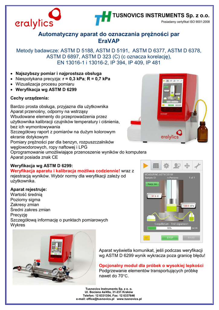 Automatyczny aparat do oznaczania prężności par EraVAP Metody badawcze: ASTM D 5188, ASTM D 5191, ASTM D 6377, ASTM D 6378, ASTM D 6897, ASTM D 323 (C) (c oznacza korelację), EN 13016-1 i 13016-2, IP 394, IP 409, IP 481 Najszybszy pomiar i najprostsza obsługa Niespotykana precyzja: r = 0,3 kPa; R = 0,7 kPa Wizualizacja procesu pomiaru Weryfikacja wg ASTM D 6299 Cechy urządzenia: Bardzo prosta obsługa, przyjazna dla użytkownika Aparat przenośny, odporny na wstrząsy Wbudowane elementy do przeprowadzenia przez użytkownika kalibracji czujników temperatury i ciśnienia, bez ich wymontowywania Szczegółowy raport z pomiarów na dużym kolorowym ekranie dotykowym Pomiary prężności par dla benzyn, rozpuszczalników węglowodorowych, ropy naftowej i LPG Oprogramowanie umożliwiające przenoszenie wyników do komputera Aparat posiada znak CE Weryfikacja wg ASTM D 6299: Weryfikacja aparatu i kalibracja możliwa codziennie! wraz z rejestracją wyników. Wybór normy dla weryfikacji zależy od użytkownika. Aparat rejestruje: Wartość średnią Poziomy sigma Zakresy zmian Średni zakres zmian Precyzję Szczegółową informację o punktach pomiarowych Wykres Aparat wyświetla komunikat, jeśli podczas weryfikacji wg ASTM D 6299 wynik wykracza poza granicę błędu! Opcjonalny moduł dla próbek o wysokiej lepkości Podgrzewanie elementów transportujących próbkę nawet do 70°C. Tusnovics Instruments Sp. z o. o. Ul. Bociana 4a/49a, 31-231 Kraków Telefon: 12 6331354, Fax: 12 6337646 e-mail: [email protected] www.tusnovics.pl Specyfikacja techniczna: Zakres temperatur 0 - 120°C (podstawowy), -20 - 120°C (opcja) wymagane zewnętrzne chłodzenie Stabilność temp. 0,01°C Zakres ciśnienia 0 - 1000 kPa (0 -145 psi), 0 - 2000 kPa (0 - 290 psi) (opcja) Precyzja pomiarów dla 37 ºC i 70 kPa Powtarzalność: r = 0,2 kPa Odtwarzalność: R = 0,7 kPa Stosunek para / ciecz Zmiennie 4/1 do 0,02/1 Czas pomiaru 5 min dla pomiaru standardowego Mycie układu Automatyczne przed kolejną próbką lub po zakończeniu pomiarów Podawanie próbki Mieszanie Automatyczne bez konieczności stosowania zewnętrznej pompy próżniowej. Opcjonalne podgrzewanie elementów transportujących próbkę do komory pomiarowej dla próbek o wysokiej lepkości. Opcjonalny układ mieszania dla pomiaru ropy naftowej Filtr Wbudowany 15 µm filtr metalowy Objętość próbki 1 ml lub 10 ml z płukaniem układu pomiarowego (2,2 ml na cykl) Zapis historii sprawdzania jakości Zapis jakości paliwa Zapisy wyników pomiarów i wykresu wg wymagań ASTM D 6299 Historia alarmów Zapis pełnej dokumentacji wszystkich komunikatów Wyświetlacz 6, 5” 4 kolorowy ekran dodatkowy Język Polski, Angielski, Niemiecki, Rosyjski Komunikacja 4 x USB, Ethernet i RS 232 port szeregowy Zasilanie 85-264 V AC, 47-63 Hz, 100W, dla zastosowań terenowych 12V/8A DC (z akumulatora samochodowego) Obudowa Aluminiowa, lakierowana, lekka, przenośna, odporna w transporcie Wymiary i waga 220 x 320 x 280 mm, 8 kg Analiza statystyczna w wykresem dla wyników do 8 próbek paliwa z procesu blendingu Tusnovics Instruments Sp. z o. o. Ul. Bociana 4a/49a, 31-231 Kraków Telefon: 12 6331354, Fax: 12 6337646 e-mail: [email protected] www.tusnovics.pl