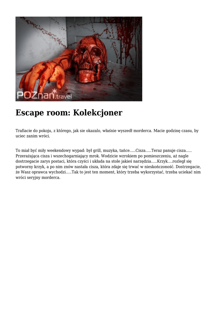 Escape room: Kolekcjoner Trafiacie do pokoju, z którego, jak sie okazalo, właśnie wyszedł morderca. Macie godzinę czasu, by uciec zanim wróci. To miał być miły weekendowy wypad: był grill, muzyka, tańce…..Cisza…..Teraz panuje cisza….. Przerażająca cisza i wszechogarniający mrok. Wodzicie wzrokiem po pomieszczeniu, aż nagle dostrzegacie zarys postaci, która czyści i układa na stole jakieś narzędzia…..Krzyk….rozległ się potworny krzyk, a po nim znów nastała cisza, która zdaje się trwać w nieskończoność. Dostrzegacie, że Wasz oprawca wychodzi…..Tak to jest ten moment, który trzeba wykorzystać, trzeba uciekać nim wróci seryjny morderca.