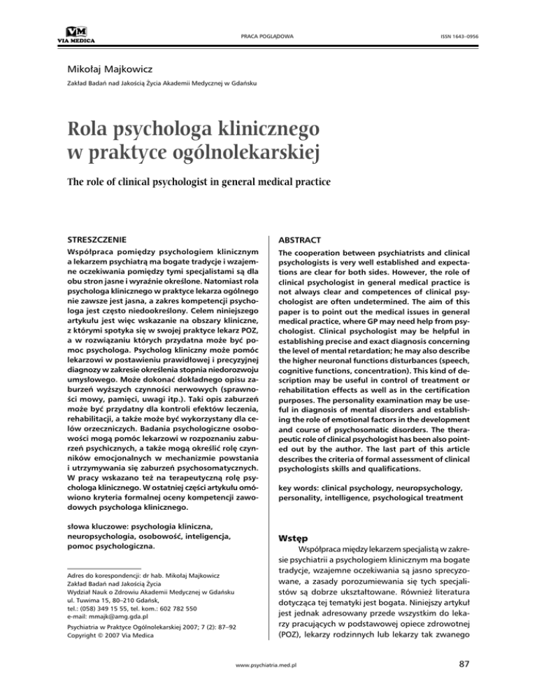 PRACA POGLĄDOWA ISSN 1643–0956 Mikołaj Majkowicz Zakład Badań nad Jakością Życia Akademii Medycznej w Gdańsku Rola psychologa klinicznego w praktyce ogólnolekarskiej The role of clinical psychologist in general medical practice STRESZCZENIE ABSTRACT Współpraca pomiędzy psychologiem klinicznym a lekarzem psychiatrą ma bogate tradycje i wzajemne oczekiwania pomiędzy tymi specjalistami są dla obu stron jasne i wyraźnie określone. Natomiast rola psychologa klinicznego w praktyce lekarza ogólnego nie zawsze jest jasna, a zakres kompetencji psychologa jest często niedookreślony. Celem niniejszego artykułu jest więc wskazanie na obszary kliniczne, z którymi spotyka się w swojej praktyce lekarz POZ, a w rozwiązaniu których przydatna może być pomoc psychologa. Psycholog kliniczny może pomóc lekarzowi w postawieniu prawidłowej i precyzyjnej diagnozy w zakresie określenia stopnia niedorozwoju umysłowego. Może dokonać dokładnego opisu zaburzeń wyższych czynności nerwowych (sprawności mowy, pamięci, uwagi itp.). Taki opis zaburzeń może być przydatny dla kontroli efektów leczenia, rehabilitacji, a także może być wykorzystany dla celów orzeczniczych. Badania psychologiczne osobowości mogą pomóc lekarzowi w rozpoznaniu zaburzeń psychicznych, a także mogą określić rolę czynników emocjonalnych w mechanizmie powstania i utrzymywania się zaburzeń psychosomatycznych. W pracy wskazano też na terapeutyczną rolę psychologa klinicznego. W ostatniej części artykułu omówiono kryteria formalnej oceny kompetencji zawodowych psychologa klinicznego. The cooperation between psychiatrists and clinical psychologists is very well established and expectations are clear for both sides. However, the role of clinical psychologist in general medical practice is not always clear and competences of clinical psychologist are often undetermined. The aim of this paper is to point out the medical issues in general medical practice, where GP may need help from psychologist. Clinical psychologist may be helpful in establishing precise and exact diagnosis concerning the level of mental retardation; he may also describe the higher neuronal functions disturbances (speech, cognitive functions, concentration). This kind of description may be useful in control of treatment or rehabilitation effects as well as in the certification purposes. The personality examination may be useful in diagnosis of mental disorders and establishing the role of emotional factors in the development and course of psychosomatic disorders. The therapeutic role of clinical psychologist has been also pointed out by the author. The last part of this article describes the criteria of formal assessment of clinical psychologists skills and qualifications. słowa kluczowe: psychologia kliniczna, neuropsychologia, osobowość, inteligencja, pomoc psychologiczna. key words: clinical psychology, neuropsychology, personality, intelligence, psychological treatment Wstęp Adres do korespondencji: dr hab. Mikołaj Majkowicz Zakład Badań nad Jakością Życia Wydział Nauk o Zdrowiu Akademii Medycznej w Gdańsku ul. Tuwima 15, 80–210 Gdańsk, tel.: (058) 349 15 55, tel. kom.: 602 782 550 e-mail: [email protected] Psychiatria w Praktyce Ogólnolekarskiej 2007; 7 (2): 87–92 Copyright © 2007 Via Medica Współpraca między lekarzem specjalistą w zakresie psychiatrii a psychologiem klinicznym ma bogate tradycje, wzajemne oczekiwania są jasno sprecyzowane, a zasady porozumiewania się tych specjalistów są dobrze ukształtowane. Również literatura dotycząca tej tematyki jest bogata. Niniejszy artykuł jest jednak adresowany przede wszystkim do lekarzy pracujących w podstawowej opiece zdrowotnej (POZ), lekarzy rodzinnych lub lekarzy tak zwanego www.psychiatria.med.pl 87 Psychiatria w Praktyce Ogólnolekarskiej 2007, tom 7, nr 2 pierwszego kontaktu. W tym obszarze nie ma jeszcze ukształtowanej tradycji i brakuje konkretnego określenia zakresu kompetencji psychologa (głównie klinicznego), a także potrzeb i oczekiwań w zakresie diagnostyki i pomocy psychologicznej. Celem artykułu jest więc wskazanie na obszary kliniczne, z którymi spotyka się w swojej praktyce lekarz POZ, a w rozwiązaniu których przydatna może być pomoc psychologa. Przyjmując za podstawę porządkującą przedstawione treści, z uwzględnieniem zarówno aspektów czysto medycznych, jak i funkcji psychicznych, a także klasyfikację stosowanych metod, na potrzeby tego rozdziału można wyróżnić następujące kategorie (obszary współpracy): 1) Diagnostyka procesów poznawczych: a) ogólnych (określenie poziomu intelektualnego); b) szczegółowych funkcji poznawczych. 2) Diagnostyka osobowości (procesów motywacyjno-emocjonalnych). 3) Pomoc psychologiczna. Diagnostyka procesów poznawczych Określenie poziomu inteligencji Precyzyjna diagnostyka ogólnej sprawności intelektualnej pacjenta nie często jest potrzebna lekarzowi w ogólnej praktyce medycznej. Na ogół lekarz na podstawie posiadanej wiedzy i doświadczenia jest w stanie bez badania psychologicznego ocenić, czy pacjent pod względem ogólnej sprawności umysłowej mieści się „w granicach normy”, czy też od niej odbiega. Zresztą, najczęściej celem badania przeprowadzonego przez lekarza ogólnego nie jest ocena sprawności intelektualnej, ale dolegliwości somatycznych. W takich sytuacjach wiedza o poziomie inteligencji pacjenta jest potrzebna lekarzowi jedynie w odniesieniu do zdolności chorego do podjęcia współpracy z lekarzem, na przykład zdolności rozumienia przez niego zaleceń lekarskich. W sytuacji, gdy istnieją co do tego wątpliwości, lekarz może na przykład korzystać z pomocy rodziny lub innych bliskich osób, którzy będą w stanie pomóc choremu w wypełnianiu zaleceń lekarskich. Wówczas nie jest potrzebne badanie psychologiczne. W praktyce lekarza zdarzają się jednak i takie sytuacje, w których dla celów precyzyjności
