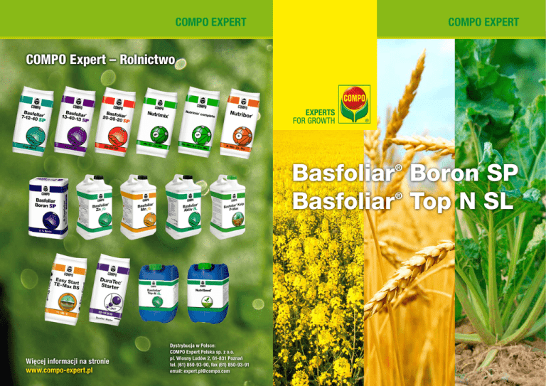 COMPO EXPERT COMPO EXPERT COMPO Expert – Rolnictwo EXPERTS FOR GROWTH Basfoliar Boron SP Basfoliar Top N SL ® ® Więcej informacji na stronie www.compo-expert.pl Dystrybucja w Polsce: COMPO Expert Polska sp. z o.o. pl. Wiosny Ludów 2, 61-831 Poznań tel. (61) 850-93-90, fax (61) 850-93-91 email: [email protected] COMPO EXPERT Basfoliar Boron SP ® Rozpuszczalny w wodzie, dolistny nawóz borowy. EXPERTS FOR GROWTH • Wysoka koncentracja składnika • Doskonała rozpuszczalność Skład: 21 % B – rozpuszczalny w wodzie bor Zalecenia: Dawka [kg/ha] Maksymalne stężenie [%] Buraki cukrowe 2-5 2 1. Faza 2 liści właściwych 2. Przed zwarciem międzyrzędzi Rzepak, warzywa kapustne 2-4 1 1. Po wschodach 2. Faza zielonego pąka 1 1. Faza intensywnego wzrostu, 2. 4-8 liści właściwych Uprawa Słonecznik Kukurydza 2-3 Terminy stosowania 1-2 0,3 Od 4-6 liści 0,5 - 1 0,3 2 aplikacje do fazy kwitnienia 1,5 - 4,5 1 Do kwitnienia Lucerna 1-2 1 Wczesne fazy wzrostu Pomidor 0,5 - 1,5 0,25 Przed kwitnieniem 1-2 0,1 Przed kwitnieniem Tytoń, soja, koniczyna Ziemniaki Orzech, śliwa, wiśnia, jabłoń, grusza, morela, truskawka Basfoliar Top N SL ® Płynny, mineralny nawóz azotowy o wydłużonym działaniu, przeznaczony do nawożenia dolistnego. Skład: 28 % N azot całkowity, w tym 16 % w postaci ureaformu 12 % azot mocznikowy • • • • • • • • Płynny nawóz azotowy, o wydłużonym działaniu Może być stosowany dolistnie i doglebowo 350g N w 1 litrze produktu Bezpieczny w stosowaniu Brak ryzyka uszkodzenia roślin Działanie : 8-12 tygodni Kompatybilny z większością nawozów i ŚOR Może być stosowany zarówno dla uzupełnienia niedoborów azotu we wszystkich uprawach, jak i dla uzyskania większej zawartości białka w zbożach Zalecenia: Dawka [l/ha] Maksymalne stężenie [%] Uprawy polowe (zboża, buraki cukrowe, ziemniaki, rzepak, kukurydza) 6 - 12 1-6 Przez cały okres wegetacji Drzewa owocowe 8 - 12 0,5 - 1 Przez cały okres wegetacji Drzewa pestkowe 4 0,25 - 0,5 Przez cały okres wegetacji Krzewy owocowe, truskawki 4-8 0,25 - 0,5 Przez cały okres wegetacji Warzywa 4-12 0,5 - 3,0 Przez cały okres wegetacji Uprawa Terminy stosowania