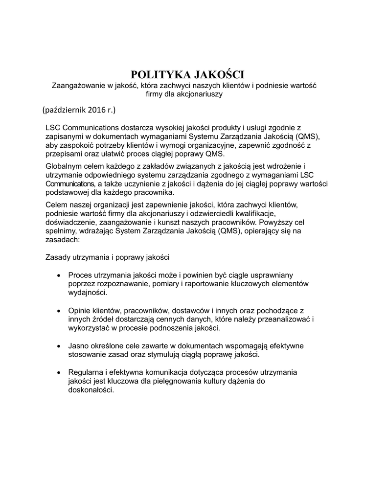 POLITYKA JAKOŚCI Zaangażowanie w jakość, która zachwyci naszych klientów i podniesie wartość firmy dla akcjonariuszy (październik 2016 r.) LSC Communications dostarcza wysokiej jakości produkty i usługi zgodnie z zapisanymi w dokumentach wymaganiami Systemu Zarządzania Jakością (QMS), aby zaspokoić potrzeby klientów i wymogi organizacyjne, zapewnić zgodność z przepisami oraz ułatwić proces ciągłej poprawy QMS. Globalnym celem każdego z zakładów związanych z jakością jest wdrożenie i utrzymanie odpowiedniego systemu zarządzania zgodnego z wymaganiami LSC Communications, a także uczynienie z jakości i dążenia do jej ciągłej poprawy wartości podstawowej dla każdego pracownika. Celem naszej organizacji jest zapewnienie jakości, która zachwyci klientów, podniesie wartość firmy dla akcjonariuszy i odzwierciedli kwalifikacje, doświadczenie, zaangażowanie i kunszt naszych pracowników. Powyższy cel spełnimy, wdrażając System Zarządzania Jakością (QMS), opierający się na zasadach: Zasady utrzymania i poprawy jakości Proces utrzymania jakości może i powinien być ciągle usprawniany poprzez rozpoznawanie, pomiary i raportowanie kluczowych elementów wydajności. Opinie klientów, pracowników, dostawców i innych oraz pochodzące z innych źródeł dostarczają cennych danych, które należy przeanalizować i wykorzystać w procesie podnoszenia jakości. Jasno określone cele zawarte w dokumentach wspomagają efektywne stosowanie zasad oraz stymulują ciągłą poprawę jakości. Regularna i efektywna komunikacja dotycząca procesów utrzymania jakości jest kluczowa dla pielęgnowania kultury dążenia do doskonałości.