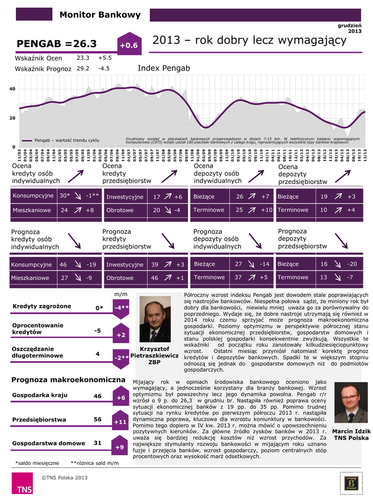 Monitor Bankowy grudzień 2013 PENGAB =26.3 Wskaźnik Ocen 23.3 2013 – rok dobry lecz wymagający +0.6 +5.5 Wskaźnik Prognoz 29.2 Index Pengab -4.5 40 20 30* -1** Inwestycyjne 17 +6 Bieżące 26 +7 Mieszkaniowe 24 +8 Obrotowe 20 -4 Terminowe 25 +10 Terminowe Prognoza Zagrożone kredyty przedsiębiorstw Bieżące +3 10 +4 Konsumpcyjne 46 -19 Inwestycyjne 39 +3 Bieżące 27 -14 Bieżące 16 -20 Mieszkaniowe 27 -9 Obrotowe 46 +1 Terminowe 37 +5 Terminowe 13 -7 Samochodowe +4 m/m Zagrożone -8 Kredyty zagrożone Zagrożone -4** 0* Oprocentowanie kredytów -5 Oszczędzanie długoterminowe 4 +2 Krzysztof Pietraszkiewicz -2** +7 ZBP Prognoza makroekonomiczna Gospodarka kraju 46 +6 +9 Przedsiębiorstwa 56 +12 +11 Gospodarstwa domowe *saldo miesięczne 31 -2 +14 +9 **różnica sald m/m ©TNS Polska 2013 -8 12/13 10/13 08/13 06/13 04/13 02/13 12/12 10/12 19 Prognoza depozyty przedsiębiorstw Prognoza depozyty osób indywidualnych -8 08/12 Ocena depozyty przedsiębiorstw Konsumpcyjne Prognoza kredyty osób indywidualnych 06/12 04/12 02/12 12/11 10/11 08/11 06/11 04/11 01/11 11/10 09/10 Ocena depozyty osób indywidualnych 07/10 05/10 03/10 01/10 11/09 09/09 07/09 05/09 03/09 01/09 11/08 09/08 07/08 05/08 03/08 01/08 Ocena kredyty przedsiębiorstw 11/07 09/07 07/07 05/07 03/07 11/06 09/06 07/06 05/06 03/06 01/06 11/05 09/05 07/05 05/05 03/05 01/05 11/04 09/04 07/04 05/04 03/04 01/04 11/03 Ocena kredyty osób indywidualnych 01/07 Grudniowy sondaż w placówkach bankowych przeprowadzono w dniach 7-15 bm. W telefonicznym badaniu wspomaganym komputerowo (CATI) wzięło udział 180 placówki bankowych z całego kraju, reprezentujących wszystkie typy banków krajowych. Pengab – wartość trendu cyklu 0 Półroczny wzrost indeksu Pengab jest dowodem stale poprawiających się nastrojów bankowców. Niespełna połowa sądzi, że miniony rok był dobry dla bankowości, niewielu mniej uważa go za porównywalny do poprzedniego. Wydaje się, że dobre nastroje utrzymają się również w 2014 roku czemu sprzyjać może prognoza makroekonomiczna gospodarki. Poziomy optymizmu w perspektywie półrocznej stanu sytuacji ekonomicznej przedsiębiorstw, gospodarstw domowych i stanu polskiej gospodarki konsekwentnie zwyżkują. Wszystkie te wskaźniki od początku roku zanotowały kilkudziesięciopunktowy wzrost. Ostatni miesiąc przyniósł natomiast korektę prognoz kredytów i depozytów bankowych. Spadki te w większym stopniu odnoszą się jednak do gospodarstw domowych niż do podmiotów gospodarczych. Mijający rok w opiniach środowiska bankowego oceniono jako wymagający, a jednocześnie korzystany dla branży bankowej. Wzrost optymizmu był powszechny lecz jego dynamika powolna. Pengab r/r wzrósł o 9 p. do 26,3 w grudniu br. Nastąpiła również poprawa oceny sytuacji ekonomicznej banków z 19 pp. do 35 pp. Pomimo trudnej sytuacji na rynku kredytów po pierwszym półroczu 2013 r. nastąpiła dynamiczna poprawa, kluczowa dla wzrostu koniunktury w bankowości. Pomimo tego dopiero w IV kw. 2013 r. można mówić o upowszechnieniu pozytywnych kierunków. Za główne źródło zysków banków w 2013 r. uważa się bardziej redukcję kosztów niż wzrost przychodów. Za największe stymulanty rozwoju bankowości w mijającym roku uznano fuzje i przejęcia banków, wzrost gospodarczy, poziom centralnych stóp procentowych oraz wysokość marż odsetkowych. Marcin Idzik TNS Polska Monitor Bankowy grudzień 2013 Kredyty gospodarstw domowych W grudniu wskaźnik ocen na rynku kredytów gospodarstw domowych wyniósł 27, co stanowi wynik o 1 pp. wyższy w porównaniu do listopadowego. W obrębie tego wskaźnika nieznaczny spadek odnotowano w odniesieniu do kredytów samochodowych i konsumpcyjnych. Znacząco (8 pp.) poprawiła się natomiast ocena sytuacji na rynku kredytów mieszkaniowych. Wskaźnik prognoz dla rynku kredytowego gospodarstw domowych zdecydowanie spadł (17 pp.) – dotyczy to zarówno kredytów konsumpcyjnych (20 pp.), mieszkaniowych (9 pp.), jak i samochodowych (6 pp.). 90 Wskaźniki rynku kredytowego gospodarstw domowych 67 66 66 63 65 70 51 58 55 61 58 50 49 56 54 53 50 30 45 44 43 44 33 25 10 44 41 38 36 47 46 39 37 35 34 38 25 21 33 31 28 24 XII’ 13 XI’ 13 Saldo 48% 35% 17% 30% 52% 28% 20% 31% m/m -1 r/r 65 3 63 52 43 27 21 27 6 7 st lut 27 gru 73 64 68 80 65 60 mrz kw maj 30 34 33 31 37 30 Bez zmian Zmalały Saldo 35% 53% 11% 24% 17% 16% m/m 8 5 cz lip sier wrz paź lis gr2 35 26 18 7 23 14 1 2 st -6 lut 46 48 37 37 27 36 30 15 60 36 26 24 16 mrz kw maj cz 2012 lip sier wrz paź lis XI’ 13 Bez zmian Zmalały Saldo 6% 83% 12% -6% 79% gru -20 2013 12% -2% 60 m/m -4 40 0 7 0 -11 0 0 gr 2012 st -20 lut 7 -11 -2 -10 mrz -9 kw -10 maj -8 cz 0 10 -4 -5 lip 2013 sier 14 0 -11 -8 wrz paź 16 -2 lis 10 -6 gru Kredyty zagrożone gospodarstw domowych Wzrosły Bez zmian Zmalały Saldo XII’ 13 15% 71% 14% 1% XI’ 13 13% 79% 7% 6% ©TNS Polska 2013 20 80 Wzrosły 10% 40 0 -1 Kredyty samochodowe XII’ 13 -20 80 35 34 gr 20 2013 r/r 19 40 0 49 Wzrosły 51% 60 42 26 22 Kredyty mieszkaniowe 33% 26 46 38 gr XI’ 13 33 2013 2012 XII’ 13 32 1 60 Zmalały 54 51 gr st lut mrz kw maj cz lip sier wrz paź lis Kredyty konsumpcyjne Bez zmian 36 23 24 2012 Wzrosły 54 15 3 gr st lut mrz kw maj cz lip sier wrz paź lis 33 30 12 2011 45 52 37 15 21 21 18 -10 st lut mrz kw maj cz lip sier wrz paź lis 51 32 23 38 Wskaźnik oceny 63 57 50 29 31 29 28 Wskaźnik prognozy 20 0 -20 80 60 m/m 26 -5 -5 0 21 13 26 19 13 17 16 5 0 0 0 gr 2012 st 5 lut 9 12 mrz kw 11 maj 9 cz 5 lip 2013 13 sier 14 8 9 6 wrz paź lis 40 11 20 0 1 gru -20 Monitor Bankowy grudzień 2013 Kredyty podmiotów gospodarczych W tym miesiącu obserwujemy wzrost wskaźnika ocen (3 pp.) i spadek wskaźnika prognoz (-3 pp.) rynku kredytów podmiotów gospodarczych. Przedstawiciele sektora bankowego bardziej optymistycznie niż w listopadzie oceniają i prognozują sytuację na rynku kredytów inwestycyjnych. Pogorszyła się natomiast ogólna oce