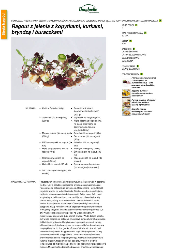 BONDUELLE / PRZEPIS / DANIA BEZGLUTENOWE, DANIE GŁÓWNE / BEZGLUTENOWE, DZICZYZNA / RAGOUT Z JELENIA Z KOPYTKAMI, KURKAMI, BRYNDZĄ I BURACZKAMI Ragout z jelenia z kopytkami, kurkami, bryndzą i buraczkami ILOŚĆ PORCJI 1 CZAS PRZYGOTOWANIA 60 MIN OCENA brak KATEGORIE DANIE GŁÓWNE DANIA BEZGLUTENOWE BEZGLUTENOWE DZICZYZNA DODANE PRZEZ DAWID ŁAGOWSKI PODOBNE PRZEPISY Filet z kaczki marynowanej z rozmarynem na buraczkach Sous - Vide zasmażanych z dodatkiem śmietany Kopytka dyniowo ziemniaczane z masłem szałwiowym Puree z selera ze stekiem z jelenia, borowikami i fasolką szparagową SKŁADNIKI: Kurki w Zalewie (100 g) Buraczki w Kostkach PAKOWANE PRÓŻNIOWO (200 g) Ziemniaki (skł. na kopytka) (600 g) Jajko (skł. na kopytka) (1 szt.) Mąka pszenna bezglutenowa na ciasto oraz trochę do Mięso z jelenia (skł. na ragout) (300 g) Liść laurowy (skł. na ragout) (2 szt.) Mąka bezglutenowa (skł. na ragout) (40 g) Czerwone wino (skł. na ragout) (30 ml) Olej (skł. na ragout) (50 ml) podsypywania (skł. na kopytka) (200 g) Cebula (skł. na ragout) (50 g) Ser bryndza (skł. na ragout) (50 g) Jałowiec (skł. na ragout) (5 szt.) Miód (skł. na ragout) (10 ml) Śmietana (skł. na ragout) (30 ml) Majeranek (skł. na ragout) (do smaku) Czerwona papryka suszona (skł. na ragout) (do smaku) Sól i pieprz (skł. na ragout) (do smaku) SPOSÓB PRZYGOTOWANIA: Przygotowanie kopytek: Ziemniaki umyć, obrać i ugotować w osolonej wodzie. Lekko ostudzić i przecisnąć przez praskę do ziemniaków. Pozostawić do całkowitego ostygnięcia. Dodać mąkę i jajko. Całość zagnieść szybko na jednolite ciasto. Ciasto może być lekko klejące. Najlepiej nie dosypywać dodatkowo mąki. Dzięki małej ilości mąki kopytka będą delikatne i puszyste. Jeśli jednak ciasto będzie się bardzo kleić, zależy to od ziemniaków i zawartości w nich skrobi, można dodać jeszcze trochę mąki. Ciasto przełożyć na stolnicę posypaną mąką. Podzielić je na 6 części (z mniejszych porcji lepiej formuje się kopytka). Z każdej części uformować wałek grubości 2,5 cm. Wałek lekko spłaszczyć i pociąć na ukośne kawałki. W międzyczasie zagotować duży garnek z wodą. Wodę dobrze posolić. Gdy woda zacznie się gotować, zmniejszyć temperaturę tak, aby woda delikatnie się gotowała. Kopytka należy gotować porcjami. Należy wkładać je ostrożnie do wody, raz przemieszać łyżką drewnianą, aby nie przykleiły się do dna garnka. Gotować chwilę, ok. 3- 4 min. od momentu wypłynięcia. Przygotowanie ragou: Mięso pokroić na trzy centymetrowe kostki, posypać solą i pieprzem, obtoczyć w mące, przyrumienić na silnie rozgrzanym oleju. Krótko przesmażyć cebulę razem z mięsem. Następnie dusić pod przykryciem w średniej temperaturze do miękkości a pod koniec dodać kurki by się poddusiły z mięsem. Mięso i kurki oddzielić od wywaru. Śmietanę wymieszaną z Kopytka z puree dyniowego z kurkami i orzechami włoskimi mąką i papryką zagęścić sos. Przegotować a następnie przecedzić i doprawić solą i pieprzem. Mięso podgrzać w sosie, ale nie gotować. Przed podaniem pozwolić, by jeszcze przez 5 minut potrawa odleżała się. Buraczki podsmażyć na patelni, dodać wino i odparować, następnie dodać miód oraz majeranek, sól i pierz. Układać kopytka a z boku buraczki i wszystko polewać ragout, na koniec dodać pokruszony ser i świeże zioła. PRODUKTY BONDUELLE UŻYTE W PRZEPISIE Kurki w Zalewie Buraczki w Kostkach PAKOWANE PRÓŻNIOWO MASA NETTO: 720 g ODCIEK: 400 g POJEMNOŚĆ: 850 ml MASA NETTO: 300 g ODCIEK: 265 g POJEMNOŚĆ: 425 ml All rights reserved projekt i realizacja Copyright © 2012-2016 Agencja Reklamowa 4 ALL Bonduelle
