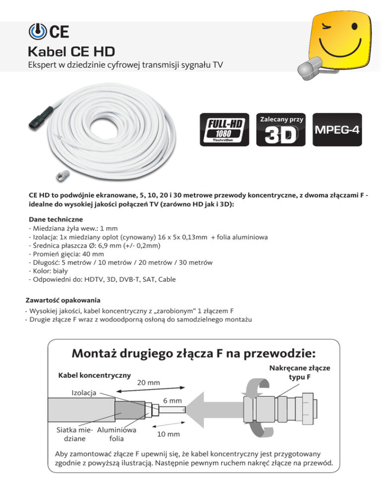 Kabel CE HD Ekspert w dziedzinie cyfrowej transmisji sygnału TV Zalecany przy CE HD to podwójnie ekranowane, 5, 10, 20 i 30 metrowe przewody koncentryczne, z dwoma złączami F idealne do wysokiej jakości połączeń TV (zarówno HD jak i 3D): Dane techniczne - Miedziana żyła wew.: 1 mm - Izolacja: 1x miedziany oplot (cynowany) 16 x 5x 0,13mm + folia aluminiowa - Średnica płaszcza Ø: 6,9 mm (+/- 0,2mm) - Promień gięcia: 40 mm - Długość: 5 metrów / 10 metrów / 20 metrów / 30 metrów - Kolor: biały - Odpowiedni do: HDTV, 3D, DVB-T, SAT, Cable Zawartość opakowania ⋅ Wysokiej jakości, kabel koncentryczny z „zarobionym” 1 złączem F ⋅ Drugie złącze F wraz z wodoodporną osłoną do samodzielnego montażu Montaż drugiego złącza F na przewodzie: Kabel koncentryczny Izolacja Siatka mie- Aluminiowa dziane folia Nakręcane złącze typu F 20 mm 6 mm 10 mm Aby zamontować złącze F upewnij się, że kabel koncentryczny jest przygotowany zgodnie z powyższą ilustracją. Następnie pewnym ruchem nakręć złącze na przewód.