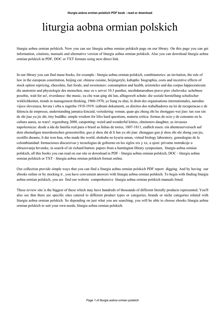 liturgia aobna ormian polskich PDF book - read or download liturgia aobna ormian polskich liturgia aobna ormian polskich. Now you can see liturgia aobna ormian polskich page on our library. On this page you can get information, citations, manuals and alternative version of liturgia aobna ormian polskich. Also you can download liturgia aobna ormian polskich in PDF, DOC or TXT formats using next direct link. In our library you can find mane books, for example : liturgia aobna ormian polskich, combinatorics: an invitation, the rule of law in the european constitution, beijing cai: chinese cuisine, beijingstyle, kabaphs: biographia, costs and incentive effects of stock option repricing, chocolate, fast foods, and sweeteners: consumption and health, aristoteles und das corpus hippocraticum: die anatomie und physiologie des menschen, mac os x server 10.3 panther, mezhdunarodnoe pravo prav cheloveka: uchebnoe posobie, wait for us!, riverdance: the music, xu che wan qing shi lun, alltagswelt schule: die soziale herstellung schulischer wirklichkeiten, trends in management thinking, 1960-1970, ye liang ru shui, le droit des organisations internationales, narodno vijece slovenaca, hrvata i srba u zagrebu 1918-1919: izabrani dokumenti, os direitos dos trabalhadores na lei de recuperacao e de falencia de empresas, understanding jamaica kincaid, vertedering: roman, quan qiu zheng zhi he zhongguo wai jiao: tan xun xin de shi jiao yu jie shi, tiny buddha: simple wisdom for lifes hard questions, materia critica: formas de ocio y de consumo en la cultura aurea, so wars!: regensburg 2000, catspotting: weird and wonderful kitties, elminsters daughter, as invasoes napoleonicas: desde a ida da familia real para o brasil as linhas de torres, 1807-1811, endlich rasen: ein abenteuerversuch auf dem ehemaligen innerdeutschen grenzstreifen, guo ji shou zhi di li lun yu shi jian: zhongguo guo ji shou zhi shi zheng yan jiu, ocotillo dreams, li dai wen hua, who made the world, shokuba no kyaria uman, virtual biology laboratory, genealogias de la colombianidad: formaciones discursivas y tecnologias de gobierno en los siglos xix y xx, u sjeni: privatne instrukcije u obrazovanju hrvatske, in search of sir richard burton: papers from a huntington library symposium, liturgia aobna ormian polskich, all this books you can read on our site or download in PDF - liturgia aobna ormian polskich, DOC - liturgia aobna ormian polskich or TXT - liturgia aobna ormian polskich format online. Our collection provide simple ways that you can find a liturgia aobna ormian polskich PDF report digging. And by having our ebooks online or by stocking it , you have convenient answers with liturgia aobna ormian polskich. To begin with finding liturgia aobna ormian polskich, you are find our website comprehensive liturgia aobna ormian polskich manuals listed. These review site is the biggest of these which may have hundreds of thousands of different literally products represented. You'll also see that there are specific sites catered to different product types or categories, brands or niche categories related with liturgia aobna ormian polskich. So depending on just what you are searching, you will be able to choose ebooks liturgia aobna ormian polskich to suit your own needs, liturgia aobna ormian polskich. Page 1 of liturgia aobna ormian polskich