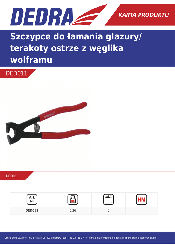 Szczypce do łamania glazury/ terakoty ostrze z węglika wolframu DED011 DED011 DED011 0,36 5 Dedra-Exim Sp. z o.o. | ul. 3 Maja 8, 05-800 Pruszków | tel.: +48 22 738 37 77 | e-mail: [email protected] | dedra.pl | pansam.pl | desconpolska.pl