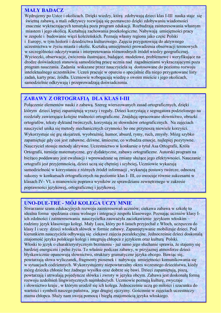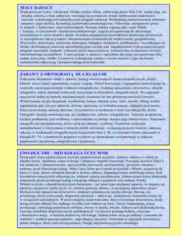 MAŁY BADACZ Wędrujemy po Ustce i okolicach. Dzięki wiedzy, którą zdobywają dzieci klas I-III nauka staje się świetną zabawą, a mali odkrywcy rozwijają się poznawczo dzięki zdobywaniu wiadomości znacznie wykraczających tematyką poza program edukacji. Rozbudzają zainteresowania własnym miastem i jego okolicą. Kształtują zachowania proekologiczne. Nabywają umiejętności pracy w zespole i budowanie więzi koleżeńskich. Poznają własny regionu jako część Polski i Europy, w tym historii i dziedzictwa kulturowego. Zajęcia przygotowują do aktywnego uczestnictwa w życiu miasta i okolic. Kształcą umiejętności prowadzenia obserwacji terenowych w szczególności odczytywania i interpretowania różnorodnych źródeł wiedzy geograficznej. Wycieczki, obserwacje, ćwiczenia ilustrujące, badające, modelowe, problemowe i weryfikujące na drodze doświadczeń stanowią samodzielną pracę ucznia nad zagadnieniami wykraczającymi poza program nauczania. Zadania wskazane przez nauczyciela są dostosowane do poziomu rozwoju intelektualnego uczestników. Uczeń pracuje w oparciu o specjalnie dla niego przygotowane listy zadań, karty prac, źródła. Uczniowie wzbogacają wiedzę o swoim mieście i jego okolicach, samodzielnie odkrywają i przeprowadzają doświadczenia. ZABAWY Z ORTOGRAFIĄ DLA KLAS I-III Połączenie elementów nauki z zabawą. Szereg wierszowanych zasad ortograficznych, dzięki którym dzieci lepiej zapamiętują wyrazy i reguły. Dzieci korzystają z segregatora podzielonego na rozdziały zawierające kolejne trudności ortograficzne. Znajdują opracowane słownictwo, obrazki ortografów, teksty dyktand twórczych, korzystają ze słowników ortograficznych. Na zajęciach nauczyciel unika się metody mechanicznych czynności bo one przynoszą niewiele korzyści. Wykorzystuje się grę skojarzeń, wyobraźnię, humor, absurd, rymy, ruch, zmysły. Mózg szybko zapamiętuje gdy coś jest zabawne, dziwne, śmieszne, co wzbudza emocje, najlepiej pozytywne. Nauczyciel stosuje metody aktywne. Uczestnictwo w konkursie o tytuł Asa Ortografii, Króla Ortografii, turnieje matematyczne, gry dydaktyczne, zabawy ortograficzne. Autorski program na bieżąco poddawany jest ewaluacji i wprowadzane są zmiany służące jego efektywności. Nauczanie ortografii jest przyjemnością, dzieci uczą się chętniej i szybciej. Uczniowie wykazują samodzielność w korzystaniu z różnych źródeł informacji , wykazują postawy twórcze, odnoszą sukcesy w konkursach ortograficznych na poziomie klas I- III, co owocuje równie sukcesami w klasach IV- VI, a mianowicie poprawa wyników ze sprawdzianu zewnętrznego w zakresie poprawności językowej, ortograficznej i językowej. UNO-DUE-TRE - MÓJ KOLEGA UCZY MNIE Stwarzanie szans edukacyjnych rozwoju zainteresowań uczniów; ciekawa zabawa w szkołę to idealna forma spędzania czasu wolnego i integracji zespołu klasowego. Poznając uczniów klasy Iich zdolności i zainteresowania nauczycielka zauważyła zaciekawienie językiem włoskim – rodzimy język klasowego kolegi. Mały Luca, który po 6 latach przyjechał z Włoch, uczęszcza do klasy I i uczy dzieci włoskich słówek w formie zabawy. Zapamiętywanie mobilizuje dzieci. Pod kierunkiem nauczyciela odbywają się ciekawe zajęcia pozalekcyjne. Jednocześnie dzieci doskonalą znajomość języka polskiego kolegi i integrują chłopca z językiem oraz kulturą Polski. Włoski to język o charakterystycznym brzmieniu - już samo jego słuchanie sprawia, że stajemy się bardziej energiczni i pełni życia. To właśnie podczas zabawy, w przyjaznej atmosferze dzieci błyskawicznie opanowują słownictwo, struktury gramatyczne języka obcego. Bawiąc się, powtarzają słowa wyliczanek, fragmenty piosenek i nabywają umiejętności komunikowania się w sytuacjach codziennych. Wykorzystujemy niepowtarzalny okres wczesnego dzieciństwa, kiedy mózg dziecka chłonie bez żadnego wysiłku oraz dobrze się bawi. Dzieci zapamiętują, piszą, powtarzają i utrwalają pojedyncze słówka i zwroty w języku obcym. Zabawa jest doskonałą formą rozwoju uzdolnień lingwistycznych najmłodszych. Uczniowie poznają kulturę, zwyczaje i słownictwo kraju , w którym urodził się ich kolega. Jednocześnie uczą go miłości i szacunku do wartości i symboli naszego państwa, jego drugiej ojczyzny. Gościnnie w zajęciach uczestniczy mama chłopca. Służy nam swoją pomocą i biegłą znajomością języka włoskiego. Ćwiczenie czyni mistrza Rozwój kompetencji językowych rozwijających porozumiewanie się, motywowanie do samodzielnej pracy nad językiem, poznawanie kultury krajów niemieckojęzycznych oraz ćwiczenie umiejętności słuchania, mówienia, czytania i pisania. Uczniowie rozwijają swoje pasje. Aktywnie poznają język naszych sąsiadów, doskonalą sprawność językową,. W przyjaznej atmosferze dzieci błyskawicznie opanowują słownictwo, struktury gramatyczne języka obcego. Wśród różnych metod aktywizujących, za najbardziej skuteczną ze względu na stopień przyswajania treści uważane są gry i zabawy dydaktyczne. Poza tym nauczycielka stosuje metodę projektu i stacji. Zadania dobierane są do możliwości i wiedzy ucznia. Nauczyciel podaje źródła, z których uczeń może korzystać w rozwijaniu swoich uzdolnień. Uczniowie poszerzają słownictwo i struktury gramatyczne, poznają dostępne źródła dające zasoby językowe. Sukcesy: Ogólnopolska Olimpiada Języka Niemieckiego OLIMPUS 2014 laureat 1 miejsce w kraju (Dyplom Grawerowany), 3miejsce w kraju, Ogólnopolski Konkurs Języka Niemieckiego MULTITEST 2013 laureat 9 miejsce w kraju, Ogólnopolski Konkurs Języka Niemieckiego DEUTSCHFREUND 2013 laureat 1 miejsce w województwie pomorskim, Ogólnopolski Konkurs Języka Niemieckiego GALILEO 2014 laureat 9 miejsce w kraju, Ogólnopolski Konkurs Języka Niemieckiego ALBUS 2014 laureat 9 miejsce w kraju, 3 wyróżnienia, Ogólnopolski Konkurs Języ