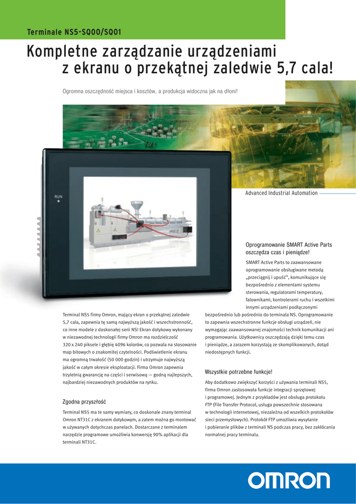 Terminale NS5-SQ00/SQ01 Kompletne zarza˛dzanie urza˛dzeniami z ekranu o przeka˛tnej zaledwie 5,7 cala! Ogromna oszczędność miejsca i kosztów, a produkcja widoczna jak na dłoni! Advanced Industrial Automation Oprogramowanie SMART Active Parts oszczędza czas i pieniądze! SMART Active Parts to zaawansowane oprogramowanie obsługiwane metodą „przeciągnij i upuść”, komunikujące się bezpośrednio z elementami systemu sterowania, regulatorami temperatury, falownikami, kontrolerami ruchu i wszelkimi innymi urządzeniami podłączonymi Terminal NS5 firmy Omron, mający ekran o przekątnej zaledwie bezpośrednio lub pośrednio do terminala NS. Oprogramowanie 5,7 cala, zapewnia tę samą najwyższą jakość i wszechstronność, to zapewnia wszechstronne funkcje obsługi urządzeń, nie co inne modele z doskonałej serii NS! Ekran dotykowy wykonany wymagając zaawansowanej znajomości technik komunikacji ani w niezawodnej technologii firmy Omron ma rozdzielczość programowania. Użytkownicy oszczędzają dzięki temu czas 320 x 240 piksele i głębię 4096 kolorów, co pozwala na stosowanie i pieniądze, a zarazem korzystają ze skomplikowanych, dotąd map bitowych o znakomitej czytelności. Podświetlenie ekranu niedostępnych funkcji. ma ogromną trwałość (50 000 godzin) i utrzymuje najwyższą jakość w całym okresie eksploatacji. Firma Omron zapewnia trzyletnią gwarancję na części i serwisową — godną najlepszych, Wszystkie potrzebne funkcje! najbardziej niezawodnych produktów na rynku. Aby dodatkowo zwiększyć korzyści z używania terminali NS5, firma Omron zastosowała funkcje integracji sprzętowej Zgodna przyszłość i programowej. Jednym z przykładów jest obsługa protokołu FTP (File Transfer Protocol, usługa powszechnie stosowana Terminal NS5 ma te samy wymiary, co doskonale znany terminal w technologii internetowej, niezależna od wszelkich protokołów Omron NT31C z ekranem dotykowym, a zatem można go montować sieci przemysłowych). Protokół FTP umożliwia wysyłanie w używanych dotychczas panelach. Dostarczane z terminalem i pobieranie plików z terminali NS podczas pracy, bez zakłócania narzędzie programowe umożliwia konwersję 90% aplikacji dla normalnej pracy terminalu. terminali NT31C. Przykłady możliwości oprogramowania SMART Active Parts: • Monitorowanie komunikacji sieciowej • Wykrywanie usterek poszczególnych rozproszonych podrzędnych modułów We/Wy • Konfigurowanie ustawień modułów kontroli ruchu • Wyświetlanie wartości z niezależnych regulatorów temperatury • Sterowanie falownikami firmy Omron • Natychmiastowe reagowanie na sygnały alarmowe z jednostek CPU sterowników CJ1 i CS1 • Nadzorowanie przekaźników bezpieczeństwa firmy Omron Narzędzie do kompletnego zarządzania urządzeniami Praca z programem SMART Active Parts jest prosta. połączonych urządzeń. W komunikatach można Gotowe składniki oprogramowania wystarczy umieścić łącza do wskazanych przez użytkownika przeciągnąć na ekran terminalu NS5. procedur rozwiązywania problemów. Do skonfigurowania komunikacji z fizycznymi Procedury rozwiązywania problemów o dowolnym składnikami sieci wystarcza naciśnięcie kilku formacie pozwalają umieścić w terminalu NS5 firmy klawiszy . Wszelkie dane potrzebne do codziennej Omron wszelkie niezbędne informacje związane pracy i konserwacji są wyświetlane na ekranie. z eksploatacją i obsługą urządzeń. W ten sposób W razie potrzeby wyświetlane są na ekranie terminal NS5 zapewnia kompletne zarządzanie pomocne komunikaty z terminali We/Wy i innych urządzeniami. • Prezentacja obrazu z kamery systemów wizyjnych firmy Omron Opis produktu Kolor Z obsługą sieci Ethernet NS5-SQ00-V1 Terminal 5,7 cala typu STN, rozdzielczość 320*240 Kość słoniowa Nie NS5-SQ00B-V1 Terminal 5,7 cala typu STN, rozdzielczość 320*240 Czarny Nie NS5-SQ01-V1 Terminal 5,7 cala typu STN, rozdzielczość 320*240 Kość słoniowa Tak NS5-SQ01B-V1 Terminal 5,7 cala typu STN, rozdzielczość 320*240 Czarny Tak NS-NSDC1-V5 Oprogramowanie NS-Designer do tworzenia ekranów, wersja 5 OMRON EUROPE B.V. Wegalaan 67-69, NL-2132 JD, Hoofddorp, Holandia. Tel: +31 (0) 23 568 13 00 Fax: +31 (0) 23 568 13 88 www.europe.omron.com POLSKA Omron Electronics Sp. z o.o. ul. Mariana Sengera “Cichego” 1, 02-790 Warszawa Tel: +48 (0) 22 645 78 60 Fax: +48 (0) 22 645 78 63 www.omron.com.pl Autoryzowany dystrybutor: SF2P_NS5_PL01_0304 Nazwa produktu Omron Europe BV i/lub jej firmy zależne i stowarzyszone dokładają wszelkich starań, tym niemniej nie gwarantują w jakikolwiek sposób poprawności ani kompletności informacji zawartych w niniejszym dokumencie. Zastrzegamy sobie prawo do dokonywania zmian w dowolnej chwili i bez powiadomienia. Specyfikacja