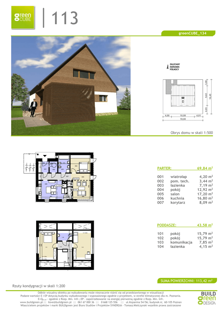 113 greenCUBE_134 ZALECANY KIERUNEK PÓŁNOCY 9,42 4,03 16,45 3,00 N 4,00 10,99 4,01 19,00 195 215 150 384 004 215 50 385 Obrys domu w skali 1:500 Obrys domu w skali 1:500 001 003 122 002 007 005 Skład drewna 006 354 492 Piec chlebowy kominek 481 161 17 386 PARTER: 69,84 m2 001 002 003 004 005 006 007 4,20 m2 3,44 m2 7,19 m2 12,92 m2 17,20 m2 16,80 m2 8,09 m2 wiatrołap pom. tech. łazienka pokój salon kuchnia korytarz 124 1 020 PODDASZE: 43,58 m2 101 102 103 104 15,79 m2 15,79 m2 7,85 m2 4,15 m2 49 h=1,40m 151 468 565 1.01 1.03 1.02 pokój pokój komunikacja łazienka 342 49 h=1,90m h=1,40m 285 339 121 339 194 h=1,90m 1.04 SUMA POWIERZCHNI: 113,42 m2 Rzuty kondygnacji w skali 1:200 Odbiór wizualny obiektu po wybudowaniu może nieznacznie różnić się od przedstawionego w wizualizacji Podane wartości E i EP dotyczą budynku wybudowanego i wyposażonego zgodnie z projektem, w strefie klimatycznej dla m. Poznania. E=QH,nd - zgodnie z Rozp. Min. Infr.; EP - zapotrzebowanie na energię pierwotną zgodnie z Rozp. Min. Infr. www.buildgreen.pl ::: [email protected] ::: 061 67 000 36 ::: 0 668 125 556 ::: ul.Kopanina 54/56; budynek A; 60-105 Poznan Włascicielem projektów i marki BUILDgreen jest Biuro Studiów i Projektów SYNERGIA - Tomasz Mielczynski wszelkie prawa zastrzezone 113 greenCUBE_113 Powierzchnia użytkowa: 113,42 m2 Powierzchnia zabudowy: 106,19 m2 Kubatura: 406,68 m3 Wysokość do kalenicy: 8,15 m Rodzaj dachu: dwuspadowy Kąt nachylenia dachu: 45 stopni Minimalne wymiary działki: 19,00x16,45 m Współczynnik E = 10,0 kWh/m2 Współczynnik Ek = 28,7 kWh/m2 Współczynnik EP = 30,8 kWh/m2 Niewielki, kompaktowy dom jednorodzinny. Przeznaczony dla 34 osobowej rodziny. Świetnie nadaje się do wybudowania na niewielkiej działce z wjazdem od północy lub zachodu. Budynek został zaplanowany tak aby pomieszczenia aktywności dziennej wystawione były na operację słoneczną. Z salonu oraz sypialni, która może zostać opcjonalnie zaaranżowana na gabinet zaprojektowano wyjścia na taras. W wiatrołapie znajduje się dodatkowe wejście do pomieszczenia gospodarczego, gdzie jest miejsce na centralę wentylacyjną, zbiornik buforowy i piec. W przestronnej kuchni zaprojektowano część jadalną oraz miejsce na piec chlebowy. Pod schodami prowadzącymi na piętro przewidziano palenisko kominka oraz przestrzeń na składowanie drewna. Salon doświetlony jest przez duże okno narożnikowe. Na poddaszu znajdują się dwie sypialnie i dodatkową łazienka. Odbiór wizualny obiektu po wybudowaniu może nieznacznie różnić się od przedstawionego w wizualizacji Podane wartości E i EP dotyczą budynku wybudowanego i wyposażonego zgodnie z projektem, w strefie klimatycznej dla m. Poznania. E=QH,nd - zgodnie z Rozp. Min. Infr.; EP - zapotrzebowanie na energię pierwotną zgodnie z Rozp. Min. Infr. www.buildgreen.pl ::: [email protected] ::: 061 67 000 36 ::: 0 668 125 556 ::: ul.Kopanina 54/56; budynek A; 60-105 Poznan Włascicielem projektów i marki BUILDgreen jest Biuro Studiów i Projektów SYNERGIA - Tomasz Mielczynski wszelkie prawa zastrzezone