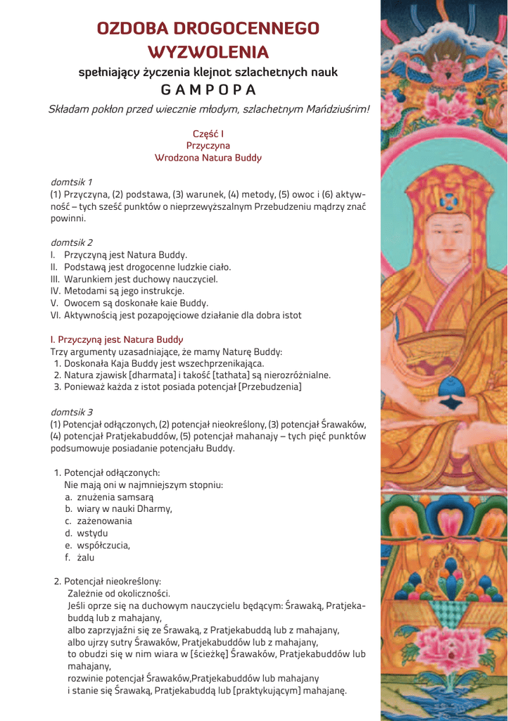 OZDOBA DROGOCENNEGO WYZWOLENIA spełniający życzenia klejnot szlachetnych nauk GAMPOPA Składam pokłon przed wiecznie młodym, szlachetnym Mańdziuśrim! Część I Przyczyna Wrodzona Natura Buddy domtsik 1 (1) Przyczyna, (2) podstawa, (3) warunek, (4) metody, (5) owoc i (6) aktywność – tych sześć punktów o nieprzewyższalnym Przebudzeniu mądrzy znać powinni. domtsik 2 I. Przyczyną jest Natura Buddy. II. Podstawą jest drogocenne ludzkie ciało. III. Warunkiem jest duchowy nauczyciel. IV.Metodami są jego instrukcje. V. Owocem są doskonałe kaie Buddy. VI.Aktywnością jest pozapojęciowe działanie dla dobra istot I. Przyczyną jest Natura Buddy Trzy argumenty uzasadniające, że mamy Naturę Buddy: 1.doskonała Kaja Buddy jest wszechprzenikająca. 2.Natura zjawisk [dharmata] i takość [tathata] są nierozróżnialne. 3.Ponieważ każda z istot posiada potencjał [Przebudzenia] domtsik 3 (1) Potencjał odłączonych, (2) potencjał nieokreślony, (3) potencjał Śrawaków, (4) potencjał Pratjekabuddów, (5) potencjał mahanajy – tych pięć punktów podsumowuje posiadanie potencjału Buddy. 1.Potencjał odłączonych: Nie mają oni w najmniejszym stopniu: a. znużenia samsarą b. wiary w nauki Dharmy, c. zażenowania d. wstydu e. współczucia, f. żalu 2.Potencjał nieokreślony: Zależnie od okoliczności. Jeśli oprze się na duchowym nauczycielu będącym: Śrawaką, Pratjekabuddą lub z mahajany, albo zaprzyjaźni się ze Śrawaką, z Pratjekabuddą lub z mahajany, albo ujrzy sutry Śrawaków, Pratjekabuddów lub z mahajany, to obudzi się w nim wiara w [ścieżkę] Śrawaków, Pratjekabuddów lub mahajany, rozwinie potencjał Śrawaków,Pratjekabuddów lub mahajany i stanie się Śrawaką, Pratjekabuddą lub [praktykującym] mahajanę. 3. Potencjał Śrawaki: a. są przerażeni samsarą b. wierzą w nirwanę c. mają niewiele współczucia 4. Potencjał Pratjekabuddy: a. są przerażeni samsarą b. wierzą w nirwanę c. mają niewiele współczucia d. są dumni e. nie mówią o nauczycielach f. lubią samotność Potencjał mahajany domtsik 4 (1) Rodzaje, (2) ich istota, (3) wyliczanie, (4) powód dla którego jest wyższy od innych, (5) sposoby przejawiania się, (6) oznaki – te sześć punktów podsumowuje potencjał mahajany. 1. Rodzaje i istota a. Potencjał naturalnie obecny – jest zdolnością rozwinięcia właściwości Buddy, które są od zawsze w ostatecznej naturze (dharmacie). b. Potencjał doskonałego spełnienia – jest zdolnością rozwinięcia właściwości Buddy, które osiąga się w wyniku rozwijania korzeni zasług i jest to Sambhogakaja i Nirmanakaja. 2. Wyliczanie synonimów – potencjał, nasienie, sfera, natura, istota 3. Powód dla którego potencjał mahajany jest wznioślejszy od innych. 4. Sposoby przejawiania się potencjału mahajany: a. potencjał przebudzony – owoc został całkowicie osiągnięty i oznaki są widoczne, b. potencjał nie przebudzony – owoc nie został całkowicie osiągnięty i oznaki nie są widoczne. Cztery przeciwstawne okoliczności: 1. Niesprzyjające narodziny. 2. Brak nawykowych skłonności. 3. Wkroczenie na błędne ścieżki. 4. Posiadanie ciężkich zaciemnień. dwie sprzyjające okoliczności: 1. Zewnętrzna: dharma jest nauczana. 2. Wewnętrzna: odpowiednie ukierunkowanie umysłu. 5. Oznaki potencjału mahajany Z „Sutry dziesięciu dharm”: Potencjał mądrych Bodhisattwów Rozpoznaje się po istnieniu oznak, Podobnie widząc dym, wiemy, że musi być ogień, A gdzie są ptaki wodne, tam musi być woda. dym jest oznaką tego, że jest ogień. Ptaki wodne są oznaką tego, że jest woda. Podobnie oznaką Bodhisattwy jest to, Że nawet bez ćwiczenia się w antidotach, ich ciało, mowa i umysł są łagodne, Mają niewiele fałszu i obłudy, Okazują dobroć istotom. Związek Buddyjski Bencien Karma Kamtsang Poznań, ul. Św. Marcin 34/25 tel. 602 703 245, [email protected], www.buddyzm-poznan.pl