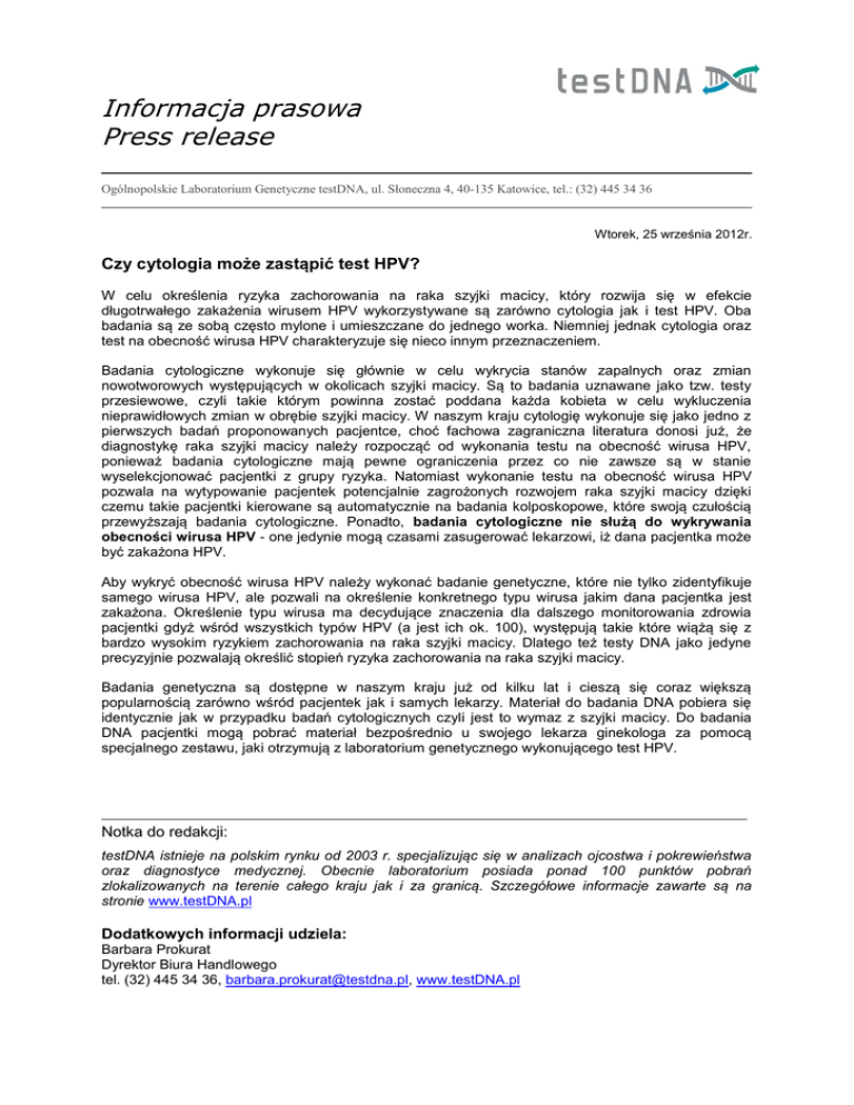 Informacja prasowa Press release Ogólnopolskie Laboratorium Genetyczne testDNA, ul. Słoneczna 4, 40-135 Katowice, tel.: (32) 445 34 36 Wtorek, 25 września 2012r. Czy cytologia może zastąpić test HPV? W celu określenia ryzyka zachorowania na raka szyjki macicy, który rozwija się w efekcie długotrwałego zakażenia wirusem HPV wykorzystywane są zarówno cytologia jak i test HPV. Oba badania są ze sobą często mylone i umieszczane do jednego worka. Niemniej jednak cytologia oraz test na obecność wirusa HPV charakteryzuje się nieco innym przeznaczeniem. Badania cytologiczne wykonuje się głównie w celu wykrycia stanów zapalnych oraz zmian nowotworowych występujących w okolicach szyjki macicy. Są to badania uznawane jako tzw. testy przesiewowe, czyli takie którym powinna zostać poddana każda kobieta w celu wykluczenia nieprawidłowych zmian w obrębie szyjki macicy. W naszym kraju cytologię wykonuje się jako jedno z pierwszych badań proponowanych pacjentce, choć fachowa zagraniczna literatura donosi już, że diagnostykę raka szyjki macicy należy rozpocząć od wykonania testu na obecność wirusa HPV, ponieważ badania cytologiczne mają pewne ograniczenia przez co nie zawsze są w stanie wyselekcjonować pacjentki z grupy ryzyka. Natomiast wykonanie testu na obecność wirusa HPV pozwala na wytypowanie pacjentek potencjalnie zagrożonych rozwojem raka szyjki macicy dzięki czemu takie pacjentki kierowane są automatycznie na badania kolposkopowe, które swoją czułością przewyższają badania cytologiczne. Ponadto, badania cytologiczne nie służą do wykrywania obecności wirusa HPV - one jedynie mogą czasami zasugerować lekarzowi, iż dana pacjentka może być zakażona HPV. Aby wykryć obecność wirusa HPV należy wykonać badanie genetyczne, które nie tylko zidentyfikuje samego wirusa HPV, ale pozwali na określenie konkretnego typu wirusa jakim dana pacjentka jest zakażona. Określenie typu wirusa ma decydujące znaczenia dla dalszego monitorowania zdrowia pacjentki gdyż wśród wszystkich typów HPV (a jest ich ok. 100), występują takie które wiążą się z bardzo wysokim ryzykiem zachorowania na raka szyjki macicy. Dlatego też testy DNA jako jedyne precyzyjnie pozwalają określić stopień ryzyka zachorowania na raka szyjki macicy. Badania genetyczna są dostępne w naszym kraju już od kilku lat i cieszą się coraz większą popularnością zarówno wśród pacjentek jak i samych lekarzy. Materiał do badania DNA pobiera się identycznie jak w przypadku badań cytologicznych czyli jest to wymaz z szyjki macicy. Do badania DNA pacjentki mogą pobrać materiał bezpośrednio u swojego lekarza ginekologa za pomocą specjalnego zestawu, jaki otrzymują z laboratorium genetycznego wykonującego test HPV. Notka do redakcji: testDNA istnieje na polskim rynku od 2003 r. specjalizując się w analizach ojcostwa i pokrewieństwa oraz diagnostyce medycznej. Obecnie laboratorium posiada ponad 100 punktów pobrań zlokalizowanych na terenie całego kraju jak i za granicą. Szczegółowe informacje zawarte są na stronie www.testDNA.pl Dodatkowych informacji udziela: Barbara Prokurat Dyrektor Biura Handlowego tel. (32) 445 34 36, [email protected], www.testDNA.pl