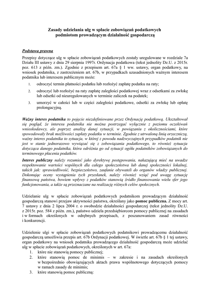 Zasady udzielania ulg w spłacie zobowiązań podatkowych podmiotom prowadzącym działalność gospodarczą Podstawa prawna Przepisy dotyczące ulg w spłacie zobowiązań podatkowych zostały uregulowane w rozdziale 7a Działu III ustawy z dnia 29 sierpnia 1997r. Ordynacja podatkowa (tekst jednolity Dz.U. z 2015r. poz. 613 z późn. zm.). Zgodnie z przepisem art. 67a § 1 ww. ustawy, organ podatkowy, na wniosek podatnika, z zastrzeżeniem art. 67b, w przypadkach uzasadnionych ważnym interesem podatnika lub interesem publicznym może: 1. odroczyć termin płatności podatku lub rozłożyć zapłatę podatku na raty; 2. odroczyć lub rozłożyć na raty zapłatę zaległości podatkowej wraz z odsetkami za zwłokę lub odsetki od nieuregulowanych w terminie zaliczek na podatek; 3. umorzyć w całości lub w części zaległości podatkowe, odsetki za zwłokę lub opłatę prolongacyjną. Ważny interes podatnika to pojęcie niezdefiniowane przez Ordynację podatkową. Ukształtował się pogląd, że interesu podatnika nie można postrzegać wyłącznie z poziomu oczekiwań wnioskodawcy, ale poprzez analizę danej sytuacji, w powiązaniu z okolicznościami, które spowodowały brak możliwości zapłaty podatku w terminie. Zgodnie z utrwaloną linią orzeczniczą, ważny interes podatnika to sytuacja, w której z powodu nadzwyczajnych przypadków podatnik nie jest w stanie jednorazowo wywiązać się z zobowiązania podatkowego, to również sytuacja dotycząca danego podatnika, która odróżnia go od sytuacji ogółu podatników zobowiązanych do terminowego płacenia podatków. Interes publiczny należy rozumieć jako dyrektywę postępowania, nakazującą mieć na uwadze respektowanie wartości wspólnych dla całego społeczeństwa lub danej społeczności lokalnej, takich jak: sprawiedliwość, bezpieczeństwo, zaufanie obywateli do organów władzy publicznej. Dokonując oceny wystąpienia tych przesłanek, należy również wziąć pod uwagę sytuację finansową państwa, bowiem wpływy z podatków stanowią źródło finansowania wielu sfer jego funkcjonowania, a także są przeznaczane na realizację różnych celów społecznych. Udzielanie ulg w spłacie zobowiązań podatkowych podatnikom prowadzącym działalność gospodarczą stanowi przejaw aktywności państwa, określany jako pomoc publiczna. Z mocy art. 7 ustawy z dnia 2 lipca 2004 r. o swobodzie działalności gospodarczej (tekst jednolity Dz.U. z 2015r. poz. 584 z późn. zm.), państwo udziela przedsiębiorcom pomocy publicznej na zasadach i w formach określonych w odrębnych przepisach, z poszanowaniem zasad równości i konkurencji. Udzielenie ulgi w spłacie zobowiązań podatkowych podatnikowi prowadzącemu działalność gospodarczą umożliwia przepis art. 67b Ordynacji podatkowej. W świetle art. 67b § 1 tej ustawy, organ podatkowy na wniosek podatnika prowadzącego działalność gospodarczą może udzielać ulg w spłacie zobowiązań podatkowych, określonych w art. 67a: 1. które nie stanowią pomocy publicznej; 2. które stanowią pomoc de minimis – w zakresie i na zasadach określonych w bezpośrednio obowiązujących aktach prawa wspólnotowego dotyczących pomocy w ramach zasady de minimis; 3. które stanowią pomoc publiczną: a) udzielaną w celu naprawienia szkód wyrządzonych przez klęski żywiołowe lub inne nadzwyczajne zdarzenia, b) udzielaną w celu zapobieżenia lub likwidacji poważnych zakłóceń w gospodarce o charakterze ponadsektorowym, c) udzielaną w celu wsparcia krajowych przedsiębiorców działających w ramach przedsięwzięcia gospodarczego podejmowanego w interesie europejskim, d) udzielaną w celu promowania i wspierania kultury, dziedzictwa narodowego, nauki i oświaty, e) będącą rekompensatą za realizację usług świadczonych w ogólnym interesie gospodarczym powierzonych na podstawie odrębnych przepisów, f) na szkolenia, g) na zatrudnienie, h) na rozwój małych i średnich przedsiębiorstw, i) na restrukturyzację, j) na ochronę środowiska, k) na prace badawczo-rozwojowe, l) regionalną, m) udzielaną na inne przeznaczenia określone na podstawie § 6 przez Radę Ministrów. Pomoc publiczna, zgodnie z art. 107 Traktatu o funkcjonowaniu Unii Europejskiej, to każde wsparcie (ulgi w spłacie zobowiązań podatkowych, dotacje, preferencyjne kredyty, gwarancje itp.), które spełnia jednocześnie 4 przesłanki: pomoc jest udzielana przez państwo lub ze środków publicznych, beneficjent uzyskuje przysporzenie na warunkach korzystniejszych od oferowanych na rynku, pomoc ma charakter selektywny, czyli preferujący określoną grupę przedsiębiorców lub produkcję towarów, pomoc zakłóca lub grozi zakłóceniem konkurencji oraz wpływa na wymianę handlową pomiędzy Państwami Członkowskimi Wspólnoty. Wsparcie, które stanowi pomoc publiczną w rozumieniu art. 107 Traktatu o funkcjonowaniu Unii Europejskiej podlega przepisom ustawy z dnia 30 kwietnia 2004r. o postępowaniu w sprawach dotyczących pomocy publicznej (tekst jednolity Dz.U. z 2007r. Nr 59 poz. 404 z późn. zm.). Szczegółowe informacje dotyczące warunków udzielania pomocy publicznej dla przedsiębiorców znajdują się na stronie: www.uokik.gov.pl. Wysokość pomocy de minimis uzyskanej przez przedsiębiorcę można w każdej chwili monitorować, wchodząc na stronę: www.uokik.gov.pl, zakładka „Pomoc publiczna”, temat „Dane o udzieleniu pomocy – SUDOP”. Wszczęcie postępowania podatkowego Postępowanie podatkowe w sprawie udzielania ulg w spłacie zobowiązań podatkowych, co do zasady, wszczynane jest na wniosek podatnika, płatnika, inkasenta, spadkobiercy czy osoby trzeciej. Zgodnie z art. 168 § 2 ustawy – Ordynacja podatkowa, podanie powinno zawierać co najmniej treść żądania, wskazanie osoby, od której pochodzi oraz jej adresu (miejsca zamieszkania lub pobytu, siedziby albo miejsca prowadzenia działalności), a także czynić zadość innym wymogom ustalonym w