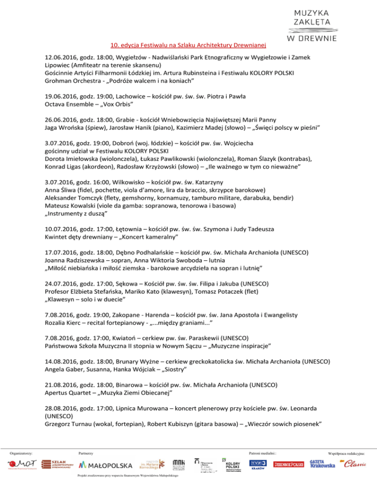 10. edycja Festiwalu na Szlaku Architektury Drewnianej 12.06.2016, godz. 18:00, Wygiełzów - Nadwiślański Park Etnograficzny w Wygiełzowie i Zamek Lipowiec (Amfiteatr na terenie skansenu) Gościnnie Artyści Filharmonii Łódzkiej im. Artura Rubinsteina i Festiwalu KOLORY POLSKI Grohman Orchestra - „Podróże walcem i na koniach” 19.06.2016, godz. 19:00, Lachowice – kościół pw. św. św. Piotra i Pawła Octava Ensemble – „Vox Orbis” 26.06.2016, godz. 18:00, Grabie - kościół Wniebowzięcia Najświętszej Marii Panny Jaga Wrońska (śpiew), Jarosław Hanik (piano), Kazimierz Madej (słowo) – „Święci polscy w pieśni” 3.07.2016, godz. 19:00, Dobroń (woj. łódzkie) – kościół pw. św. Wojciecha gościnny udział w Festiwalu KOLORY POLSKI Dorota Imiełowska (wiolonczela), Łukasz Pawlikowski (wiolonczela), Roman Ślazyk (kontrabas), Konrad Ligas (akordeon), Radosław Krzyżowski (słowo) – „Ile ważnego w tym co nieważne” 3.07.2016, godz. 16:00, Wilkowisko – kościół pw. św. Katarzyny Anna Śliwa (fidel, pochette, viola d’amore, lira da braccio, skrzypce barokowe) Aleksander Tomczyk (flety, gemshorny, kornamuzy, tamburo militare, darabuka, bendir) Mateusz Kowalski (viole da gamba: sopranowa, tenorowa i basowa) „Instrumenty z duszą” 10.07.2016, godz. 17:00, Łętownia – kościół pw. św. św. Szymona i Judy Tadeusza Kwintet dęty drewniany – „Koncert kameralny” 17.07.2016, godz. 18:00, Dębno Podhalańskie – kościół pw. św. Michała Archanioła (UNESCO) Joanna Radziszewska – sopran, Anna Wiktoria Swoboda – lutnia „Miłość niebiańska i miłość ziemska - barokowe arcydzieła na sopran i lutnię” 24.07.2016, godz. 17:00, Sękowa – Kościół pw. św. św. Filipa i Jakuba (UNESCO) Profesor Elżbieta Stefańska, Mariko Kato (klawesyn), Tomasz Potaczek (flet) „Klawesyn – solo i w duecie” 7.08.2016, godz. 19:00, Zakopane - Harenda – kościół pw. św. Jana Apostoła i Ewangelisty Rozalia Kierc – recital fortepianowy - „...między graniami...” 7.08.2016, godz. 17:00, Kwiatoń – cerkiew pw. św. Paraskewii (UNESCO) Państwowa Szkoła Muzyczna II stopnia w Nowym Sączu – „Muzyczne inspiracje” 14.08.2016, godz. 18:00, Brunary Wyżne – cerkiew greckokatolicka św. Michała Archanioła (UNESCO) Angela Gaber, Susanna, Hanka Wójciak – „Siostry” 21.08.2016, godz. 18:00, Binarowa – kościół pw. św. Michała Archanioła (UNESCO) Apertus Quartet – „Muzyka Ziemi Obiecanej” 28.08.2016, godz. 17:00, Lipnica Murowana – koncert plenerowy przy kościele pw. św. Leonarda (UNESCO) Grzegorz Turnau (wokal, fortepian), Robert Kubiszyn (gitara basowa) – „Wieczór sowich piosenek” Organizatorzy: Partnerzy Projekt zrealizowano przy wsparciu finansowym Województwa Małopolskiego Patroni medialni:: Współpraca redakcyjna: