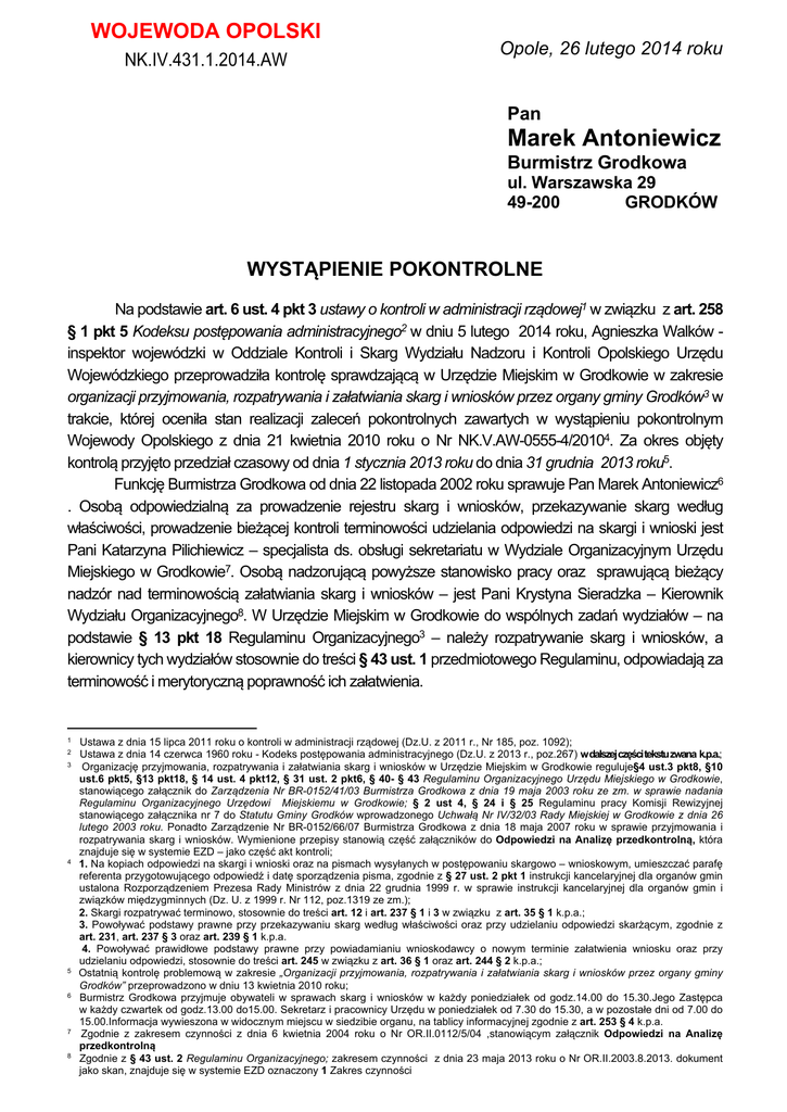 WOJEWODA OPOLSKI NK.IV.431.1.2014.AW Opole, 26 lutego 2014 roku Pan Marek Antoniewicz Burmistrz Grodkowa ul. Warszawska 29 49-200 GRODKÓW WYSTĄPIENIE POKONTROLNE Na podstawie art. 6 ust. 4 pkt 3 ustawy o kontroli w administracji rządowej1 w związku z art. 258 § 1 pkt 5 Kodeksu postępowania administracyjnego2 w dniu 5 lutego 2014 roku, Agnieszka Walków inspektor wojewódzki w Oddziale Kontroli i Skarg Wydziału Nadzoru i Kontroli Opolskiego Urzędu Wojewódzkiego przeprowadziła kontrolę sprawdzającą w Urzędzie Miejskim w Grodkowie w zakresie organizacji przyjmowania, rozpatrywania i załatwiania skarg i wniosków przez organy gminy Grodków3 w trakcie, której oceniła stan realizacji zaleceń pokontrolnych zawartych w wystąpieniu pokontrolnym Wojewody Opolskiego z dnia 21 kwietnia 2010 roku o Nr NK.V.AW-0555-4/20104. Za okres objęty kontrolą przyjęto przedział czasowy od dnia 1 stycznia 2013 roku do dnia 31 grudnia 2013 roku5. Funkcję Burmistrza Grodkowa od dnia 22 listopada 2002 roku sprawuje Pan Marek Antoniewicz6 . Osobą odpowiedzialną za prowadzenie rejestru skarg i wniosków, przekazywanie skarg według właściwości, prowadzenie bieżącej kontroli terminowości udzielania odpowiedzi na skargi i wnioski jest Pani Katarzyna Pilichiewicz – specjalista ds. obsługi sekretariatu w Wydziale Organizacyjnym Urzędu Miejskiego w Grodkowie7. Osobą nadzorującą powyższe stanowisko pracy oraz sprawującą bieżący nadzór nad terminowością załatwiania skarg i wniosków – jest Pani Krystyna Sieradzka – Kierownik Wydziału Organizacyjnego8. W Urzędzie Miejskim w Grodkowie do wspólnych zadań wydziałów – na podstawie § 13 pkt 18 Regulaminu Organizacyjnego3 – należy rozpatrywanie skarg i wniosków, a kierownicy tych wydziałów stosownie do treści § 43 ust. 1 przedmiotowego Regulaminu, odpowiadają za terminowość i merytoryczną poprawność ich załatwienia. 1 2 3 4 5 6 7 8 Ustawa z dnia 15 lipca 2011 roku o kontroli w administracji rządowej (Dz.U. z 2011 r., Nr 185, poz. 1092); Ustawa z dnia 14 czerwca 1960 roku - Kodeks postępowania administracyjnego (Dz.U. z 2013 r., poz.267) w dalszej części tekstu zwana k.p.a.; Organizację przyjmowania, rozpatrywania i załatwiania skarg i wniosków w Urzędzie Miejskim w Grodkowie reguluje§4 ust.3 pkt8, §10 ust.6 pkt5, §13 pkt18, § 14 ust. 4 pkt12, § 31 ust. 2 pkt6, § 40- § 43 Regulaminu Organizacyjnego Urzędu Miejskiego w Grodkowie, stanowiącego załącznik do Zarządzenia Nr BR-0152/41/03 Burmistrza Grodkowa z dnia 19 maja 2003 roku ze zm. w sprawie nadania Regulaminu Organizacyjnego Urzędowi Miejskiemu w Grodkowie; § 2 ust 4, § 24 i § 25 Regulaminu pracy Komisji Rewizyjnej stanowiącego załącznika nr 7 do Statutu Gminy Grodków wprowadzonego Uchwałą Nr IV/32/03 Rady Miejskiej w Grodkowie z dnia 26 lutego 2003 roku. Ponadto Zarządzenie Nr BR-0152/66/07 Burmistrza Grodkowa z dnia 18 maja 2007 roku w sprawie przyjmowania i rozpatrywania skarg i wniosków. Wymienione przepisy stanowią część załączników do Odpowiedzi na Analizę przedkontrolną, która znajduje się w systemie EZD – jako część akt kontroli; 1. Na kopiach odpowiedzi na skargi i wnioski oraz na pismach wysyłanych w postępowaniu skargowo – wnioskowym, umieszczać parafę referenta przygotowującego odpowiedź i datę sporządzenia pisma, zgodnie z § 27 ust. 2 pkt 1 instrukcji kancelaryjnej dla organów gmin ustalona Rozporządzeniem Prezesa Rady Ministrów z dnia 22 grudnia 1999 r. w sprawie instrukcji kancelaryjnej dla organów gmin i związków międzygminnych (Dz. U. z 1999 r. Nr 112, poz.1319 ze zm.); 2. Skargi rozpatrywać terminowo, stosownie do treści art. 12 i art. 237 § 1 i 3 w związku z art. 35 § 1 k.p.a.; 3. Powoływać podstawy prawne przy przekazywaniu skarg według właściwości oraz przy udzielaniu odpowiedzi skarżącym, zgodnie z art. 231, art. 237 § 3 oraz art. 239 § 1 k.p.a. 4. Powoływać prawidłowe podstawy prawne przy powiadamianiu wnioskodawcy o nowym terminie załatwienia wniosku oraz przy udzielaniu odpowiedzi, stosownie do treści art. 245 w związku z art. 36 § 1 oraz art. 244 § 2 k.p.a.; Ostatnią kontrolę problemową w zakresie „Organizacji przyjmowania, rozpatrywania i załatwiania skarg i wniosków przez organy gminy Grodków” przeprowadzono w dniu 13 kwietnia 2010 roku; Burmistrz Grodkowa przyjmuje obywateli w sprawach skarg i wniosków w każdy poniedziałek od godz.14.00 do 15.30.Jego Zastępca w każdy czwartek od godz.13.00 do15.00. Sekretarz i pracownicy Urzędu w poniedziałek od 7.30 do 15.30, a w pozostałe dni od 7.00 do 15.00.Informacja wywieszona w widocznym miejscu w siedzibie organu, na tablicy informacyjnej zgodnie z art. 253 § 4 k.p.a. Zgodnie z zakresem czynności z dnia 6 kwietnia 2004 roku o Nr OR.II.0112/5/04 ,stanowiącym załącznik Odpowiedzi na Analizę przedkontrolną Zgodnie z § 43 ust. 2 Regulaminu Organizacyjnego; zakresem czynności z dnia 23 maja 2013 roku o Nr OR.II.2003.8.2013. dokument jako skan, znajduje się w systemie EZD oznaczony 1 Zakres czynności 2 Za organizację rozpatrywania skarg i wniosków należących do właściwości Rady Miejskiej w Grodkowie odpowiada Pani Elżbieta Zajchert – inspektor do spraw obsługi Rady i jej organów w Wydziale Organizacyjnym9. Nadzór nad organizacją przyjmowania, rozpatrywania i załatwiania skarg wniosków w Urzędzie Miejskim w Grodkowie oraz nad Wydziałem Organizacyjnym – sprawuje Sekretarz Gminy Grodków. Funkcję tą pełni od dnia1 kwietnia 2007 roku Pan Andrzej Romian10. Ustalenia I. W okresie objętym kontrolą do Urzędu Miejskiego w Grodkowie wpłynęło 13 skarg11. Rozpatrując skargi, 10 uznano za bezzasadne, 1 pozostawiono bez rozpatrzenia. 2 skargi przekazano do organu właściwego. Według rejestru skarg i wniosków do Urzędy wpłynęło również 9 wniosków, które załatwiono informacyjnie. W wyniku przeprowadzonej kontroli stwierdzono, że zgodnie z art. 254 