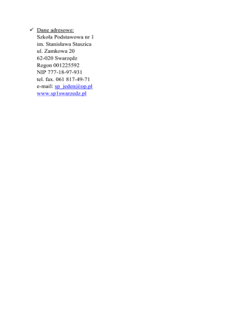 Dane adresowe: Szkoła Podstawowa nr 1 im. Stanisława Staszica ul. Zamkowa 20 62-020 Swarzędz Regon 001225592 NIP 777-18-97-931 tel. fax. 061 817-49-71 e-mail: [email protected] www.sp1swarzedz.pl