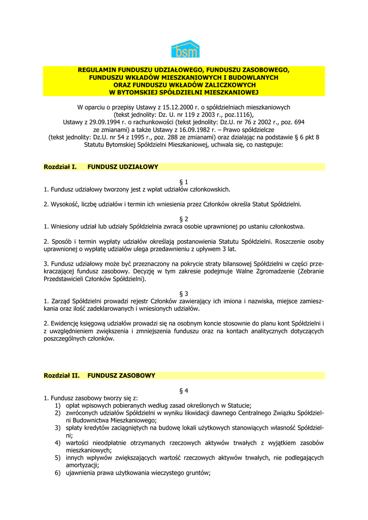 REGULAMIN FUNDUSZU UDZIAŁOWEGO, FUNDUSZU ZASOBOWEGO, FUNDUSZU WKŁADÓW MIESZKANIOWYCH I BUDOWLANYCH ORAZ FUNDUSZU WKŁADÓW ZALICZKOWYCH W BYTOMSKIEJ SPÓŁDZIELNI MIESZKANIOWEJ W oparciu o przepisy Ustawy z 15.12.2000 r. o spółdzielniach mieszkaniowych (tekst jednolity: Dz. U. nr 119 z 2003 r., poz.1116), Ustawy z 29.09.1994 r. o rachunkowości (tekst jednolity: Dz.U. nr 76 z 2002 r., poz. 694 ze zmianami) a także Ustawy z 16.09.1982 r. – Prawo spółdzielcze (tekst jednolity: Dz.U. nr 54 z 1995 r., poz. 288 ze zmianami) oraz działając na podstawie § 6 pkt 8 Statutu Bytomskiej Spółdzielni Mieszkaniowej, uchwala się, co następuje: Rozdział I. FUNDUSZ UDZIAŁOWY §1 1. Fundusz udziałowy tworzony jest z wpłat udziałów członkowskich. 2. Wysokość, liczbę udziałów i termin ich wniesienia przez Członków określa Statut Spółdzielni. §2 1. Wniesiony udział lub udziały Spółdzielnia zwraca osobie uprawnionej po ustaniu członkostwa. 2. Sposób i termin wypłaty udziałów określają postanowienia Statutu Spółdzielni. Roszczenie osoby uprawnionej o wypłatę udziałów ulega przedawnieniu z upływem 3 lat. 3. Fundusz udziałowy może być przeznaczony na pokrycie straty bilansowej Spółdzielni w części przekraczającej fundusz zasobowy. Decyzję w tym zakresie podejmuje Walne Zgromadzenie (Zebranie Przedstawicieli Członków Spółdzielni). §3 1. Zarząd Spółdzielni prowadzi rejestr Członków zawierający ich imiona i nazwiska, miejsce zamieszkania oraz ilość zadeklarowanych i wniesionych udziałów. 2. Ewidencję księgową udziałów prowadzi się na osobnym koncie stosownie do planu kont Spółdzielni i z uwzględnieniem zwiększenia i zmniejszenia funduszu oraz na kontach analitycznych dotyczących poszczególnych członków. Rozdział II. FUNDUSZ ZASOBOWY §4 1. Fundusz zasobowy tworzy się z: 1) opłat wpisowych pobieranych według zasad określonych w Statucie; 2) zwróconych udziałów Spółdzielni w wyniku likwidacji dawnego Centralnego Związku Spółdzielni Budownictwa Mieszkaniowego; 3) spłaty kredytów zaciągniętych na budowę lokali użytkowych stanowiących własność Spółdzielni; 4) wartości nieodpłatnie otrzymanych rzeczowych aktywów trwałych z wyjątkiem zasobów mieszkaniowych; 5) innych wpływów zwiększających wartość rzeczowych aktywów trwałych, nie podlegających amortyzacji; 6) ujawnienia prawa użytkowania wieczystego gruntów; 2 7) umorzeń kredytów na mieszkania lokatorskie; 8) waloryzacji umorzenia kredytów na mieszkania lokatorskie; 9) środków powstałych w wyniku obniżeń wkładów na podstawie wskaźników obniżających średni członkowski koszt budowy mieszkań określonych w § 10 „Regulaminu określającego zasady wnoszenia wkładów mieszkaniowych i budowlanych” obowiązującego do dnia 23 kwietnia 2001 r.; 10) różnic w rozliczeniach wkładów mieszkaniowych związanych z zaliczeniem na wkład spłaconego kredytu mieszkaniowego, w proporcji do okresu zamieszkiwania; 11) sfinansowania nakładów na usuwanie wad technologicznych środkami z budżetu państwa; 12) sfinansowania nakładów na niektóre prace remontowo-modernizacyjne środkami z funduszy specjalnych i remontowego, stosownie do obowiązujących w Spółdzielni postanowień innych regulaminów; 13) sfinansowania mieszkań przeznaczonych na najem. 2. Fundusz zasobów mieszkaniowych ulega zmniejszeniu z tytułu: 1) pokrycia straty bilansowej Spółdzielni na podstawie uchwały Walnego Zgromadzenia (Zebrania Przedstawicieli Członków); 2) nieodpłatnego przekazania przez Spółdzielnię środków trwałych, z wyłączeniem zasobów mieszkaniowych; 3) umorzenia środków trwałych nie podlegających amortyzacji, z wyłączeniem zasobów mieszkaniowych; 4) umorzenia prawa użytkowania wieczystego gruntów; 5) zwrotu do banku kwot umorzenia kredytu; 6) przekształcenia spółdzielczego lokatorskiego prawa do lokalu w spółdzielcze własnościowe prawo do lokalu lub prawo odrębnej własności lokalu; 7) zmiany charakteru prawnego lokali – z przeznaczonych na najem na spółdzielcze lokatorskie lub własnościowe; 8) spłacenia wkładów, o których mowa w § 4 ust.1. pkt 10. §5 Ewidencję księgową funduszu zasobowego prowadzi się na osobnym koncie, stosownie do planu kont Spółdzielni i z uwzględnieniem zwiększenia i zmniejszenia funduszu. Rozdział III. FUNDUSZ WKŁADÓW MIESZKANIOWYCH I BUDOWLANYCH §6 1. Fundusz wkładów mieszkaniowych i budowlanych tworzy się z wniesionych wkładów mieszkaniowych i budowlanych. 2. Zasady rozliczeń z tytułu wkładów mieszkaniowych i budowlanych określa Regulamin określający zasady wnoszenia wkładów mieszkaniowych i budowlanych w Bytomskiej Spółdzielni Mieszkaniowej. 3. Ewidencję księgową funduszu wkładów mieszkaniowych i budowlanych prowadzi się na osobnym koncie, stosownie do planu kont Spółdzielni i z uwzględnieniem zwiększenia i zmniejszenia funduszu, a także na kontach analitycznych poszczególnych członków Spółdzielni, których wpłaty na fundusz dotyczą. 3 Rozdział IV. FUNDUSZ WKŁADÓW ZALICZKOWYCH §7 1. Fundusz wkładów zaliczkowych powstaje z wpłat zaliczek na poczet wkładu mieszkaniowego lub budowlanego. 2. Zmniejszenie funduszu wkładów zaliczkowych następuje w związku z: 1) przeniesieniem zaliczek na poczet wkładu mieszkaniowego lub budowlanego; 2) zwrotem zaliczek nie wykorzystanych. 3. Ewidencję księgową funduszu wkładów zaliczkowych prowadzi się na osobnym koncie, stosownie do planu kont Spółdzielni i z uwzględnieniem zwiększenia i zmniejszenia funduszu, a także na kontach analitycznych poszczególnych członków Spółdzielni, których wpłaty na fundusz dotyczą. Rozdział V. POSTANOWIENIA KOŃCOWE §8 Regulamin niniejszy uchwalony został przez Radę Nadzorczą Bytomskiej Spółdzielni Mieszkaniowej 16go października 2003 roku uchwałą nr 138/2003 i wchodzi w życie z dniem jej podjęcia.