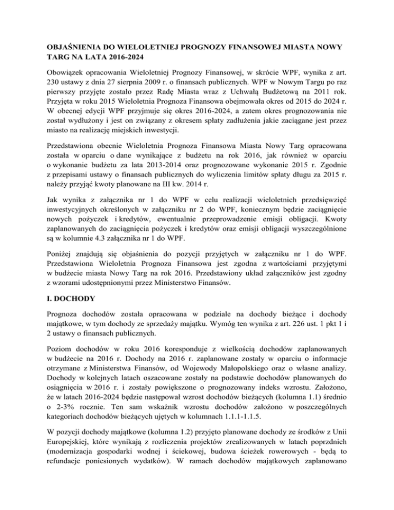 OBJAŚNIENIA DO WIELOLETNIEJ PROGNOZY FINANSOWEJ MIASTA NOWY TARG NA LATA 2016-2024 Obowiązek opracowania Wieloletniej Prognozy Finansowej, w skrócie WPF, wynika z art. 230 ustawy z dnia 27 sierpnia 2009 r. o finansach publicznych. WPF w Nowym Targu po raz pierwszy przyjęte zostało przez Radę Miasta wraz z Uchwałą Budżetową na 2011 rok. Przyjęta w roku 2015 Wieloletnia Prognoza Finansowa obejmowała okres od 2015 do 2024 r. W obecnej edycji WPF przyjmuje się okres 2016-2024, a zatem okres prognozowania nie został wydłużony i jest on związany z okresem spłaty zadłużenia jakie zaciągane jest przez miasto na realizację miejskich inwestycji. Przedstawiona obecnie Wieloletnia Prognoza Finansowa Miasta Nowy Targ opracowana została w oparciu o dane wynikające z budżetu na rok 2016, jak również w oparciu o wykonanie budżetu za lata 2013-2014 oraz prognozowane wykonanie 2015 r. Zgodnie z przepisami ustawy o finansach publicznych do wyliczenia limitów spłaty długu za 2015 r. należy przyjąć kwoty planowane na III kw. 2014 r. Jak wynika z załącznika nr 1 do WPF w celu realizacji wieloletnich przedsięwzięć inwestycyjnych określonych w załączniku nr 2 do WPF, koniecznym będzie zaciągnięcie nowych pożyczek i kredytów, ewentualnie przeprowadzenie emisji obligacji. Kwoty zaplanowanych do zaciągnięcia pożyczek i kredytów oraz emisji obligacji wyszczególnione są w kolumnie 4.3 załącznika nr 1 do WPF. Poniżej znajdują się objaśnienia do pozycji przyjętych w załączniku nr 1 do WPF. Przedstawiona Wieloletnia Prognoza Finansowa jest zgodna z wartościami przyjętymi w budżecie miasta Nowy Targ na rok 2016. Przedstawiony układ załączników jest zgodny z wzorami udostępnionymi przez Ministerstwo Finansów. I. DOCHODY Prognoza dochodów została opracowana w podziale na dochody bieżące i dochody majątkowe, w tym dochody ze sprzedaży majątku. Wymóg ten wynika z art. 226 ust. 1 pkt 1 i 2 ustawy o finansach publicznych. Poziom dochodów w roku 2016 koresponduje z wielkością dochodów zaplanowanych w budżecie na 2016 r. Dochody na 2016 r. zaplanowane zostały w oparciu o informacje otrzymane z Ministerstwa Finansów, od Wojewody Małopolskiego oraz o własne analizy. Dochody w kolejnych latach oszacowane zostały na podstawie dochodów planowanych do osiągnięcia w 2016 r. i zostały powiększone o prognozowany indeks wzrostu. Założono, że w latach 2016-2024 będzie następował wzrost dochodów bieżących (kolumna 1.1) średnio o 2-3% rocznie. Ten sam wskaźnik wzrostu dochodów założono w poszczególnych kategoriach dochodów bieżących ujętych w kolumnach 1.1.1-1.1.5. W pozycji dochody majątkowe (kolumna 1.2) przyjęto planowane dochody ze środków z Unii Europejskiej, które wynikają z rozliczenia projektów zrealizowanych w latach poprzdnich (modernizacja gospodarki wodnej i ściekowej, budowa ścieżek rowerowych - będą to refundacje poniesionych wydatków). W ramach dochodów majątkowych zaplanowano również dochody ze sprzedaży majątku (kolumna 1.2.1). Planuje się pozyskanie dochodów z tytułu sprzedaży mieszkań komunalnych (średniorocznie z tego tytułu do budżetu masta wpływa kwota ok. 300.000 zł, planowana jest również sprzedaż terenów inwestycyjnych w okolicach Strefy Aktywności Gospodarczej - wplywy z tego tytułu winny wynosić conajmniej 700.000 zł, ponadto planowana jest sprzedaż działek na rzecz dotychczasowych najemców zgodnie ze złożonymi wnioskami - z tego tytułu wplywy szacowane są na kwotę ok. 200.000 zł. W 2017 r. zaplanowano dochody z tytułu sprzedaży terenów inwestycyjnych w Strefie Aktywności Gospodarczej w kwocie 600.000 zł oraz dotację inwestycyjną z Wojewódzkiego Funduszu Ochrony Środowiska i Gospodarki Wodnej w Krakowie na realizację programu ograniczana niskiej emisjiw oparciu o podpisaną umowę. II. WYDATKI Wydatki podzielone są na 2 grupy: wydatki bieżące (kolumna 2.1) i wydatki majątkowe (kolumna 2.2). Wydatki bieżące oszacowane zostały na podstawie wykonania lat poprzednich, w roku 2016 ujęta została kwota wydatków wynikających z budżetu na 2016 rok. Zgodnie z art. 226 ust. 2 pkt 2 w ramach wydatków bieżących wyodrębniono wydatki na wynagrodzenia i składki od nich naliczane (kolumna 11.1) oraz wydatki związane z funkcjonowaniem organów jednostki samorządu terytorialnego (kolumna 11.2 - rozdział 75022 i 75023 klasyfikacji budżetowej). Wyodrębniono również wydatki bieżące związane z realizacją przedsięwzięć wieloletnich (kolumna 11.3.1), wykaz tych przedsięwzięć znajduje się w załączniku nr 2 do WPF, jak również wyodrębniono zgodnie z wymogami ustawowymi pozycję wydatków na obsługę poręczeń i gwarancji, w kolumnie tej nie wykazuje się żadnych kwot, gdyż na chwilę obecną nie udzielono żadnych poręczeń i gwarancji i nie są one również planowane w latach następnych. Wyodrębniono również pozycję wydatków związanych z obsługą długu (kolumna 2.1.3 - odsetki od pożyczek i kredytów oraz prowizje). W kolumnie tej przedstawiono koszty związane z zaciągniętym długiem w poszczególnych latach. Założono wzrost wydatków bieżących w latach 2017-2024 corocznie średnio o 2%. Zakłada się, że w celu bezpiecznej spłaty zaciągniętych kredytów i pożyczek dochody bieżące winny rosnąć w szybszym tempie niż wydatki bieżące. Jest to warunek sine qua non realizacji przyjętych przedsięwzięć inwestycyjnych. Prognozowane wydatki majątkowe zostały oszacowane w oparciu o kontynuowane i planowane przedsięwzięcia inwestycyjne wykazane w załączniku nr 2 do WPF. Realizowane przez miasto inwestycje w ostatnich latach, szczególnie w latach 2009-2015, przyczyniły się do dynamicznego rozwoju miasta, w latach tych realizowane zadania inwestycyjne to kwota ponad 210 mln zł (łącznie z wydatkami zaplanowanymi do poniesienia do końca 2015 r.). W latach 2009-2015 na realizację zadań inwestycyjn