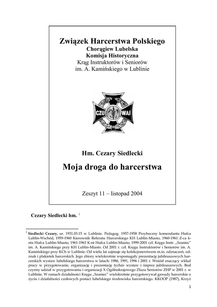 Związek Harcerstwa Polskiego Chorągiew Lubelska Komisja Historyczna Krąg Instruktorów i Seniorów im. A. Kamińskiego w Lublinie Hm. Cezary Siedlecki Moja droga do harcerstwa Zeszyt 11 – listopad 2004 Cezary Siedlecki hm. 1 1 Siedlecki Cezary, ur. 1931.03.15 w Lublinie. Pedagog. 1957-1958 Przyboczny komendanta Hufca Lublin-Wschód, 1959-1960 Kierownik Referatu Harcerskiego KH Lublin-Miasto, 1960-1961 Z-ca knta Hufca Lublin-Miasto, 1961-1963 K-nt Hufca Lublin-Miasto, 1999-2001 czł. Kręgu Instr. „Szaniec” im. A. Kamińskiego przy KH Lublin-Miasto. Od 2001 r. czł. Kręgu Instruktorów i Seniorów im. A. Kamińskiego przy KCh w Lublinie. Od wielu lat zajmuje się kolekcjonerstwem m.in. odznaczeń, odznak i plakietek harcerskich. Jego zbiory wielokrotnie wspomagały prezentację jubileuszowych harcerskich wystaw lubelskiego harcerstwa w latach: 1986, 1991, 1996 i 2001 r. Wniósł znaczący wkład pracy w przygotowanie, organizację i prezentację tychże wystaw i imprez jubileuszowych. Brał czynny udział w przygotowaniu i organizacji X Ogólnokrajowego Złazu Seniorów ZHP w 2001 r. w Lublinie. W ramach działalności Kręgu „Szaniec” wielokrotnie przygotowywał gawędy harcerskie o życiu i działalności czołowych postaci lubelskiego środowiska harcerskiego. KKOOP (1987), Krzyż 1 Moja droga do harcerstwa Szesnastego września (2004 r. – przyp. SD) upłynęło sześćdziesiąt lat, gdy po raz pierwszy znalazłem się na zbiórce harcerskiej. Moja droga do harcerstwa rozpoczęła się znacznie wcześniej. A było to tak. W lecie 1938 r. Byłem z rodzicami na letnisku w Świdniku. Świdnik w tamtych latach pełnił rolę miejscowości wypoczynkowej dla mieszkańców Lublina. W willi „Hania”. W której mieszkaliśmy przebywali z rodzicami bracia Zwiszowie. Starszy chyba Dzidek był uczniem Korpusu Kadetów, a młodszy Marek uczęszczał do szkoły powszechnej. Obaj zapaleni harcerze zorganizowali drużynę wakacyjną, z którą uprawiali „puszczaństwo”, o ile laski świdnickie można było uznać za puszczę. Ja wtedy, siedmiolatek, bardzo im zazdrościłem harcerskiej przygody. We wrześniu tego roku rozpocząłem naukę w Szkole Ćwiczeń. Mieściła się ona w budynku obecnego Wojewódzkiego Domu Kultury. Tutaj ponownie zetknąłem się z harcerstwem. Starszy brat mojego serdecznego kolegi z podwórka i szkolnej ławy Jurka Kosowskiego, Olek – obecnie lekarz psychiatra w Bielsku Białej był zastępowym. Imponował mi wiedzą historyczną i zaradnością. Widziałem się w niedługim czasie harcerzem. Na moje gorące prośby rodzi-ce kupili mi mundurek, a na ojcu wymusiłem kupno noża fińskiego. Los jednak chciał inaczej. Wybuchła wojna, nastąpiła okupacja niemiecka i życie zupełnie się zmieniło. Od 1940 roku uczęszczałem do szkoły powszechnej na ulicy Archidiakońskiej Nr 3. Wychowawczynią klasy była Pani Róża Błeszyńska, harcmistrzyni i działaczka organizacji, o czym wtedy naturalnie nie wiedziałem. Atmosfera w klasie była bardzo dobra, z przyjemnością chodziło się do szkoły. Nie mając możliwości uczestnictwa w organizacji dziecięcej zorganizowaliśmy z Jarkiem taką „bandę” podwórkową – trochę wojsko, a trochę harcerstwo. Dzielnica, w której mieszkałem – ul. 3-go Maja – była gęsto zasiedlona przez Niemców. Była też tutaj szkoła niemiecka. Często widywaliśmy maszerujące oddziały młodzieżowych organizacji hitlerowskich 2. Budziło to naszą zazdrość, a postępowanie młodych Niemców niechęć. Sam stałem się również ofiarą ich agresji, jak już wyrosłem. Na moje usilne prośby mama uszyła mi na ten wzór ubranie. Kiedyś wracając do domu przechodziłem koło grupy – jak ich nazywaliśmy „hajociaków” (H-J przyp. SD) – zatrzymali mnie i urwali mi naramienniki. Upokorzony i wściekły wróciłem do domu. Mama w trosce o moje bezpieczeństwo nie wyraziła zgody na przyszycie nowych naramienników. Dlaczego u tych młodych chłopców było tyle agresji? Pewno skutki celowego wychowania, poza tym byli to często Niemcy pierwszego pokolenia. Rodzice zmieniali narodowość, a oni szkołę i kolegów. W naszej kamienicy też mieszkała rodzina, która poczuła się Niemcami. Dwie znajome dziewczynki z podwórka przestały nagle być naszymi koleżankami. Znajomy chłopak z Dolnej 3-maja pojawił się też w mundurze „hajociaka”. Również straWielki z Gwiazdą Orderu Św. Stanisława (2008), odzn. Zasłużony Działacz Kultury (1999), medal Prezydenta Miasta Lublin (2007). Hm, KH ZHP Lublin-Miasto, L. 1961. Przyp. SD. 2 Hitlerjugend (oficjalnie pisane, jako Hitler-Jugend, w skrócie HJ., pol. dosł. „Młodzież Hitlera”) – niemiecka organizacja młodzieżowa NSDAP zorganizowana na wzór paramilitarny w 1922, jako przybudówka Oddziałów Szturmowych (SA). Przyp. SD. 2 cił on nagle znajomość języka polskiego. Mówił łamaną polszczyzną, do siebie kazał zwracać się „pan”. Przylgnęło to do niego, jako „ksywka”. Zbliżanie się frontu wschodniego przywróciło mu jednak znajomość języka polskiego. Po przejściu frontu zaczęła działać w Lublinie organizacja młodzieżowa o wybitnie sowieckim charakterze – Związek Walki Młodych. Mimo propagowania tej organizacji napływ młodzieży był mały, a osoby zgłaszające się odstawały od przyjętego powszechnie wizerunku młodego chłopca czy dziewczyny. Po złożonych egzaminach rozpocząłem naukę w Gimnazjum im. J. Zamojskiego w Lublinie. Na tablicy ogłoszeń ukazała się informacja – 16 września, po lekcjach, na boisku szkolnym odbędzie się zbiórka chętnych do harcerstwa. W wyznaczonym dniu zebrało się na boisku ze 120 „chłopa”. Starszyzna drużyny z klas licealnych naradza się, widocznie nie liczyli na taka ilość zgłaszających się. Drużynowy, dh Janczara (lub podobnie) dzieli nas na trzy plutony, wyznacza plutonowych. Znalazłem się w plutonie u dh. Zielińskiego. Teraz powoł