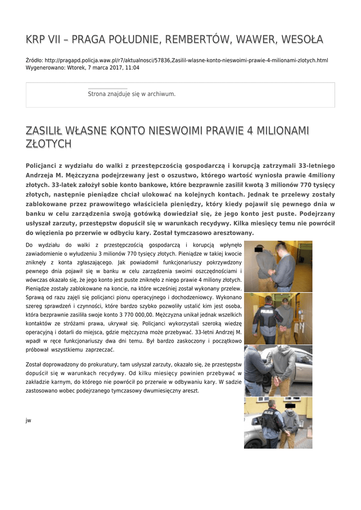 KRP VII – PRAGA POŁUDNIE, REMBERTÓW, WAWER, WESOŁA Źródło: http://pragapd.policja.waw.pl/r7/aktualnosci/57836,Zasilil-wlasne-konto-nieswoimi-prawie-4-milionami-zlotych.html Wygenerowano: Wtorek, 7 marca 2017, 11:04 Strona znajduje się w archiwum. ZASILIŁ WŁASNE KONTO NIESWOIMI PRAWIE 4 MILIONAMI ZŁOTYCH Policjanci z wydziału do walki z przestępczością gospodarczą i korupcją zatrzymali 33-letniego Andrzeja M. Mężczyzna podejrzewany jest o oszustwo, którego wartość wyniosła prawie 4miliony złotych. 33-latek założył sobie konto bankowe, które bezprawnie zasilił kwotą 3 milionów 770 tysięcy złotych, następnie pieniądze chciał ulokować na kolejnych kontach. Jednak te przelewy zostały zablokowane przez prawowitego właściciela pieniędzy, który kiedy pojawił się pewnego dnia w banku w celu zarządzenia swoją gotówką dowiedział się, że jego konto jest puste. Podejrzany usłyszał zarzuty, przestępstw dopuścił się w warunkach recydywy. Kilka miesięcy temu nie powrócił do więzienia po przerwie w odbyciu kary. Został tymczasowo aresztowany. Do wydziału do walki z przestępczością gospodarczą i korupcją wpłynęło zawiadomienie o wyłudzeniu 3 milionów 770 tysięcy złotych. Pieniądze w takiej kwocie zniknęły z konta zgłaszającego. Jak powiadomił funkcjonariuszy pokrzywdzony pewnego dnia pojawił się w banku w celu zarządzenia swoimi oszczędnościami i wówczas okazało się, że jego konto jest puste zniknęło z niego prawie 4 miliony złotych. Pieniądze zostały zablokowane na koncie, na które wcześniej został wykonany przelew. Sprawą od razu zajęli się policjanci pionu operacyjnego i dochodzeniowcy. Wykonano szereg sprawdzeń i czynności, które bardzo szybko pozwoliły ustalić kim jest osoba, która bezprawnie zasiliła swoje konto 3 770 000,00. Mężczyzna unikał jednak wszelkich kontaktów ze stróżami prawa, ukrywał się. Policjanci wykorzystali szeroką wiedzę operacyjną i dotarli do miejsca, gdzie mężczyzna może przebywać. 33-letni Andrzej M. wpadł w ręce funkcjonariuszy dwa dni temu. Był bardzo zaskoczony i początkowo próbował wszystkiemu zaprzeczać. Został doprowadzony do prokuratury, tam usłyszał zarzuty, okazało się, że przestępstw dopuścił się w warunkach recydywy. Od kilku miesięcy powinien przebywać w zakładzie karnym, do którego nie powrócił po przerwie w odbywaniu kary. W sadzie zastosowano wobec podejrzanego tymczasowy dwumiesięczny areszt. jw Ocena: 0/5 (0) Tweetnij