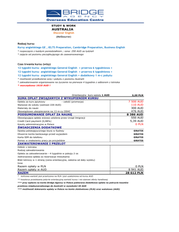 STUDY & WORK AUSTRALIA Discover English (Melbourne) Rodzaj kursu Kursy angielskiego GE , IELTS Preparation, Cambridge Preparation, Business English * rozpoczęcie z każdym poniedziałkiem ; cena: 250 AUD za tydzień * zajęcia od poziomu początkującego do zaawansowanego Czas trwania kursu (wizy) 12 tygodni kursu angielskiego General English + przerwa 6 tygodniowa + 12 tygodni kursu angielskiego General English + przerwa 6 tygodniowa + 12 tygodni kursu angielskiego General English + dodatkowy 1 m-c pobytu * możliwość przedłużenia wizy i pobytu z poziomu Australii * zakwaterowanie organizowane na życzenie na pierwsze 4 tygodnie z odbiorem z lotniska * oszczędzasz 1610 AUD ! Orientacyjny kurs waluty 1 AUD 3,20 PLN SUMA OPŁAT ZWIĄZANYCH Z WYKUPIENIEM KURSU Opłata za kurs językowy - całość (promocja) Wpisowe do szkoły (zamiast 220 AUD) Materiały do nauki Obowiązkowe ubezpieczenie na 13 m-cy OSHC PODSUMOWANIE OPŁAT ZA NAUKĘ Obowiązująca opłata wizowa ustalona przez Urząd Imigracji Credit Card payment (0,98%) Koszty administracyjne w Polsce 7 500 AUD 110 AUD 300 AUD 476 AUD 8 386 AUD 550 AUD 5,39 AUD 0 PLN ŚWIADCZENIA DODATKOWE Opieka polskojęzycznego biura w Sydney GRATIS Otwarcie konta bankowego przed wyjazdem GRATIS Karta SIM do telefonu GRATIS Pomoc w znalezieniu pracy po przyjeździe GRATIS ZAKWATEROWANIE I PRZELOT Odbiór z lotniska Rodzaj zakwaterowania Opłata za zakwaterowanie - 4 tygodnie w pokoju 2 os Jednorazowa opłata za rezerwacje mieszkania Bilet lotniczy w 1 stronę (cena orientacyjna, zależna od daty wylotu) Inne Razem opłaty w PLN Razem opłaty w AUD RAZEM * 0 PLN 8 941 AUD 28 612 PLN końcowa wartość jest przeliczona na PLN i jest uzależniona od kursu AUD ** kosztorys przedstawia jedynie orientacyjną wartość kursu i nie stanowi oferty handlowej *** przy wpłacie na konto Bridge Agency w Polsce pobierana dodatkowa opłata na pokrycie kosztów przelewu międzynarodowego do Australii w wysokości 45 AUD *** możliwość dokonania wpłaty w Polsce na konto złotówkowe (PLN) oraz walutowe (AUD)