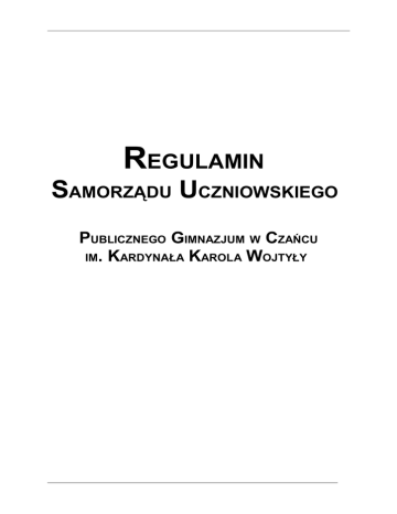 REGULAMIN SAMORZĄDU UCZNIOWSKIEGO PUBLICZNEGO GIMNAZJUM W CZAŃCU IM. KARDYNAŁA KAROLA WOJTYŁY 1. Regulamin Samorządu Uczniowskiego opracowano zgodnie ze Statutem Gimnazjum. 2. W szkole działa Samorząd Uczniowski, zwany dalej „Samorządem”. 3. Samorząd Uczniowski ma obowiązek przestrzegania kardynalnej zasady – nie wolno naruszać godności osobistej i dobrego imienia innych ludzi. 4. Samorząd tworzą wszyscy uczniowie szkoły poprzez swoich przedstawicieli (trójki klasowe). 5. Organy samorządu powołuje się zgodnie z ordynacją wyborczą na zebraniu Samorządu Uczniowskiego, w głosowaniu tajnym, w składzie: 1) przewodniczący, 2) zastępca przewodniczącego, 3) sekretarz, 4) dwuosobowa sekcja gazetkowa. 6. Nowy skład Samorządu powołuje się w listopadzie, spośród uczniów klas drugich. Do końca pierwszego półrocza roku szkolnego następuje przekazanie obowiązków, działają jednocześnie dwa składy Samorządu. 7. Działanie organów Samorządu uczniowskiego określa plan pracy opracowany przy współudziale opiekuna z ramienia Rady Pedagogicznej i przedstawicieli uczniów, zatwierdzony na zebraniu członków samorządu. 8. Organy samorządu są jedynymi reprezentantami ogółu uczniów. 9. Regulamin samorządu nie moŜe być sprzeczny ze Statutem Szkoły. 10. Samorząd Uczniowski moŜe przedstawiać Radzie Pedagogicznej oraz dyrektorowi wnioski i opinie we wszystkich sprawach szkoły, w szczególności dotyczących realizacji podstawowych praw uczniów takich jak: 1) prawo do zapoznania się z programem nauczania, z jego treścią, celem, stawianymi wymaganiami oraz innowacjami i eksperymentami pedagogicznymi, 2) prawo do jawnej i umotywowanej oceny postępów w nauce i zachowaniu, 3) prawo do organizowania Ŝycia szkoły, umoŜliwiające zachowanie właściwej proporcji między wysiłkiem szkolnym, a moŜliwością rozwijania i zaspakajania własnych zainteresowań, 4) prawo do prowadzenia własnej gazetki szkolnej, 5) prawo organizowania działalności kulturalnej, oświatowej, sportowej oraz rozrywkowej zgodnie z własnymi potrzebami i moŜliwościami organizacyjnymi, 6) prawo wyboru nauczyciela pełniącego rolę opiekuna samorządu. 11. Opiekunem samorządu klasowego jest jej wychowawca. 12. Samorząd Uczniowski prowadzi i nadzoruje Sklepik Szkolny, którego działalność określa Regulamin. 13. Opiekun Samorządu Uczniowskiego wyznacza załogę sklepiku. 14. Samorząd Uczniowski ma prawo dysponować funduszami sklepiku. Decyzje dysponowania środkami pienięŜnymi podejmuje opiekun Samorządu Uczniowskiego w porozumieniu z uczniami. 15. Zasady współdziałania: 1) uczniowie wnoszą swoje uwagi do samorządów klasowych, 2) samorządy klasowe do opiekunów Samorządu Uczniowskiego, 3) opiekunowie do dyrekcji szkoły lub Rady Pedagogicznej. 16. Władze szkolne mają obowiązek spotkania się z samorządem, okresowo lub na wniosek samorządu, wysłuchania wniosków, postulatów dotyczących Ŝycia społeczności uczniowskiej i udzielić odpowiedzi na nie. 17. Wychowawcy klas i opiekunowie Samorządu Uczniowskiego mają obowiązek: udzielać pomocy organizacyjnej i merytorycznej samorządowi, którym się opiekują, słuŜyć mu doświadczeniem i radą, szczególnie w zakresie przestrzegania reguł demokracji. 18. Ocenę zachowania się ucznia określa „Wewnątrzszkolny System Oceniana”. 19. Samorząd Uczniowski ma prawo do informowania całej społeczności szkoły o swoich programach, opiniach i problemach. 20. Uprawnień, obowiązków i odpowiedzialności Samorządu Uczniowskiego nie naleŜy zawęŜać. 21. Zamian w swoich organach samorząd dokonuje na zebraniach, po analizie wniosków w obecności 50% swoich członków. 22. Samorząd Uczniowski opiniuje na piśmie pracę nauczyciela ocenianego na prośbę dyrektora szkoły. 23. Zatwierdzono w dniu 12 listopada 2005 r. na posiedzeniu Samorządu Uczniowskiego po wcześniejszym uzgodnieniu z przedstawicielami Rady Pedagogicznej i Rady Rodziców. REGULAMIN GIMNAZJUM PRAWA I OBOWIĄZKI UCZNIÓW OPRACOWANE NA PODSTAWIE STATUTU GIMNAZJUM I PRAWA U C Z N IA 1. Uczeń jako członek zbiorowości szkolnej ma prawo do: a) poszanowania godności, dobrego imienia, własności osobistej, rozwijania zainteresowań, zdolności oraz talentów, b) podmiotowego traktowania w procesie edukacyjnym i wychowawczym, rzetelnej oraz sprawiedliwej oceny swego zachowania i postępów w nauce lub oceny swej pracy przez przełoŜonych, c) właściwie zorganizowanego procesu edukacyjnego zgodnie z zasadami higieny pracy umysłowej, wpływania na Ŝycie szkoły przez działalność samorządową oraz zrzeszania się w organizacjach działających w szkole, informacji na temat wewnątrzszkonego systemu oceniania, d) korzystania z pomieszczeń szkolnych, sprzętu, środków dydaktycznych, księgozbioru biblioteki podczas zajęć pozalekcyjnych z zapewnieniem odpowiedniej opieki osób dorosłych, e) korzystania z poradnictwa psychologiczno – pedagogicznego i zawodowego, f) opieki wychowawczej i bezpiecznych warunków pobytu w szkole oraz na wycieczkach, g) zgłaszania wniosków w sprawie organów samorządu, h) swobody wyraŜania myśli oraz przekonań światopoglądowych i religijnych. 2. Uczeń w zakresie lekcji ma prawo do: a) znajomości celu lekcji, swoich zadań lekcyjnych oraz jasnego i zrozumiałego dla niego przekazu treści lekcji, b) zadawania pytań nauczycielowi w przypadku natrafienia na trudności w toku lekcji, pomocy w razie trudności w nauce, c) nauki religii na pisemne Ŝyczenie rodziców. 3. Uczeń w zakresie pracy domowej ma prawo do: a) ferii, przerw świątecznych oraz weekendów bez pracy domowej, tzn. nie zadaje się zadań domowych w piątek na poniedziałek, oprócz przedmiotów realizowanych w planie godzin w piątki i poniedziałki , b) oceny pracy domowej przez nauczyciela, c) brania pod uwagę przez nauczyciela moŜliwości odrobienia zadania, d) indywidualizacji wymagań. 4. Uczeń w sprawie oc