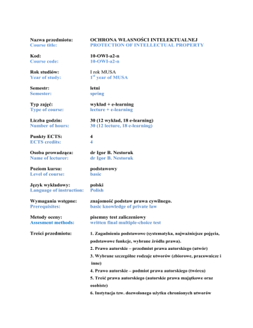 Nazwa przedmiotu: Course title: OCHRONA WŁASNOŚCI INTELEKTUALNEJ PROTECTION OF INTELLECTUAL PROPERTY Kod: Course code: 10-OWI-a2-n 10-OWI-a2-n Rok studiów: Year of study: I rok MUSA 1st year of MUSA Semestr: Semester: letni spring Typ zajęć: Type of course: wykład + e-learning lecture + e-learning Liczba godzin: Number of hours: 30 (12 wykład, 18 e-learning) 30 (12 lecture, 18 e-learning) Punkty ECTS: ECTS credits: 4 4 Osoba prowadząca: Name of lecturer: dr Igor B. Nestoruk dr Igor B. Nestoruk Poziom kursu: Level of course: podstawowy basic Język wykładowy: Language of instruction: polski Polish Wymagania wstępne: Prerequisites: znajomość podstaw prawa cywilnego. basic knowledge of private law Metody oceny: Assesment methods: pisemny test zaliczeniowy written final multiple-choice test Treści przedmiotu: 1. Zagadnienia podstawowe (systematyka, najważniejsze pojęcia, podstawowe funkcje, wybrane źródła prawa). 2. Prawo autorskie – przedmiot prawa autorskiego (utwór) 3. Wybrane szczególne rodzaje utworów (zbiorowe, pracownicze i inne) 4. Prawo autorskie – podmiot prawa autorskiego (twórca) 5. Treść prawa autorskiego (autorskie prawa majątkowe oraz osobiste) 6. Instytucja tzw. dozwolonego użytku chronionych utworów 7. Umowy prawnoautorskie (przeniesienie praw oraz licencja) 8. Ochrona praw autorskich (instrumenty cywilno- oraz karnoprawne) 9. Ochrona prawna baz danych 10. Cel i zakres prawa własności przemysłowej. 11. Prawo własności przemysłowej – ochrona wynalazków (prawo polskie oraz UE), wynalazki biotechnologiczne 12. Prawo własności przemysłowej – ochrona znaków towarowych (prawo polskie oraz regulacje UE) 13. Prawo własności przemysłowej – wzory użytkowe oraz wzory przemysłowe (prawo polskie oraz regulacje UE) 14. Aspekty instytucjonalne ochrony własności intelektualnej (Urząd Patentowy RP, OHIM, EPO) Course contents: Cele i efekty kształcenia: 1) Student uzyskuje podstawową wiedzę na temat: podstawowych pojęć z zakresu prawa własności intelektualnej (w tym przemysłowej), rodzaju i charakteru dóbr niematerialnych; wzajemnych zależności różnych praw własności intelektualnej i możliwości ich kumulatywnej ochrony; krajowego, unijnego i międzynarodowego sposobu ochrony niektórych dóbr niematerialnych; sposobów ochrony poszczególnych dóbr niematerialnych. 2) Student rozumie: zasady ochrony praw własności intelektualnej; system środków ochrony praw własności intelektualnej; podstawowe zasady regulacji prawnej w zakresie ochrony praw własności intelektualnej. 3) Student posiada umiejętność: określenia charakteru dobra niematerialnego, wskazania podstawy prawnej regulacji danego dobra, . Objectives and learning outcomes: Zalecana literatura: Recommended reading: J. Barta, R. Markiewicz, Prawo Autorskie, Warszawa 2010 A. Nowicka, M. Poźniak-Niedzielska, U. Promińska, H. ŻakowskaHenzler, Prawo Własności Przemysłowej, Difin 2005 E. Nowińska, M. du Vall, Prawo własności przemysłowej, Lexis Nexis 2005 R. Skubisz (red.), Prawo własności przemysłowej. System prawa prywatnego. Tom 14 A (2011) i 14B (2012). J. Barta (red.), Prawo autorskie. System prawa prywatnego. Tom 13. CH Beck 2007.