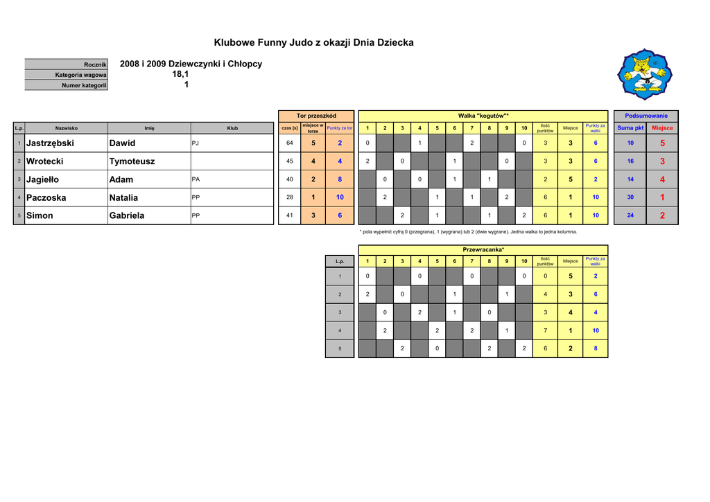 Klubowe Funny Judo z okazji Dnia Dziecka Rocznik Kategoria wagowa Numer kategorii 2008 i 2009 Dziewczynki i Chłopcy 18,1 1 5 Tor przeszkód L.p. Imię Nazwisko 1 Jastrzębski Dawid 2 Wrotecki Tymoteusz 3 Jagiełło Adam 4 Paczoska 5 Simon Klub czas [s] Walka "kogutów"* miejsce w Punkty za tor torze 1 2 64 5 2 0 45 4 4 2 PA 40 2 8 0 Natalia PP 28 1 10 2 Gabriela PP 41 3 6 PJ 3 4 5 6 1 7 8 2 0 1 0 10 Miejsce Punkty za walki 0 3 3 6 3 3 2 0 1 1 2 9 Podsumowanie Ilość punktów 1 1 1 2 1 2 Suma pkt Miejsce 4 10 5 6 4 16 3 5 2 4 14 4 6 1 10 4 30 1 6 1 10 4 24 2 * pola wypełnić cyfrą 0 (przegrana), 1 (wygrana) lub 2 (dwie wygrane). Jedna walka to jedna kolumna. Przewracanka* L.p. 1 1 0 2 2 2 4 5 6 0 0 4 2 8 1 2 9 0 10 Ilość punktów Miejsce Punkty za walki 0 0 5 2 4 4 3 6 4 3 4 4 4 7 1 10 4 6 2 8 4 1 1 2 2 7 0 0 3 5 3 0 2 1 2 2 Klubowe Funny Judo z okazji Dnia Dziecka Rocznik Kategoria wagowa Numer kategorii 2008 i 2009 Dziewczynki i Chłopcy 20 2 5 Tor przeszkód L.p. Imię Nazwisko Klub czas [s] Walka "kogutów"* miejsce w Punkty za tor torze 1 2 1 Weselski Tymon PJ 46 4 4 0 2 Grabiec Weronika PP 26 1 10 2 3 Puszkiewicz Stanisław Tr, Adam 54 5 2 1 4 Ryżko Stanisław PJ 40 2 8 1 5 Kaczmarski Szymon PJ 45 3 6 3 4 5 6 2 7 8 0 2 2 0 10 Miejsce Punkty za walki 0 2 4 4 7 1 1 1 0 0 0 9 Podsumowanie Ilość punktów 0 2 2 1 2 2 Suma pkt Miejsce 4 12 4 10 4 30 1 5 2 4 6 5 4 3 6 4 22 2 6 2 8 4 22 2 * pola wypełnić cyfrą 0 (przegrana), 1 (wygrana) lub 2 (dwie wygrane). Jedna walka to jedna kolumna. Przewracanka* L.p. 1 1 0 2 2 2 4 5 6 1 0 4 2 8 2 1 9 1 10 Ilość punktów Miejsce Punkty za walki 1 2 4 4 4 7 1 10 4 1 5 2 4 5 2 8 4 5 2 8 4 2 0 1 1 7 0 1 3 5 3 0 2 0 2 1 Klubowe Funny Judo z okazji Dnia Dziecka Rocznik Kategoria wagowa Numer kategorii 2008 i 2009 Dziewczynki i Chłopcy 21,48 3 4 Tor przeszkód 1 2 1 Wrotecki Franciszek PG 31 2 8 0 2 Marcińczyk Hanna PP 26 1 10 2 3 Hubner Mikołaj PJ 65 4 2 2 4 Sałacka Joanna PA 44 3 6 0 3 4 1 2 1 5 inna kategria lub przerwa czas [s] 0 Podsumowanie Ilość punktów Miejsce Punkty za walki 3 3 6 1 5 1 1 4 0 6 2 0 Suma pkt Miejsce 3 22 2 10 3 30 1 2 8 3 12 4 4 2 3 14 3 * pola wypełnić cyfrą 0 (przegrana), 1 (wygrana) lub 2 (dwie wygrane). Jedna walka to jedna kolumna. Przewracanka* L.p. 1 1 0 2 2 2 3 0 4 2 3 4 2 2 0 0 5 inna kategria lub przerwa Klub inna kategria lub przerwa Imię Nazwisko inna kategria lub przerwa L.p. Walka "kogutów"* miejsce w Punkty za tor torze Ilość punktów Miejsce Punkty za walki 4 2 8 3 1 5 1 10 3 1 1 4 2 3 2 3 6 3 6 2 0 Klubowe Funny Judo z okazji Dnia Dziecka Rocznik Kategoria wagowa Numer kategorii 2008 i 2009 Dziewczynki i Chłopcy 24,46 4 4 Tor przeszkód Jakub 2 Sękowska Zofia 3 Haracz 4 Radzinska 1 2 33 2 8 2 PP 35 3 6 0 Mateusz PP 50 4 2 1 Weronika PP 32 1 10 1 3 4 1 0 1 5 inna kategria lub przerwa Borzęcki czas [s] 2 Podsumowanie Ilość punktów Miejsce Punkty za walki 5 1 10 0 0 4 2 4 3 6 2 0 Suma pkt Miejsce 3 28 1 2 3 14 4 2 8 3 18 2 3 6 3 18 2 * pola wypełnić cyfrą 0 (przegrana), 1 (wygrana) lub 2 (dwie wygrane). Jedna walka to jedna kolumna. Przewracanka* L.p. 1 1 2 2 0 2 3 2 4 0 3 4 2 2 0 0 5 inna kategria lub przerwa 1 Klub inna kategria lub przerwa Imię Nazwisko inna kategria lub przerwa L.p. Walka "kogutów"* miejsce w Punkty za tor torze Ilość punktów Miejsce Punkty za walki 6 1 10 3 0 2 3 6 3 2 4 2 8 3 0 4 2 3 6 2 0 Klubowe Funny Judo z okazji Dnia Dziecka Rocznik Kategoria wagowa Numer kategorii 2008 i 2009 Dziewczynki i Chłopcy 31,14 5 4 Tor przeszkód 1 2 1 Jaźwiński Maciej 322NW2 27 1 10 2 2 Nowogórski Dawid Pawel trener 33 2 8 0 3 Vasileiadis Antonina Tr Grzegorz 40 4 2 0 4 Goli Robert NP 36 3 6 2 3 4 2 1 0 5 inna kategria lub przerwa czas [s] 1 Podsumowanie Ilość punktów Miejsce Punkty za walki 6 1 10 1 2 3 1 1 3 6 2 0 Suma pkt Miejsce 3 30 1 6 3 20 2 4 2 3 12 4 2 8 3 16 3 * pola wypełnić cyfrą 0 (przegrana), 1 (wygrana) lub 2 (dwie wygrane). Jedna walka to jedna kolumna. Przewracanka* L.p. 1 1 2 2 0 2 3 2 4 0 3 4 2 2 0 0 5 inna kategria lub przerwa Klub inna kategria lub przerwa Imię Nazwisko inna kategria lub przerwa L.p. Walka kogutów* miejsce w Punkty za tor torze Ilość punktów Miejsce Punkty za walki 6 1 10 3 0 2 3 6 3 2 4 2 8 3 0 4 2 3 6 2 0