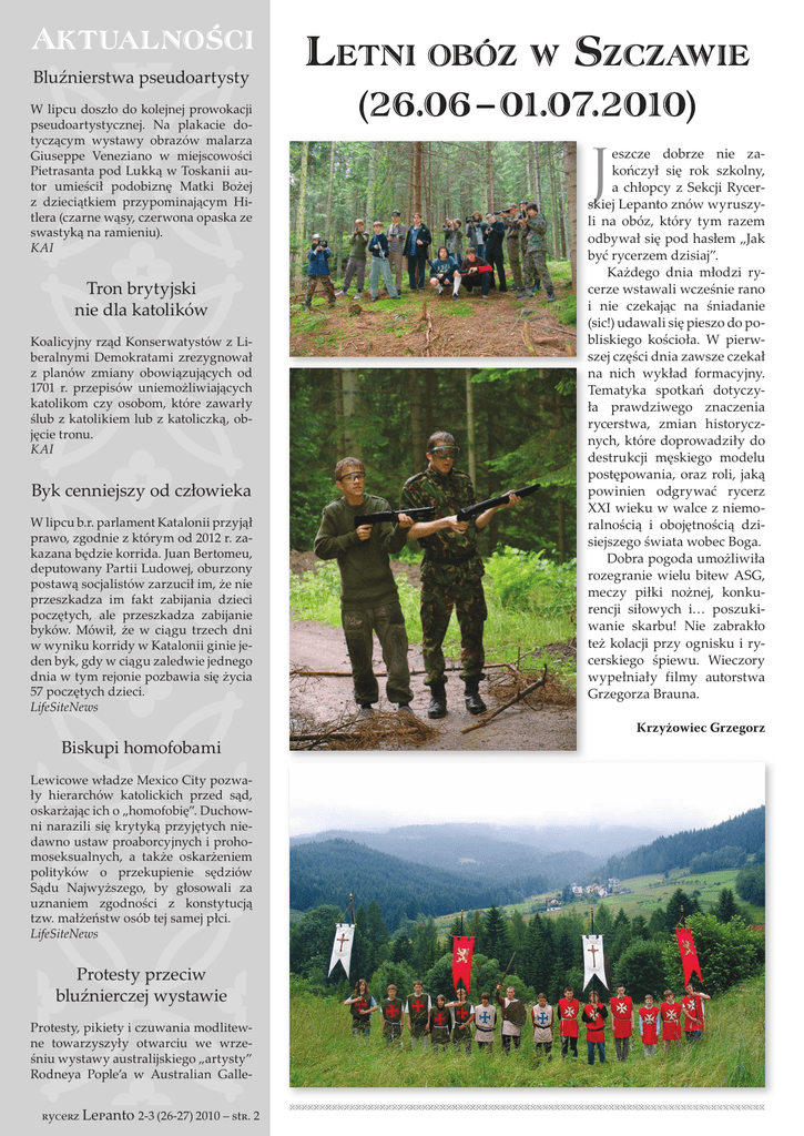 Bluźnierstwa pseudoartysty W lipcu doszło do kolejnej prowokacji pseudoartystycznej. Na plakacie dotyczącym wystawy obrazów malarza Giuseppe Veneziano w miejscowości Pietrasanta pod Lukką w Toskanii autor umieścił podobiznę Matki Bożej z dzieciątkiem przypominającym Hitlera (czarne wąsy, czerwona opaska ze swastyką na ramieniu). KAI Tron brytyjski nie dla katolików Koalicyjny rząd Konserwatystów z Liberalnymi Demokratami zrezygnował z planów zmiany obowiązujących od 1701 r. przepisów uniemożliwiających katolikom czy osobom, które zawarły ślub z katolikiem lub z katoliczką, objęcie tronu. KAI Byk cenniejszy od człowieka W lipcu b.r. parlament Katalonii przyjął prawo, zgodnie z którym od 2012 r. zakazana będzie korrida. Juan Bertomeu, deputowany Partii Ludowej, oburzony postawą socjalistów zarzucił im, że nie przeszkadza im fakt zabijania dzieci poczętych, ale przeszkadza zabijanie byków. Mówił, że w ciągu trzech dni w wyniku korridy w Katalonii ginie jeden byk, gdy w ciągu zaledwie jednego dnia w tym rejonie pozbawia się życia 57 poczętych dzieci. LifeSiteNews J eszcze dobrze nie zakończył się rok szkolny, a chłopcy z Sekcji Rycerskiej Lepanto znów wyruszyli na obóz, który tym razem odbywał się pod hasłem „Jak b być rycerzem dzisiaj”. Każdego dnia młodzi rycerze wstawali wcześnie rano i nie czekając na śniadanie (sic!) udawali się pieszo do pob bliskiego kościoła. W pierwszej części dnia zawsze czekał n na nich wykład formacyjny. Tematyka spotkań dotyczyłła prawdziwego znaczenia rycerstwa, zmian historyczn nych, które doprowadziły do destrukcji męskiego modelu postępowania, oraz roli, jaką powinien odgrywać rycerz XXI wieku w walce z niemoralnością i obojętnością dzisiejszego świata wobec Boga. Dobra pogoda umożliwiła rozegranie wielu bitew ASG, meczy piłki nożnej, konkurencji siłowych i… poszukiw wanie skarbu! Nie zabrakło też kolacji przy ognisku i rycerskiego śpiewu. Wieczory w wypełniały filmy autorstwa Grzegorza Brauna. Krzyżowiec Grzegorz Biskupi homofobami Lewicowe władze Mexico City pozwały hierarchów katolickich przed sąd, oskarżając ich o „homofobię”. Duchowni narazili się krytyką przyjętych niedawno ustaw proaborcyjnych i prohomoseksualnych, a także oskarżeniem polityków o przekupienie sędziów Sądu Najwyższego, by głosowali za uznaniem zgodności z konstytucją tzw. małżeństw osób tej samej płci. LifeSiteNews Protesty przeciw bluźnierczej wystawie Protesty, pikiety i czuwania modlitewne towarzyszyły otwarciu we wrześniu wystawy australijskiego „artysty” Rodneya Pople’a w Australian Galley e Leanto 2-3 (26-27) 2010 – st. 2