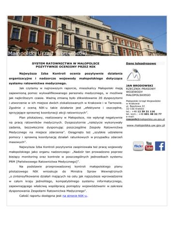 SYSTEM RATOWNICTWA W MAŁOPOLSCE POZYTYWNIE OCENIONY PRZEZ NIK Najwyższa organizacyjne i Izba Kontroli nadzorcze ocenia wojewody Dane teleadresowe pozytywnie działania małopolskiego dotyczące systemu ratownictwa medycznego. Jak czytamy w najnowszym raporcie, mieszkańcy Małopolski mają zapewnioną pomoc wykwalifikowanego personelu medycznego, w możliwie jak najkrótszym czasie. Ważną zmianą było zlikwidowanie 20 dyspozytorni i utworzenie w ich miejsce dwóch zlokalizowanych w Krakowie i w Tarnowie. Zgodnie z oceną NIK-u takie działanie jest „efektywne i oszczędne, sprzyjające sprawnej koordynacji akcji ratowniczych”. Plan pilotażowy, realizowany w Małopolsce, nie wpłynął negatywnie na pracę ratowników medycznych. Dyspozytornie „należycie wykonywały zadania, bezzwłocznie dysponując poszczególne Zespoły Ratownictwa Medycznego na miejsce zdarzenia”. Osiągnięto też „szybkie udzielenie pomocy i sprawną koordynację działań ratunkowych w przypadku zdarzeń masowych”. Najwyższa Izba Kontroli pozytywnie zaopiniowała też pracę wojewody małopolskiego jako organu nadzorczego: „Nadzór ten prowadzono poprzez bieżący monitoring oraz kontrole w poszczególnych jednostkach systemu PRM [Państwowego Ratownictwa Medycznego]”. Na podstawie pilotażowego NIK przeprowadzonej wnioskuje do kontroli Ministra małopolskiego Spraw planu Wewnętrznych „o zintensyfikowanie działań mających na celu jak najszybsze wprowadzenie w całym kraju jednolitego, kompatybilnego systemu informatycznego, zapewniającego właściwą współpracę pomiędzy województwami w zakresie dysponowania Zespołami Ratownictwa Medycznego”. Całość raportu dostępna jest na stronie NIK-u. JAN BRODOWSKI RZECZNIK PRASOWY WOJEWODY MAŁOPOLSKIEGO Małopolski Urząd Wojewódzki w Krakowie ul. Basztowa 22 32-156 Kraków tel.: +48 12 39 21 116 tel. kom.: +48 601 48 32 77 e-mail: [email protected] www.malopolska.uw.gov.pl