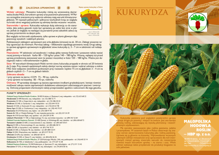 Rejony uprawy kukurydzy w Polsce Wybór odmiany: Mieszańce kukurydzy różnią się wczesnością dojrzewania (liczba FAO), kierunkiem uprawy oraz poziomem plonowania. W Polsce szczególne znaczenie przy wyborze odmiany mają warunki klimatycznoglebowe. W rejonach północnych i północno-wschodnich kraju ze względu na krótki okres wegetacji polecane są odmiany bardzo wczesne i wczesne. Stanowisko i uprawa: Kukurydza wykazuje dużą tolerancję co do stanowiska. Jako jedyny gatunek może być uprawiany po sobie bez strat w plonie. Jednak ze względu na nasilające się porażenie przez szkodniki zaleca się rejon 1: FAO do 230 rejon 2: FAO 230 – 260 uprawę przemiennie na danym polu. rejon 3: FAO do 220 Bez względu na kierunek użytkowania, tylko uprawa w plonie głównym daje gwarancję wysokich i stabilnych plonów. Podstawowym zabiegiem uprawowym jest orka głęboka (zimowa) na ok. 30 cm. Zabiegi wiosenne należy ograniczyć do minimum. Pierwszy zabieg – włókowanie zapobiega parowaniu wody. Drugi zabieg to uprawa agregatem uprawowym na głębokość siewu kukurydzy tj. 3 – 7 cm w zależności od rodzaju gleby. Nawożenie: W zależności od zasobności i rodzaju gleby nawozy fosforowe i potasowe należy wysiać raczej jesienią w ilościach: fosfor 80 – 120 kg/ha i potas 140 – 180 kg/ha. Wiosną, najlepiej tuż przed uprawą przedsiewną zastosować azot (w postaci mocznika) w ilości 120 – 180 kg/ha. Ważna jest dostępność makro i mikroelementów w glebie. Siew: W warunkach klimatycznych Polski termin siewu kukurydzy przypada w okresie od 20 kwietnia do 5 maja. Przy siewach opóźnionych należy obniżyć normę wysiewu nasion i wybrać odmiany o niskim FAO. Siew wyłącznie siewnikiem punktowym przy rozstawie rzędów 75 cm na głębokość 3 – 4 cm na glebach ciężkich i 5 – 7 cm na glebach lekkich. Zalecana obsada: • przy uprawie na ziarno i CCM: 75 – 90 tys. roślin/ha • przy uprawie na kiszonkę: 85 – 95 tys. roślin/ha Ochrona: W sprzedaży dostępne są nasiona zaprawiane środkami grzybobójczymi. Istnieje również możliwość zakupu nasion zaprawionych dodatkowo substancjami odstraszającymi ptactwo i zwierzynę. Ochronę preparatami chemicznymi należy przeprowadzić zgodnie z zaleceniami dla tego gatunku. KUKURYDZA PUNKTY SPRZEDAŻY: Oddział Stacja Hodowli Roślin Kraków, 30-002 Kraków, ul. Zbożowa 4, woj. małopolskie – tel. (12) 633 68 22 Niedźwiedź 32-090 Słomniki, woj. małopolskie – tel. (12) 388 15 71 Proszowice 32-100, ul. Kopernika 6, woj. małopolskie – tel. (12) 386 20 43 Wolbrom 32-340, ul. Garbarska 1, woj. małopolskie – tel. (32) 644 10 23 Szczucin 33-230, ul. Kościuszki 24, woj. małopolskie – tel. (14) 643 61 98 Nowy Sącz 33-300, ul. Ciećkiewicza 3, woj. małopolskie – tel. (18) 443 70 57 Nieznanice 42-270 Kłomnice, woj. śląskie – tel. (34) 328 91 92 Świecie 86-100, ul. Wojska Polskiego 72, woj. kujawsko-pomorskie – tel. (52) 331 34 39 Uszyce 46-310 Gorzów Śląski, woj. opolskie – tel. (34) 359 33 90 Lidzbark Warmiński 11-100, ul. Dąbrowskiego 15, woj. warmińsko-mazurskie – tel. (89) 767 22 81 Oddział Centrala Nasienna Zamość, 22-400 Zamość, ul. Kilińskiego 80, woj. lubelskie – tel. (84) 638 68 72 Tomaszów Lubelski 22-600, ul. Łaszczowiecka 5, woj. lubelskie – tel. (84) 664 30 61 Biłgoraj 23-400, ul. Komorowskiego 33, woj. lubelskie – tel. (84) 686 58 14 Lublin 20-309, ul. Łęczyńska 5, woj. lubelskie – tel. (81) 746 10 31 Kraśnik 23-200, ul. Kolejowa 18, woj. lubelskie – tel. (81) 884 32 01 Palikije 24-204, Wojciechów, woj. lubelskie – tel. (81) 517 70 10 Ulhówek 22-678, woj. lubelskie – tel. (84) 661 60 14 Hrubieszów 22-500, ul. Nowa 31, woj. lubelskie – tel. (84) 696 26 25 Oddział Stacja Hodowli Roślin Mikulice, 37-220 Kańczuga, Mikulice 34A, woj. podkarpackie – tel. (16) 640 33 14 Kolbuszowa 36-100, ul. Sokołowska 1, woj. podkarpackie – tel. (17) 227 12 38 Oddział Nasiona Kobierzyc, 55-040 Kobierzyce, ul. Sportowa 21, woj. dolnośląskie – tel. (71) 311 13 45 Henryków 57-210, ul. Henryka Brodatego 46, woj. dolnośląskie – tel. (74) 810 50 16 Kukurydza pastewna pod względem powierzchni uprawy zajmuje drugie po pszenicy miejsce na świecie. Jest ona bardzo cenioną rośliną, odznaczającą się wysoką plennością i wszechstronnym użytkowaniem. Ma szerokie zastosowanie jako roślina pastewna, jadalna i przemysłowa. W ostatnich latach w Polsce obserwuje się znaczny wzrost zainteresowania kukurydzą jako rośliną pastewną. Uprawia się ją głównie na kiszonkę. Wprowadzenie wczesnych i plennych odmian mieszańców oraz opracowanie dla nich intensywnych metod uprawy, stworzyło warunki do rozszerzenia również innych kierunków uprawy – na ziarno i susz. Wiele odmian wykazuje także przydatność do produkcji biogazów na cele paliwowe. Najnowsza odmiana kukurydzy wyhodowana w Małopolskiej Hodowli Roslin – HBP Sp. z o.o. KADRYL FAO 270-280 Rok rejestracji – 2012 Typ odmiany: mieszaniec trójliniowy (TC). Charakteryzuje się szeroką zdolnością adaptacyjną, dzięki czemu stabilnie plonuje w różnych środowiskach. Kierunek użytkowania: odmiana o dużym plonie świeżej masy, przeznaczona głównie do uprawy na wysokostrawną kiszonkę. Stanowi również doskonały surowiec dla biogazu. W najcieplejszych regionach kraju może być z powodzeniem uprawiana na ziarno. Zalecone rejony uprawy: 1, 2. Odmiana charakteryzuje się dobrym, wczesnym wigorem. Termin kwitnienia i osiągnięcia dojrzałości ciastowatej ziarna – nieznacznie (1-2 dni) późniejszy od wzorca. Rośliny bardzo wysokie (295 cm), silnie ulistnione. Wyleganie korzeniowe, porażenie przez głownię oraz odporność na plamistość pochew liściowych na poziomie wzorca. Plonowanie: Plon ogólny suchej masy istotnie wyższy od wzorca (108% wzorca). Plon suchej masy kolb – na poziomie wzorca (101% wzorca). Wysoki plon jednostek pokarmowych. KB 1903 FAO 19