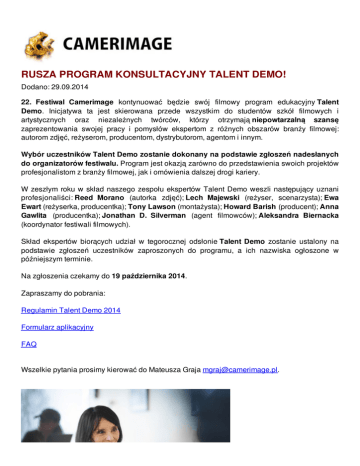 RUSZA PROGRAM KONSULTACYJNY TALENT DEMO! Dodano: 29.09.2014 22. Festiwal Camerimage kontynuować będzie swój filmowy program edukacyjny Talent Demo. Inicjatywa ta jest skierowana przede wszystkim do studentów szkół filmowych i artystycznych oraz niezależnych twórców, którzy otrzymają niepowtarzalną szansę zaprezentowania swojej pracy i pomysłów ekspertom z różnych obszarów branży filmowej: autorom zdjęć, reżyserom, producentom, dystrybutorom, agentom i innym. Wybór uczestników Talent Demo zostanie dokonany na podstawie zgłoszeń nadesłanych do organizatorów festiwalu. Program jest okazją zarówno do przedstawienia swoich projektów profesjonalistom z branży filmowej, jak i omówienia dalszej drogi kariery. W zeszłym roku w skład naszego zespołu ekspertów Talent Demo weszli następujący uznani profesjonaliści: Reed Morano (autorka zdjęć); Lech Majewski (reżyser, scenarzysta); Ewa Ewart (reżyserka, producentka); Tony Lawson (montażysta); Howard Barish (producent); Anna Gawlita (producentka); Jonathan D. Silverman (agent filmowców); Aleksandra Biernacka (koordynator festiwali filmowych). Skład ekspertów biorących udział w tegorocznej odsłonie Talent Demo zostanie ustalony na podstawie zgłoszeń uczestników zaproszonych do programu, a ich nazwiska ogłoszone w późniejszym terminie. Na zgłoszenia czekamy do 19 października 2014. Zapraszamy do pobrania: Regulamin Talent Demo 2014 Formularz aplikacyjny FAQ Wszelkie pytania prosimy kierować do Mateusza Graja [email protected]. Ewa Ewart, Talent Demo 2014, zdj. Ewelina Kamińska Z największą przyjemnością przedstawiamy Wam nową, pozakonkursową sekcję na Międzynarodowym Festiwalu Filmowym Camerimage – TALENT DEMO SHOWCASE! Zdaliśmy sobie sprawę z tego, że warto by umożliwić uczestnikom naszego programu Talent Demo zaprezentowanie swoich filmowych projektów szerszej publiczności. Cieszy nas niezmiernie fakt, że to po części dzięki temu programowi właśnie udało im się ukończyć to co sobie założyli i bardzo chętnie wesprzemy ich ponownie, pokazując ich filmy naszej międzynarodowej publiczności. Sekcję Talent Demo Showcase zainauguruje krótkometrażowy film Catch w reżyserii Jeremy Glaholta. Poniżej przedstawiamy więcej informacji na temat tego projektu, Jeremy podzieli się swoim doświadczeniem z Talent Demo, a na koniec zapraszamy na zwiastun Catch! *** Jeremy napisał scenariusz, wyprodukował i wyreżyserował Catch w okresie gdy z Los Angeles tymczasowo przeprowadził się do Berlina. Zainspirowany nowym otoczeniem, dał się wówczas uwieść bardziej minimalistycznemu podejściu do sztuki filmowej, dzięki któremu łatwiej było stworzyć wrażenie intymności. Mniejsza ekipa filmowa i przyjazne relacje umożliwiły aktorom głębsze poznanie swoich postaci i podjęcie większego ryzyka. Wkrótce po zakończeniu zdjęć Glaholt został zaproszony do wzięcia udziału w programie Talent Demo na festiwalu Camerimage 2012. Podczas spotkania ze słynnym montażystą Alanem Heimem, ekspertem Talent Demo, Jeremy zapytał go o to w jaki sposób w tak krótkim czasie złożyć w całość dość rozbudowaną opowieść z niewielką ilością dialogów. Alan zaproponował by punktem wyjścia stał się wstępnie zmontowany materiał głównego wątku fabularnego. Wokół niego można będzie wówczas zbudować całą historię. Prócz porady Alan zaoferował również swój osobisty adres e-mail, by Jeremy miał możliwość skontaktować się z nim w przypadku dowolnych pytań. Jeremy: „Jednym z powodów, dla których ten festiwal jest tak wyjątkowy jest fakt, iż wszyscy tutaj jesteśmy wobec siebie równi. Bez względu na status i sławę osób biorących udział w Camerimage, wszyscy jesteśmy filmowcami, których przyciąga na ten festiwal zamiłowanie do rzemiosła. Robienie filmów to wspólny wysiłek. Ogromna pomoc jaką uzyskałem od pana Heima i jego współpracowników była niezbędna dla pomyślnego ukończenia Catch”. www.catchthemovie.com/ Zwiastun Catch można obejrzeć TUTAJ.