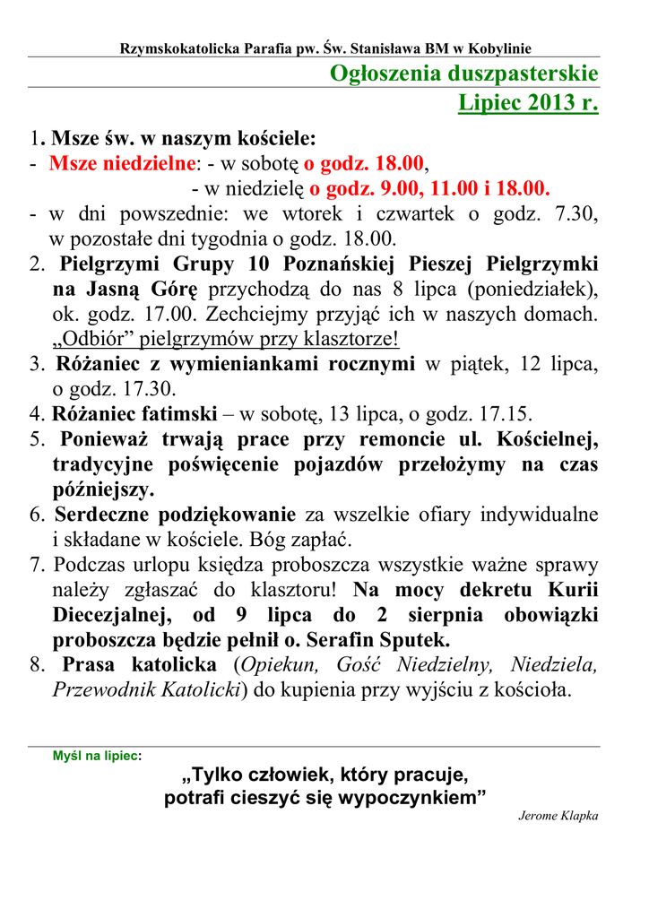 Ogłoszenia duszpasterskie Lipiec 2013 r. - Kobylin