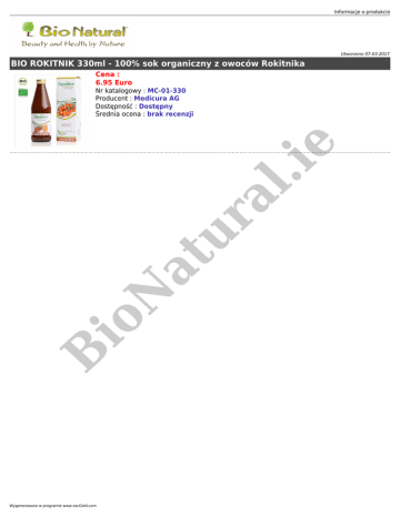 Informacje o produkcie Utworzono 07-03-2017 BIO ROKITNIK 330ml - 100% sok organiczny z owoców Rokitnika Cena : 6.95 Euro B io N at ur al .ie Nr katalogowy : MC-01-330 Producent : Medicura AG Dostępność : Dostępny Średnia ocena : brak recenzji Wygenerowano w programie www.oscGold.com Organiczny sok z owoców Rokitnika - 100% czystego soku, wyciskanego z owoców pochodzących z certyfikowanych upraw ekologicznych. BIO ROKITNIK Cytryna północy. Pomarańczowo czerwone, bardzo kwaśne owoce krzewu rokitnika zwyczajnego znane są, oprócz owoców dzikiej róży, jako najlepsze tutejsze źródło witaminy C. Ponieważ ze względu na występujący w nich kwas praktycznie nie nadają się do spożycia na surowo, przerabia się je na soki, syropy i marmolady. Zdrowotne oddziaływanie rokitnika nie wywodzi się jedynie z dużej zawartości witaminy C, lecz przede wszystkim z obecności działających antyoksydacyjnie flawonoidów i karotenoidów. Żaden tutejszy owoc nie prześcignie rokitnika pod względem zawartości witaminy C. W zależności od gatunku owoce rokitnika zawierają między 200 do 900 mg witaminy C w ok. 100 g owoców. Oznacza to, że przeciętna zawartość tej witaminy w 50 g owoców wielokrotnie przekracza zawartość tego mikroelementu w cytrynach i pomarańczach. W związku z tym rokitnik świetnie nadaje się do zapobiegawczego wspierania systemu odpornościowego jesienią i zimą. Rokitnik zawiera duże ilości flawonoidów (kwercetyna i rutyna) oraz karotenoidów (głownie B-karoten). Owoce rokitnika zawierają witaminę młodości E, i witaminę C, którą zachowują nawet podczas przechowywania i przetwarzania, bo jagody nie zawierają niszczącego ją enzymu askorbinazy. Owoce wykorzystywane do produkcji soku pochodzą z certyfikowanych upraw ekologicznych. Zawartość: 330ml w butelce szklanej. Działanie: Zdrowotne działanie rokitnika to nie tylko bogactwo witaminy C, ale również antyoksydacyjnie działające flavonoidy i karotenoidy. Wzmacnia organizm, uodparnia, opóźnia procesy starzenia, reguluje pracę układów krwionośnego, pokarmowego i oddechowego, chroni skórę przed szkodliwym promieniowaniem. Skład: Wartości odżywcze: Wartość energetyczna w 100 ml w 30 ml 49,8 kJ/11,7 Kcal 166 kJ/39 Kcal Proteiny 0,8 g 4g - w tym cukier 4g Tłuszcz Błonnik Jednostka chlebowa 1,2 g 1,2 g 1g 0,3 g < 0,5 g < 0,15 g 0,33 < 0,1 ur Powyższe wartości mogą nieznacznie odbiegać ze względu na naturalne pochodzenie surowca. 0,24 g al Węglowodany Sposoby stosowania .ie 100% organiczny sok z owoców Rokitnika (Hippophae rhamnoides), bez dodatku cukru, sztucznych barwników i konserwantów. Wyciskany z owoców pochodzących z certyfikowanych upraw ekologicznych. Pić 2 x 25 ml dziennie, czystego soku lub rozcieńczonego z wodą lub innym sokiem. Przed użyciem wstrząsnąć. Po otwarciu trzymać w chłodnym miejscu, spożyć w krótkim czasie. N at Dodatkowe informacje na temat właściwości Rokitnika Rokitnik pokrojem i barwą przypomina wierzbę, a jego wąskie, srebrzyste liście na wietrze wydają się migotać. Jesienią szczególnie pięknie wyglądają okazy żeńskie pokryte pomarańczowymi jagodami, które długo pozostają na gałązkach. Krzewy wytrzymują zasolenie i zanieczyszczenie środowiska. Dzięki rozłogom tworzą gęste, trudne do przebycia zarośla. Rokitnik służy też jako pasza dla koni aby ich sierść była gęsta i lśniąca. Samo zdrowie Miano "złota Syberii" rokitnik zawdzięcza nie tyle barwie jagód, co wielkiej wartości leczniczej i odżywczej, cennej szczególnie w trudnych warunkach klimatycznych. Właściwości medyczne owoców, liści i kory rośliny znane są od starożytności. Od wieków posługuje się nimi np. medycyna tybetańska. Podczas I wojny światowej suszone owoce zastępowały syntetyczną witaminę C. io Współczesna medycyna korzysta z rokitnika w leczeniu chorób przewodu pokarmowego, krwotoków, zapalenia płuc i stawów, gośćca, wysokiego ciśnienia. Olej rokitnikowy podawano rosyjskim kosmonautom jako suplement i ochronę przed promieniowaniem. Stwierdzono, że wzmacnia system odpornościowy, działa przeciwmiażdżycowo, stymuluje procesy regeneracji u rekonwalescentów, także przy radioterapii. Hamuje procesy starzenia się skóry, leczy odmrożenia, oparzenia, odleżyny, wrzody. Rokitnik jest też składnikiem kremów przeciwzmarszczkowych, szamponów i pomadek do ust. Jest tak delikatny, że używa się go do zabezpieczania cennych precyzyjnych urządzeń. Rokitnik zawiera duże ilości flawonoidów (kwercetyna i rutyna) oraz karotenoidów (głównie B-karoten). Owoce rokitnika zawierają "witaminę młodości" - E, i witaminę C, którą zachowują nawet podczas przechowywania i przetwarzania, bo jagody nie zawierają niszczącego ją enzymu askorbinazy. B INFORMACJE DODATKOWE Organiczne soki Medicura - zdrowy początek dnia Charakteryzując w pełni znaczenie słowa "zdrowie", mówimy o stanie całkowitej sprawności fizycznej i psychicznej oraz komfortu społecznego, a nie tylko o braku choroby lub niepełnosprawności. (Światowa Organizacja Zdrowia) Aby wesprzeć twoje dobre samopoczucie oraz ogólną kondycję fizyczną i psychiczną, firma Medicura Naturprodukte AG, postanowiła wprowadzić na rynek szereg odżywczych soków organicznych produkowanych z kontrolowanych upraw owoców egzotycznych. Ta ekologiczna linia spełnia oczekiwania konsumentów poszukujących wysokiej jakości naturalnych produktów o właściwościach prozdrowotnych. Ludzie chcą wiedzieć, skąd pochodzą produkty, które spożywają każdego dnia. Oczekują przejrzystych i czytelnych zasad wprowadzania produktów do obrotu, gwarantujących najwyższą jakość i czystość produktów spożywczych. Jednocześnie oczekują produktów zasobnych w składniki odżywcze, gwarantujące należyte zaspokojenie organizmu w potrzebne dla zachowania zdrowia i urody witaminy i minerały. Lista produktów, które dają obietni