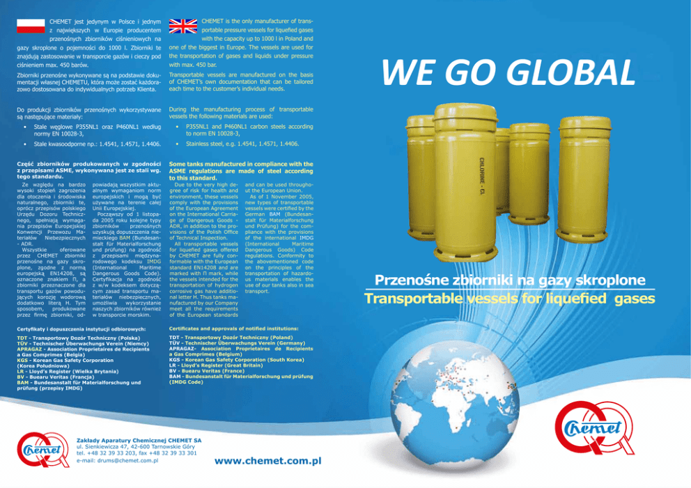 CHEMET jest jedynym w Polsce i jednym z największych w Europie producentem przenośnych zbiorników ciśnieniowych na gazy skroplone o pojemności do 1000 l. Zbiorniki te znajdują zastosowanie w transporcie gazów i cieczy pod ciśnieniem max. 450 barów. CHEMET is the only manufacturer of transportable pressure vessels for liquefied gases with the capacity up to 1000 l in Poland and one of the biggest in Europe. The vessels are used for the transportation of gases and liquids under pressure with max. 450 bar. Zbiorniki przenośne wykonywane są na podstawie dokumentacji własnej CHEMETU, która może zostać każdorazowo dostosowana do indywidualnych potrzeb Klienta. Transportable vessels are manufactured on the basis of CHEMET’s own documentation that can be tailored each time to the customer’s individual needs. Do produkcji zbiorników przenośnych wykorzystywane są następujące materiały: During the manufacturing process of transportable vessels the following materials are used: • Stale węglowe P355NL1 oraz P460NL1 według normy EN 10028-3, • P355NL1 and P460NL1 carbon steels according to norm EN 10028-3, • Stale kwasoodporne np.: 1.4541, 1.4571, 1.4406. • Stainless steel, e.g. 1.4541, 1.4571, 1.4406. WE GO GLOBAL Część zbiorników produkowanych w zgodności z przepisami ASME, wykonywana jest ze stali wg. tego standardu. Ze względu na bardzo wysoki stopień zagrożenia dla otoczenia i środowiska naturalnego, zbiorniki te, oprócz przepisów polskiego Urzędu Dozoru Technicznego, spełniają wymagania przepisów Europejskiej Konwencji Przewozu Materiałów Niebezpiecznych - ADR. Wszystkie oferowane przez CHEMET zbiorniki przenośne na gazy skroplone, zgodne z normą europejską EN14208, są oznaczone znakiem Π, a zbiorniki przeznaczone dla transportu gazów powodujących korozję wodorową dodatkowo literą H. Tym sposobem, produkowane przez firmę zbiorniki, od- powiadają wszystkim aktualnym wymaganiom norm europejskich i mogą być używane na terenie całej Unii Europejskiej. Począwszy od 1 listopada 2005 roku kolejne typy zbiorników przenośnych uzyskują dopuszczenia niemieckiego BAM (Bundesanstalt für Materialforschung und prüfung) na zgodność z przepisami międzynarodowego kodeksu IMDG (International Maritime Dangerous Goods Code). Certyfikacja na zgodność z w/w kodeksem dotyczącym zasad transportu materiałów niebezpiecznych, umożliwia wykorzystanie naszych zbiorników również w transporcie morskim. Some tanks manufactured in compliance with the ASME regulations are made of steel according to this standard. Due to the very high degree of risk for health and environment, these vessels comply with the provisions of the European Agreement on the International Carriage of Dangerous Goods ADR, in addition to the provisions of the Polish Office of Technical Inspection. All transportable vessels for liquefied gases offered by CHEMET are fully conformable with the European standard EN14208 and are marked with Π mark, while the vessels intended for the transportation of hydrogen corrosive gas have additional letter H. Thus tanks manufactured by our Company meet all the requirements of the European standards and can be used throughout the European Union. As of 1 November 2005, new types of transportable vessels were certified by the German BAM (Bundesanstalt für Materialforschung und Prüfung) for the compliance with the provisions of the international IMDG (International Maritime Dangerous Goods) Code regulations. Conformity to the abovementioned code on the principles of the transportation of hazardous materials enables the use of our tanks also in sea transport. Certyfikaty i dopuszczenia instytucji odbiorowych: Certificates and approvals of notified institutions: TDT - Transportowy Dozór Techniczny (Polska) TÜV - Technischer Überwachungs Verein (Niemcy) APRAGAZ - Association Proprietaires de Recipients a Gas Comprimes (Belgia) KGS - Korean Gas Safety Corporation (Korea Południowa) LR - Lloyd’s Register (Wielka Brytania) BV - Buearu Veritas (Francja) BAM - Bundesanstalt für Materialforschung und prüfung (przepisy IMDG) TDT - Transportowy Dozór Techniczny (Poland) TÜV - Technischer Überwachungs Verein (Germany) APRAGAZ- Association Proprietaires de Recipients a Gas Comprimes (Belgium) KGS - Korean Gas Safety Corporation (South Korea) LR - Lloyd’s Register (Great Britain) BV - Buearu Veritas (France) BAM - Bundesanstalt für Materialforschung und prüfung (IMDG Code) Zakłady Aparatury Chemicznej CHEMET SA ul. Sienkiewicza 47, 42-600 Tarnowskie Góry tel. +48 32 39 33 203, fax +48 32 39 33 301 e-mail: [email protected] www.chemet.com.pl Przenośne zbiorniki na gazy skroplone Transportable vessels for liquefied gases Nasza oferta Our offer Zbiorniki poziome Horizontal tanks Zbiorniki poziome zaprojektowane są do użytkowania w pozycji horyzontalnej. Horizontal tanks are designed for use in a horizontal position. Dodatkowo mogą zostać zaopatrzone w palety do transportu wózkiem widłowym lub zawieszone w ramach. Additionally, they can be provided with pallets to be handled by a forklift, or suspended in frames (see optional fittings). Podstawowe typy zbiorników poziomych to: The basic types of horizontal tanks are: • zbiornik chlorowy o ciśnieniach próbnych 22 barów, 33 barów, 45 barów – w zależności od strefy klimatycznej, w której zbiornik będzie pracował, • a chlorine tank for test pressures of 22 bar, 33 bar, 45 bar - depending on the climatic zone in which the tank will be operated, • zbiornik na środki chłodnicze o ciśnieniach do 51 barów, • a tank for refrigerants with pressures up to 51 bar, • a tank for gases with pressure higher than 51 bar (SF6, HBr), • a tank for hydrogen chloride. • zbiornik na gazy o ciśnieniu wyższym niż 51 barów (SF6, HBr), • zbiornik przeznaczony na chlorowodór. Zbiorniki kuliste Spherical tanks W celu zredukowania masy zbiorników wysokociśnieniowych, CHEMET w