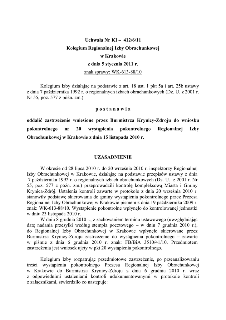 Uchwała Nr KI – 412/6/11 Kolegium Regionalnej Izby Obrachunkowej w Krakowie z dnia 5 stycznia 2011 r. znak sprawy: WK-613-88/10 Kolegium Izby działając na podstawie z art. 18 ust. 1 pkt 5a i art. 25b ustawy z dnia 7 października 1992 r. o regionalnych izbach obrachunkowych (Dz. U. z 2001 r. Nr 55, poz. 577 z późn. zm.) postanawia oddalić zastrzeżenie wniesione przez Burmistrza Krynicy-Zdroju do wniosku pokontrolnego nr 20 wystąpienia pokontrolnego Regionalnej Izby Obrachunkowej w Krakowie z dnia 15 listopada 2010 r. UZASADNIENIE W okresie od 28 lipca 2010 r. do 20 września 2010 r. inspektorzy Regionalnej Izby Obrachunkowej w Krakowie, działając na podstawie przepisów ustawy z dnia 7 października 1992 r. o regionalnych izbach obrachunkowych (Dz. U. z 2001 r. Nr 55, poz. 577 z późn. zm.) przeprowadzili kontrolę kompleksową Miasta i Gminy Krynica-Zdrój. Ustalenia kontroli zawarte w protokole z dnia 20 września 2010 r. stanowiły podstawę skierowania do gminy wystąpienia pokontrolnego przez Prezesa Regionalnej Izby Obrachunkowej w Krakowie pismem z dnia 19 października 2009 r. znak: WK-613-88/10. Wystąpienie pokontrolne wpłynęło do kontrolowanej jednostki w dniu 23 listopada 2010 r. W dniu 8 grudnia 2010 r., z zachowaniem terminu ustawowego (uwzględniając datę nadania przesyłki według stempla pocztowego – w dniu 7 grudnia 2010 r.), do Regionalnej Izby Obrachunkowej w Krakowie wpłynęło skierowane przez Burmistrza Krynicy-Zdroju zastrzeżenie do wystąpienia pokontrolnego – zawarte w piśmie z dnia 6 grudnia 2010 r. znak: FB/BiA 3510/41/10. Przedmiotem zastrzeżenia jest wniosek ujęty w pkt 20 wystąpienia pokontrolnego. Kolegium Izby rozpatrując przedmiotowe zastrzeżenie, po przeanalizowaniu treści wystąpienia pokontrolnego Prezesa Regionalnej Izby Obrachunkowej w Krakowie do Burmistrza Krynicy-Zdroju z dnia 6 grudnia 2010 r. wraz z odpowiednimi ustaleniami kontroli udokumentowanymi w protokole kontroli z załącznikami, stwierdziło co następuje: Wniosek pokontrolny nr 20 brzmiał: Realizowanie uchwał Rady Miejskiej w Krynicy-Zdroju w sprawie wydatków, które nie wygasają z upływem roku budżetowego, zgodnie z postanowieniami art. 263 ust. 6 i ust. 7 ustawy z dnia 27 sierpnia 2009 r. o finansach publicznych (Dz.U. Nr 157 poz. 1240 z późn.zm.) w szczególności w zakresie gromadzenia środków finansowych na ww. wydatki na wyodrębnionym subkoncie podstawowego rachunku bankowego Gminy oraz terminowego przekazywania na dochody budżetu Gminy środków finansowych niewykorzystanych w terminie określonym przez Radę Miejską. Powyższy wniosek został sformułowany w związku ze stwierdzonymi w wyniku kontroli nieprawidłowościami przedstawionymi w „opisie nieprawidłowości do wniosku pokontrolnego nr 20”, polegającymi na nieprzestrzeganiu w 2010 r. w toku realizacji uchwały Nr XLV/321/09 Rady Miejskiej w Krynicy-Zdroju z dnia 30 grudnia 2009 r. w sprawie ustalenia wykazu wydatków, które nie wygasają z upływem roku budżetowego, unormowania art. 263 ustawy z dnia 27 sierpnia 2009 r. o finansach publicznych, poprzez: 1) przekazanie w 2010 r. środków finansowych przeznaczonych na wydatki niewygasające łącznie w kwocie 9.680.000 zł., na lokatę terminową w AIG BANK POLSKA S.A. we Wrocławiu utworzoną na podstawie umowy lokaty z dnia 5 stycznia 2010 r., która ulegała w związku z realizacją poszczególnych wydatków stopniowemu zmniejszeniu, a ostatecznie w dniu 19 lipca 2010 r. została zlikwidowana i środki w kwocie 4.600.000 zł. przekazano na wyodrębnione dla wydatków niewygasających subkonto podstawowego rachunku bankowego, 2) nieterminowe przekazywanie na dochody budżetu gminy w 2010 r. środków finansowych niewykorzystanych na wydatki niewygasające z 2009 r. – wbrew uregulowaniu art. 263 ust. 7 ustawy o finansach publicznych, gdyż z ogólnej kwoty podlegających zwrotowi środków w wysokości 7.748.886,64 zł., zwrócono tylko 353.755,84 zł. w wymaganym wyżej powołanym przepisem 7 – dniowym terminie od dnia określonego przez Radę Miejską na realizację poszczególnych wydatków niewygasających, a pozostała kwota 7.395.130,80 zł. została zwrócona w okresie od 10 do 20 dni po upływie ustawowego terminu. Wnoszący zastrzeżenia do wniosku pokontrolnego nr 20 w części związanej z pierwszą sprawą przedstawioną w opisie nieprawidłowości, zarzucił kontrolującemu nieprawidłową wykładnię art. 263 ust. 6 ustawy o finansach publicznych, zgodnie z którym środki finansowe na wydatki ujęte w wykazie wydatków, które nie wygasają z upływem roku budżetowego, są gromadzone na wyodrębnionym subkoncie podstawowego rachunku bankowego jednostki samorządu terytorialnego. W uzasadnieniu zastrzeżeń, wskazując na przepis art. 264 ust. 3 wyżej powołanej ustawy, umożliwiający udzielenie zarządowi jednostki samorządu terytorialnego przez organ stanowiący tej jednostki, upoważnienia do lokowania wolnych środków budżetowych na rachunkach w innych bankach stwierdzono, że trudno jest uznać „(…) iż środki niewygasające, które do momentu dokonania zapłaty zobowiązania, lub ich zwrotu do budżetu, nie są wolnymi środkami budżetowymi”. Zdaniem wnoszącego 2 zastrzeżenia, fakt powiązania tych środków z określonymi wydatkami nie zmienia istoty i do czasu dokonania wydatku są one środkami wolnymi, które mając na uwadze zasadę gospodarności, nie tylko można, ale wręcz należy lokować. Jak poinformowano, z tytułu dokonania przedmiotowych lokat budżet gminy uzyskał dodatkowe dochody w kwocie 207.275,48 zł. W drugiej sprawie przedstawionej w opisie nieprawidłowości, wnoszący zastrzeżenia zakwestionował zastosowanie do wydatków niewygasających z 2009 r. obowiązku zwrotu niewykorzystanych środków w terminie siedmiu dni wyznaczonym ustawą z dnia 27 sierpnia 2009 r. o finansach publicznych, gdyż jego zdaniem należało stosować zasady wynikające ze stan