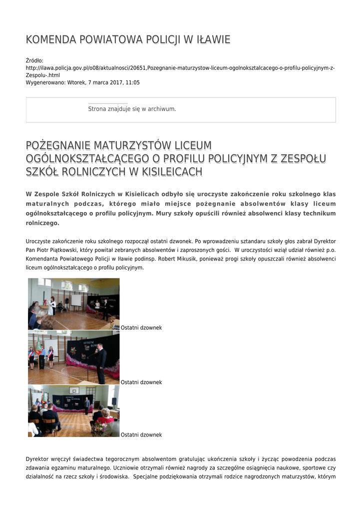 KOMENDA POWIATOWA POLICJI W IŁAWIE Źródło: http://ilawa.policja.gov.pl/o08/aktualnosci/20651,Pozegnanie-maturzystow-liceum-ogolnoksztalcacego-o-profilu-policyjnym-zZespolu-.html Wygenerowano: Wtorek, 7 marca 2017, 11:05 Strona znajduje się w archiwum. POŻEGNANIE MATURZYSTÓW LICEUM OGÓLNOKSZTAŁCĄCEGO O PROFILU POLICYJNYM Z ZESPOŁU SZKÓŁ ROLNICZYCH W KISILEICACH W Zespole Szkół Rolniczych w Kisielicach odbyło się uroczyste zakończenie roku szkolnego klas maturalnych podczas, którego miało miejsce pożegnanie absolwentów klasy liceum ogólnokształcącego o profilu policyjnym. Mury szkoły opuścili również absolwenci klasy technikum rolniczego. Uroczyste zakończenie roku szkolnego rozpoczął ostatni dzwonek. Po wprowadzeniu sztandaru szkoły głos zabrał Dyrektor Pan Piotr Piątkowski, który powitał zebranych absolwentów i zaproszonych gości. W uroczystości wziął udział również p.o. Komendanta Powiatowego Policji w Iławie podinsp. Robert Mikusik, ponieważ progi szkoły opuszczali również absolwenci liceum ogólnokształcącego o profilu policyjnym. Ostatni dzownek Ostatni dzownek Ostatni dzownek Dyrektor wręczył świadectwa tegorocznym absolwentom gratulując ukończenia szkoły i życząc powodzenia podczas zdawania egzaminu maturalnego. Uczniowie otrzymali również nagrody za szczególne osiągnięcia naukowe, sportowe czy działalność na rzecz szkoły i środowiska. Specjalne podziękowania otrzymali rodzice nagrodzonych maturzystów, którym Dyrektor szkoły wręczył listy gratulacyjne. Ostatni dzownek Ostatni dzownek Ostatni dzownek Do życzeń i gratulacji przyłączył się również podinsp. Robert Mikusik. Jak podkreślił, przed kończącymi szkołę jeszcze wiele życiowych wyborów, matura i być może służba w formacjach mundurowych. Wielu planuje przystąpić do rekrutacji w Policji. Komendant przekazał życzenia powodzenia podczas matury oraz udanych wakacji. Jak dodał Dyrektor Zespołu Szkół Rolniczych w Kisielicach Pan Piotr Piątkowski, przed absolwentami nowe wyzwania, związane z dorosłym już życiem - pierwsze z nich to właśnie egzamin maturalny. Wszystkim maturzystom życzymy powodzenia i wielu sukcesów ! Zainstaluj wtyczkę Flash, aby zobaczyć odtwarzacz. pobierz film - 6.04 MB Ocena: 0/5 (0) Tweetnij liceum ogólnokształcące o profilu policyjnym, Zespół Szkół Rolniczych w Kisielicach, pożegnanie maturzystów